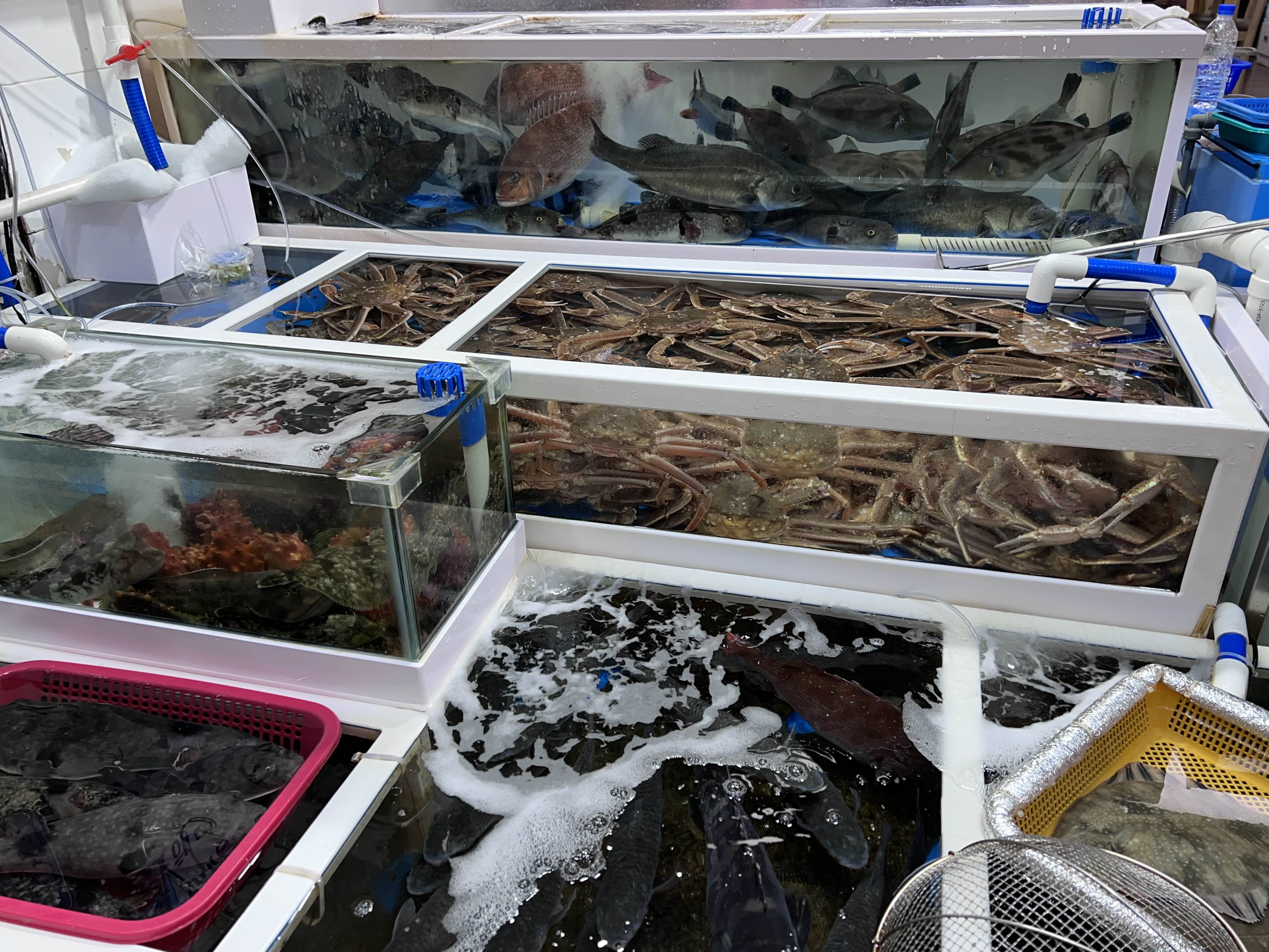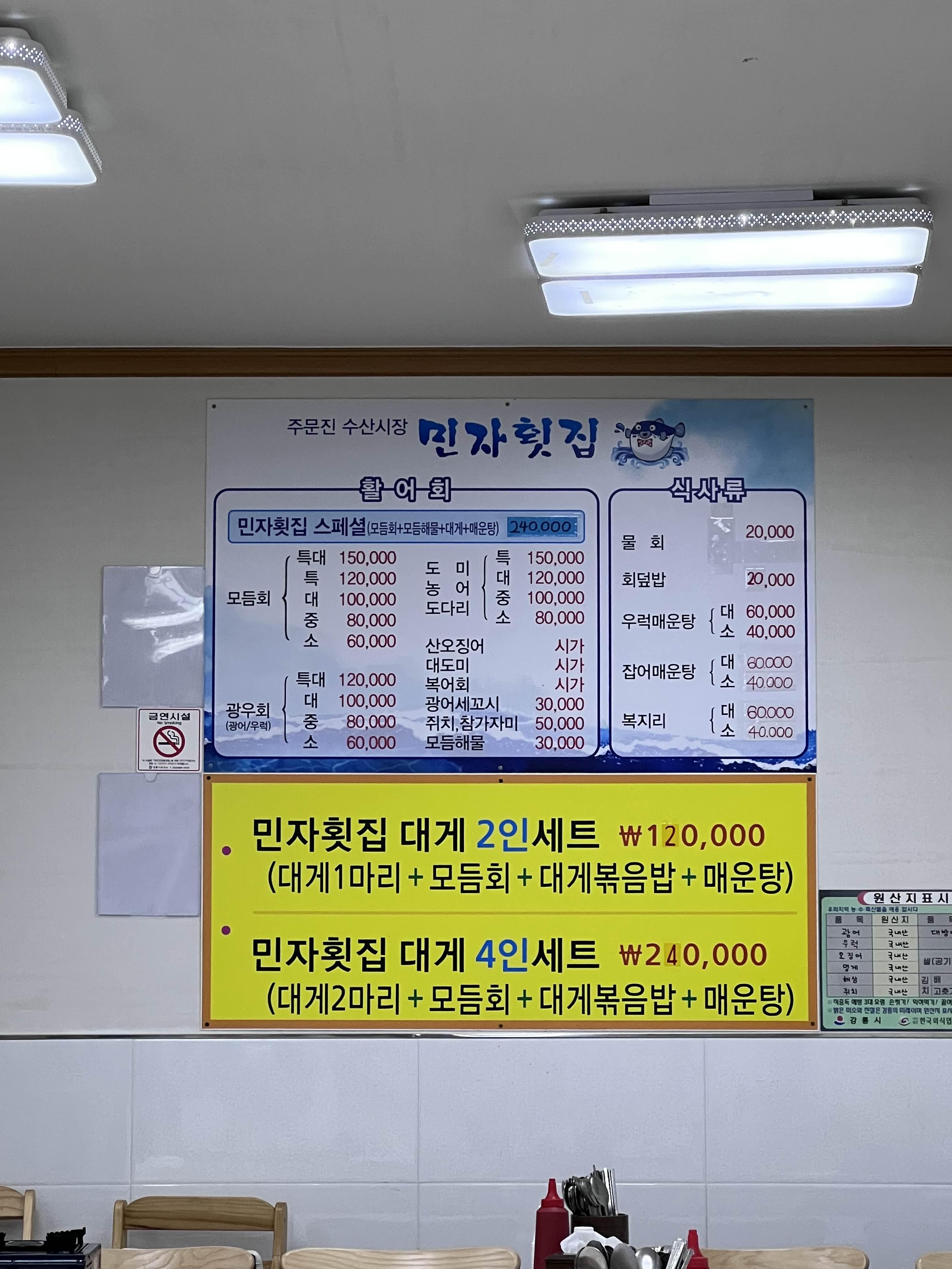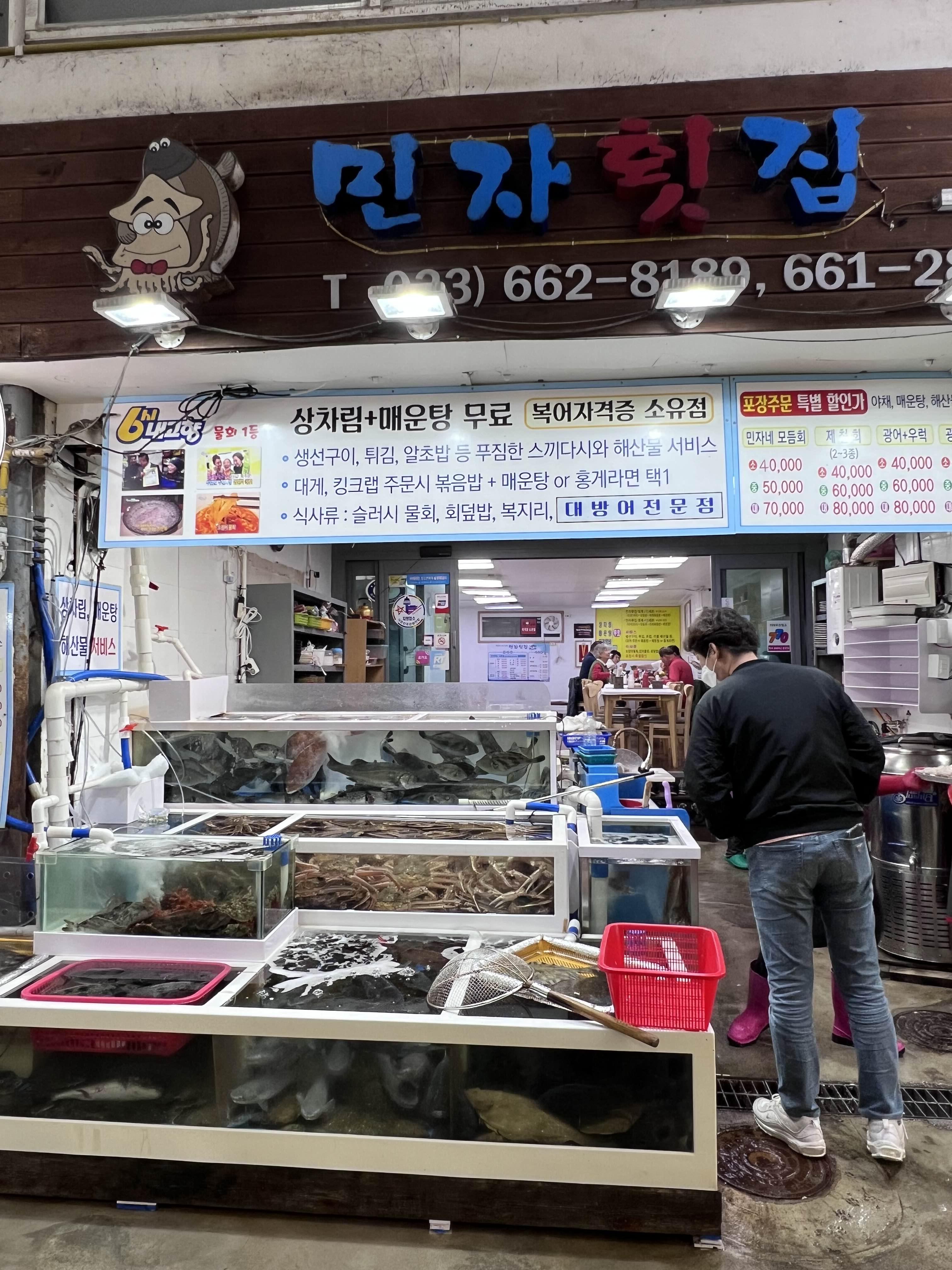 수산시장도 많이 정리가 된 느낌이라 빨리 서둘러서 사야 할 것 같았어요. 근데 어디가 좋은지 몰라서 여기저기 물어보니 어느 집은 모둠회에 2종류(밀치/광어/도다리 중 선택 2)인 곳도 있고 어느 곳은 4종류를 주시는 집도 있었어요. 그래서 저희는 4종류를 주는 민자횟집으로 선택했어요. 아주머니가 서비스로 멍게/참소라/새우 등도 주신다고 해서 바로 콜! 외쳤습니다.