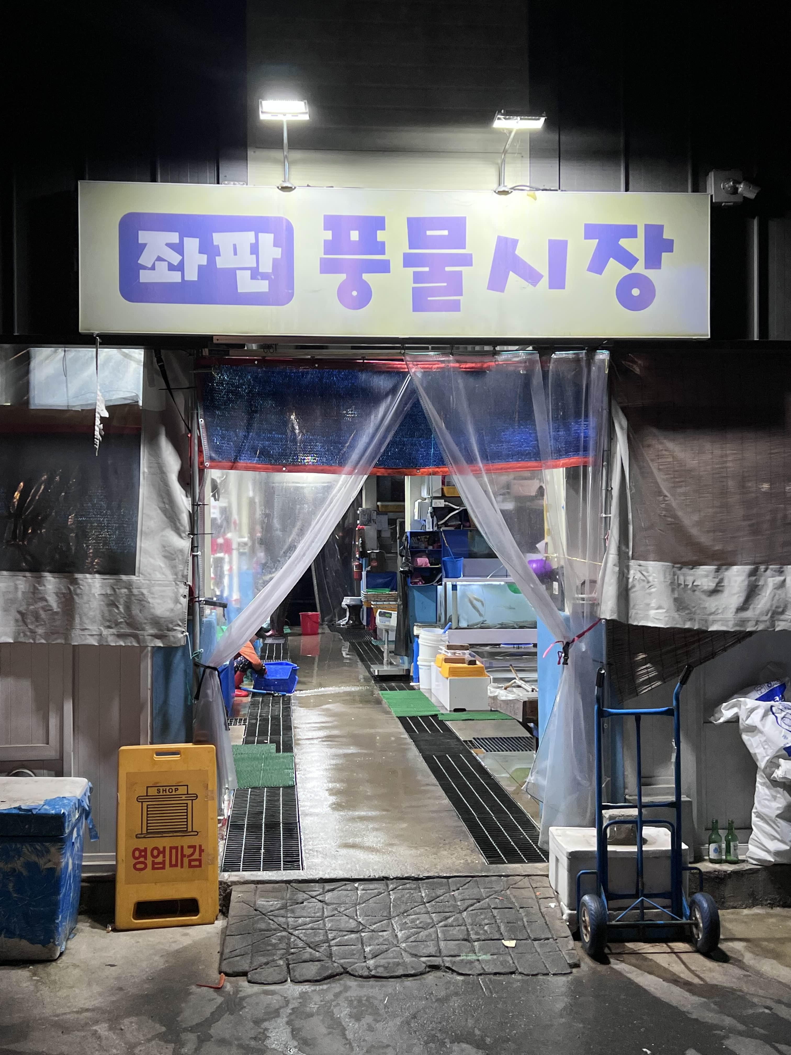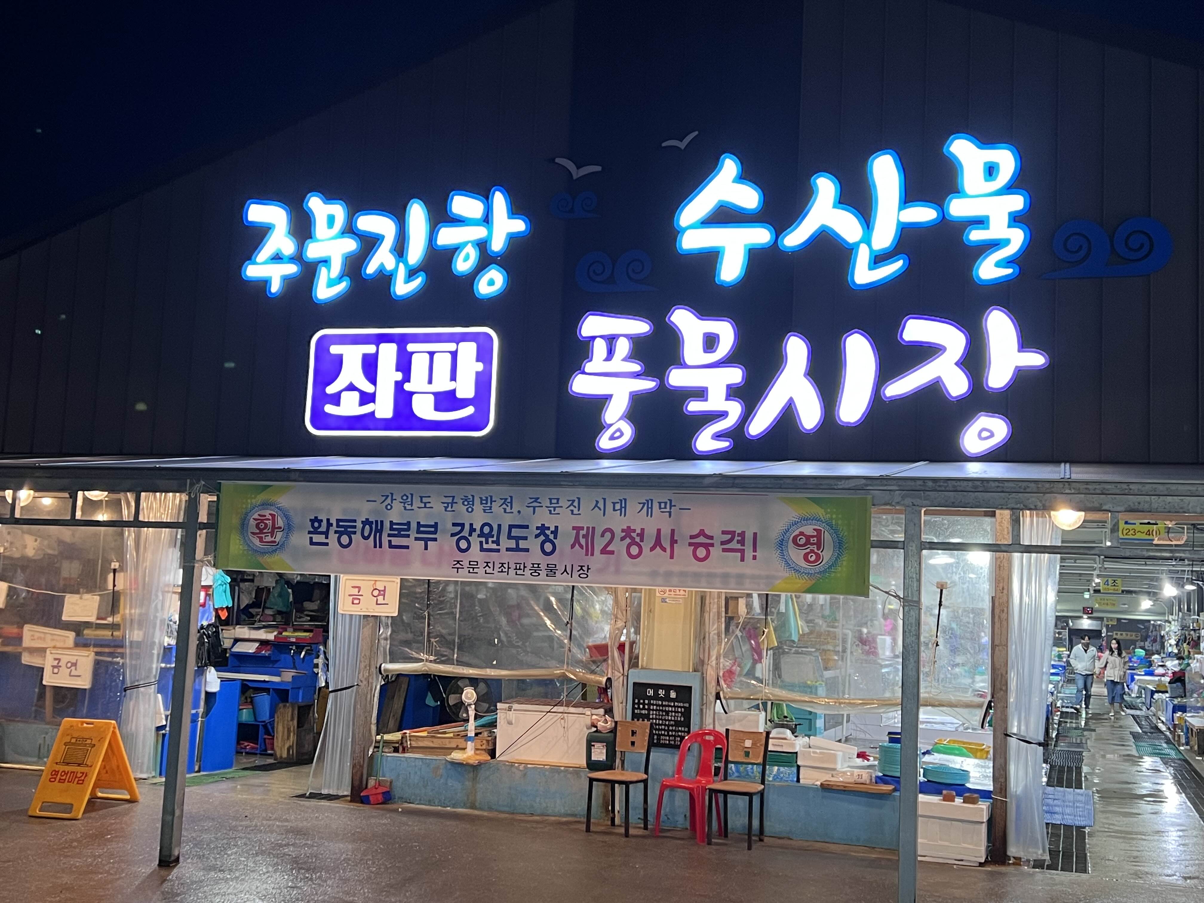 양양에서 캠핑을 하다가 회가 먹고 싶어서 주문진으로 회포장하러 왔습니다. 원래는 좌판 풍물시장에서 사려고 했습니다. 좌판에 고기들이 올려져 있고, 싸게 살 수 있어서 직접 보고 고르려고 했는데 7시에 도착했는데 다 정리하고 없었습니다. 좌판 풍물시장에 가시려면 낮에 가서 드시는 게 좋겠습니다. ㅠ 다음에는 일찍 가서 좌판에서 골라서 바로 회를 먹어보겠습니다.