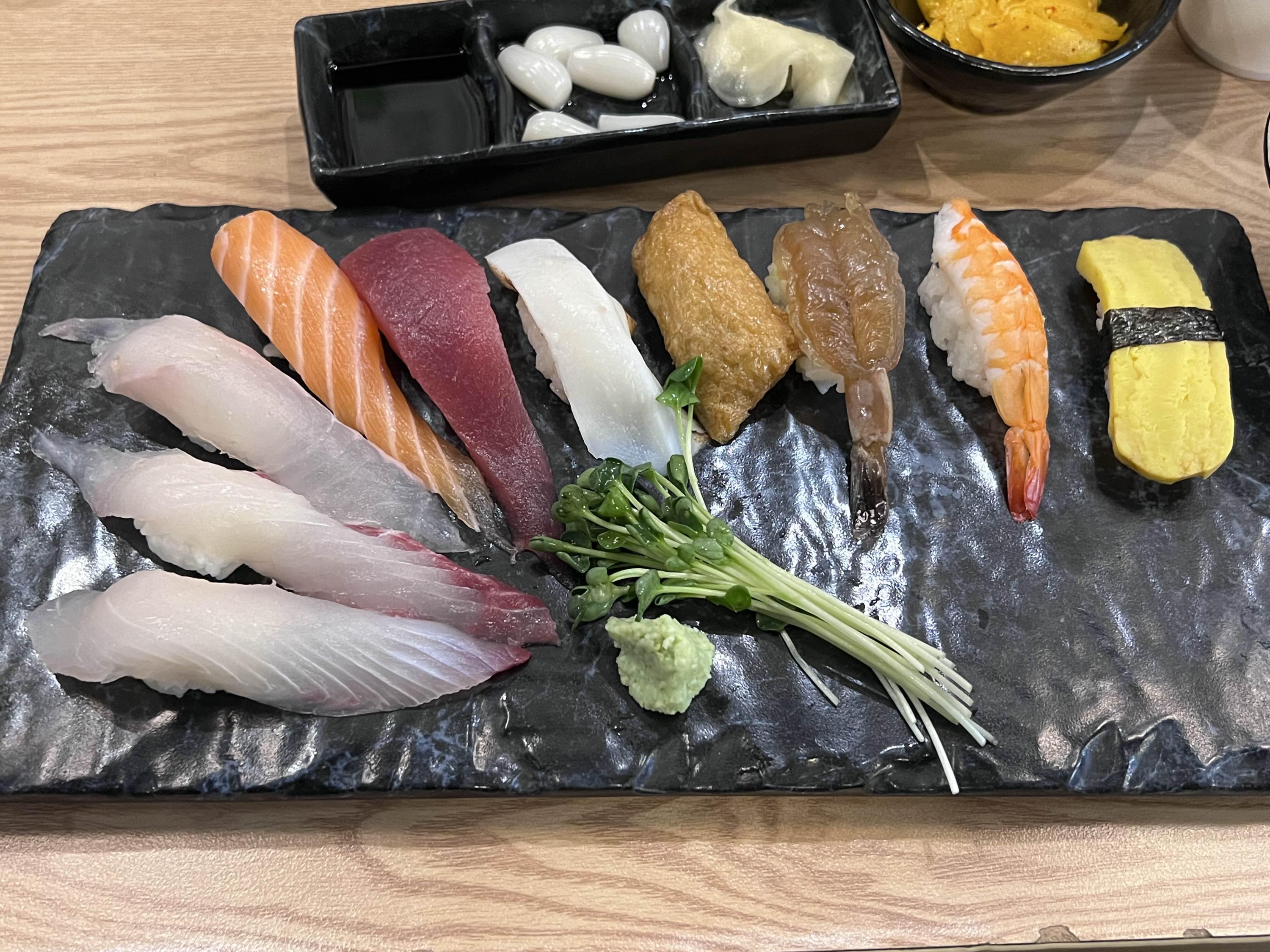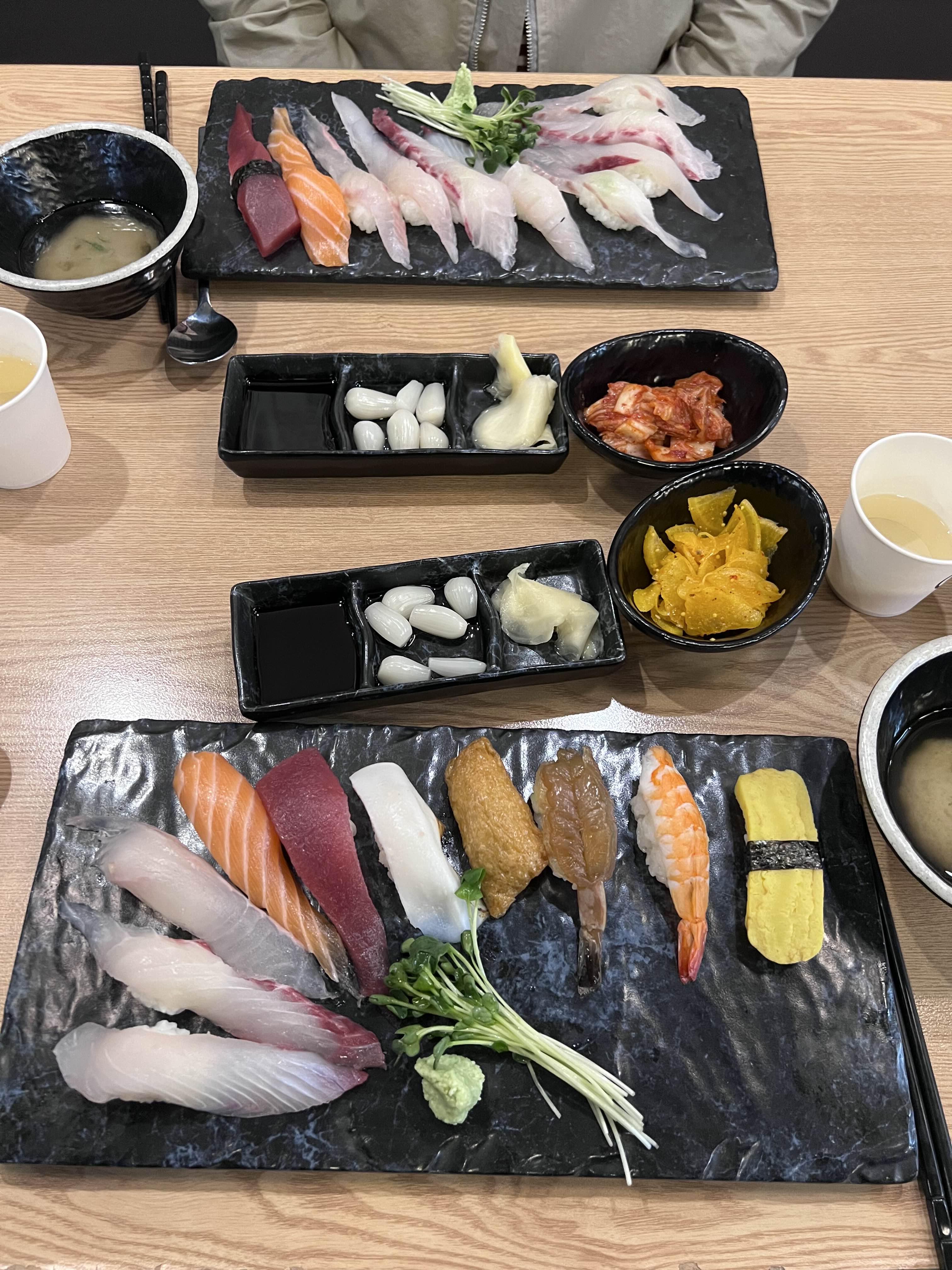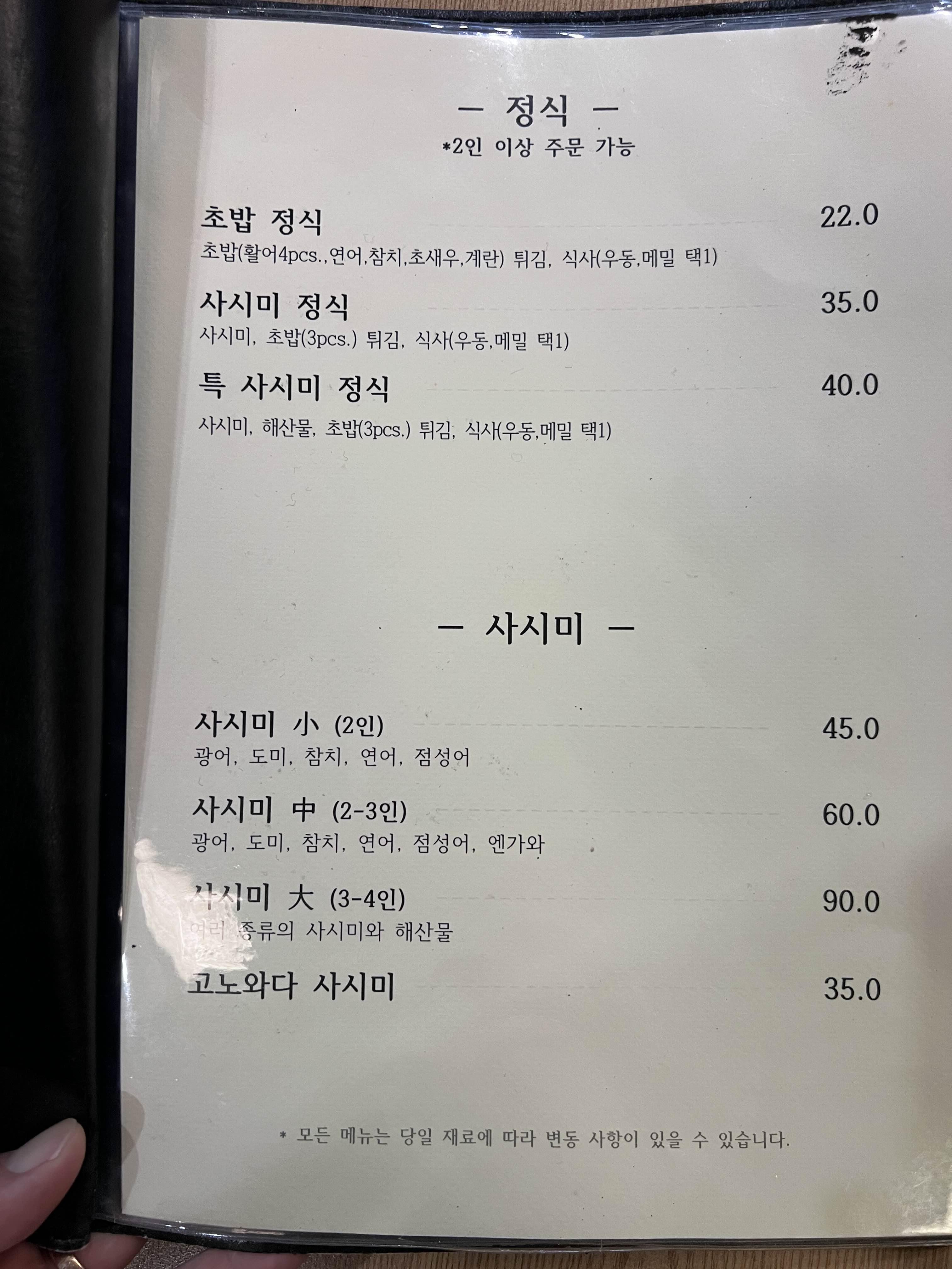 다양한 메뉴들이 있는데 초밥을 제일 많이 시키는 듯합니다. 저희는 모둠초밥과 생선초밥을 시켰습니다. 초밥을 좋아하시면 모둠초밥으로 하시는 게 더 낫겠습니다. 모둠초밥과 생선초밥을 시키면 나중에 우동이 따로 나옵니다. 드실 때 염두에 두세요. 초밥 먹을 때 같이 먹고 싶으면 미리 말씀해 주세요.