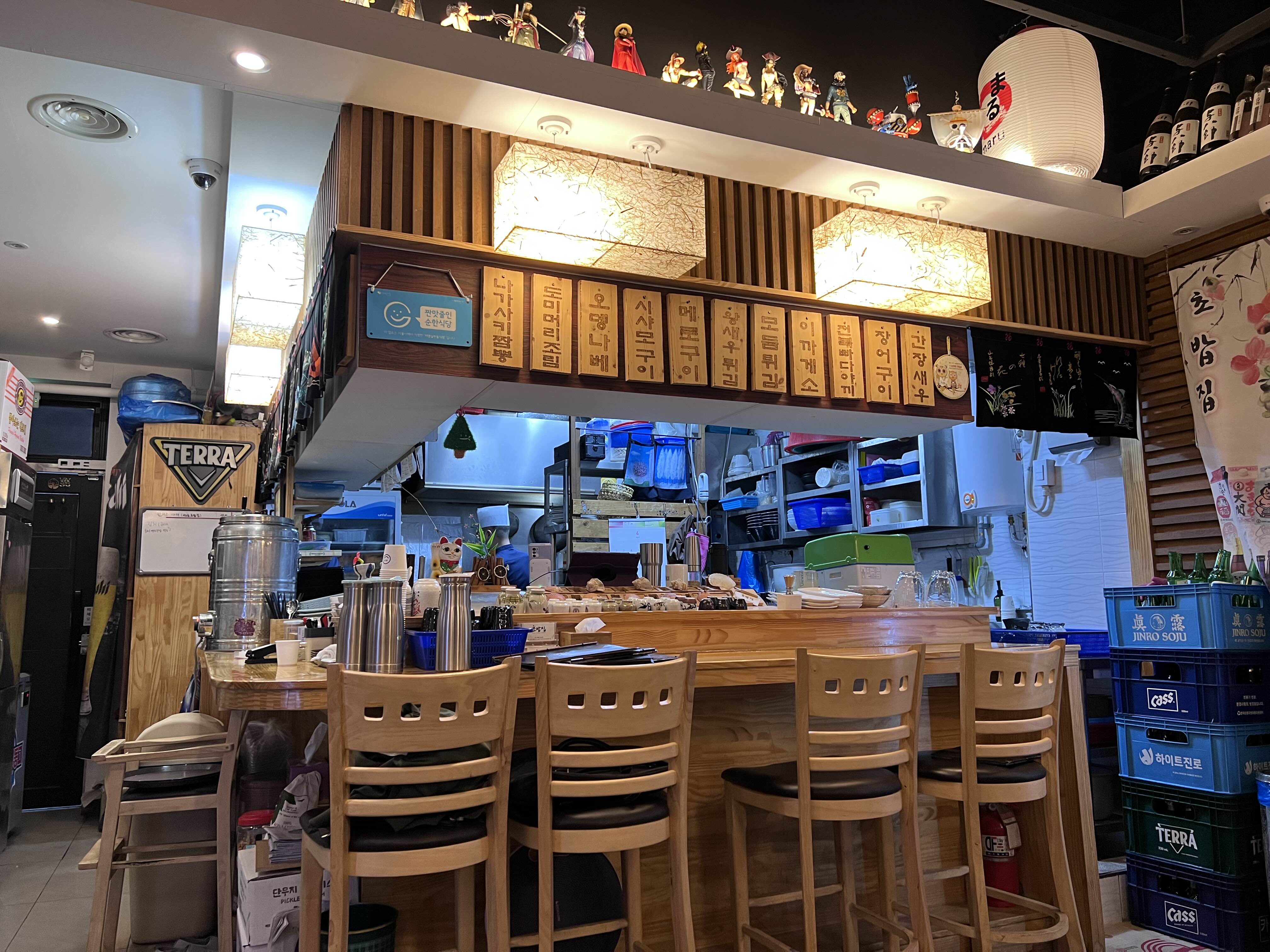 가게 안은 그렇게 크지 않습니다. 2인 테이블과 4인테이블이 빼곡하게 들어서 있습니다. 그래서 혼자 오셔서 드시는 분들도 꽤 계시고 간편하게 둘이서 드시는 분들도 꽤 계십니다. 점심이나 저녁에 항상 사람들이 몰리는 식당이라 바쁜 시간대를 피해서 가는 것이 나을 수도 있습니다. 전당 주변에 초밥집이 몇 개 있는데 이 집도 사람들이 많이 가는 집입니다.