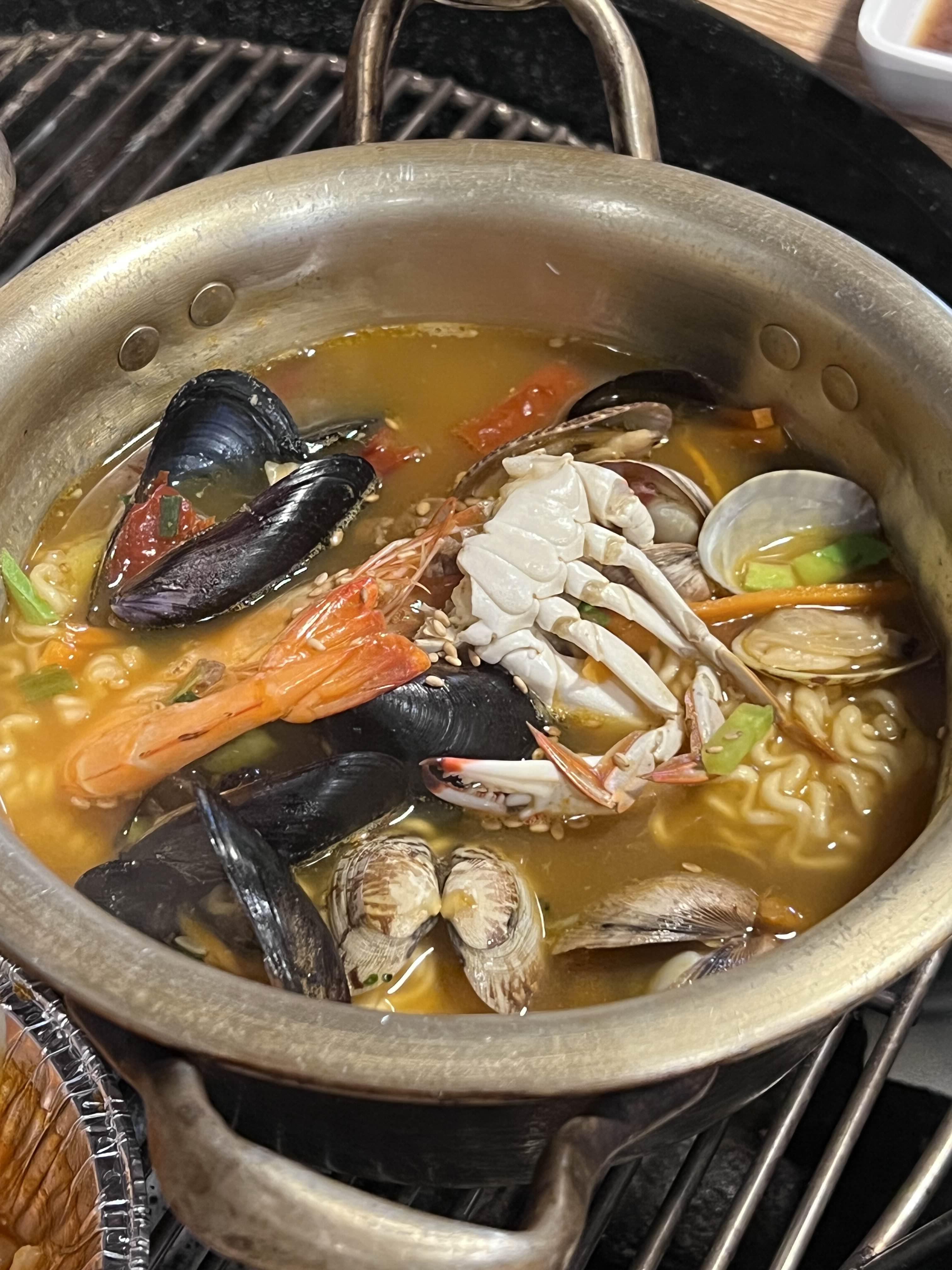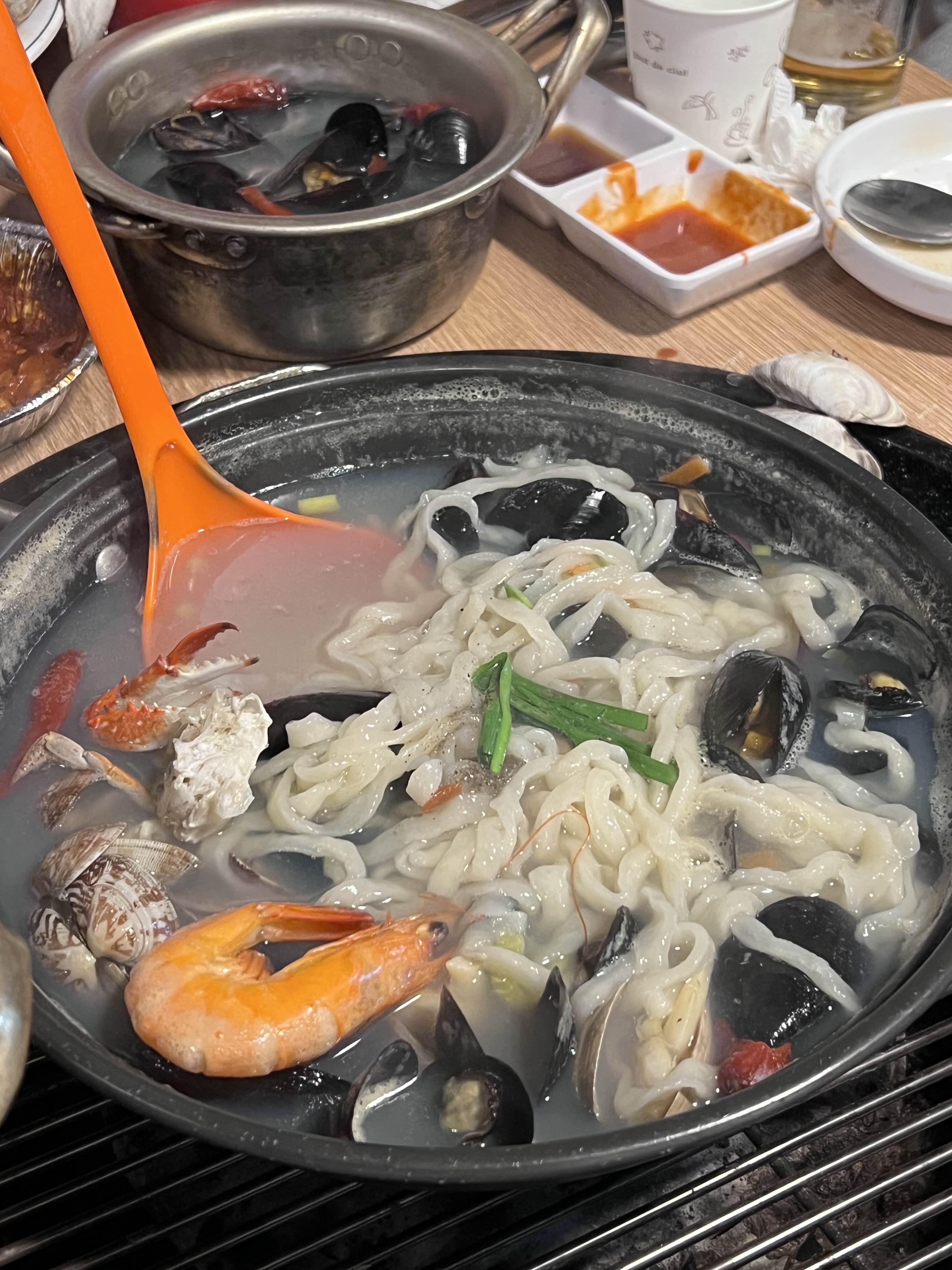 저는 칼국수보다 라면이 좋아서 라면을 시켰고, 친구들은 칼국수를 먹고 싶어서 칼국수를 시켰습니다. 둘 다 맛은 해산물이 많이 들어가서 시원하고 맛있습니다. 탄수화물이 또 들어가야 식사 같은 느낌이 나니까 꼭 드시기 바랍니다. 면을 남김없이 먹었고 국물도 시원하게 자꾸 손이 가더라고요. 술을 먹는 동시에 해장되는 듯합니다.