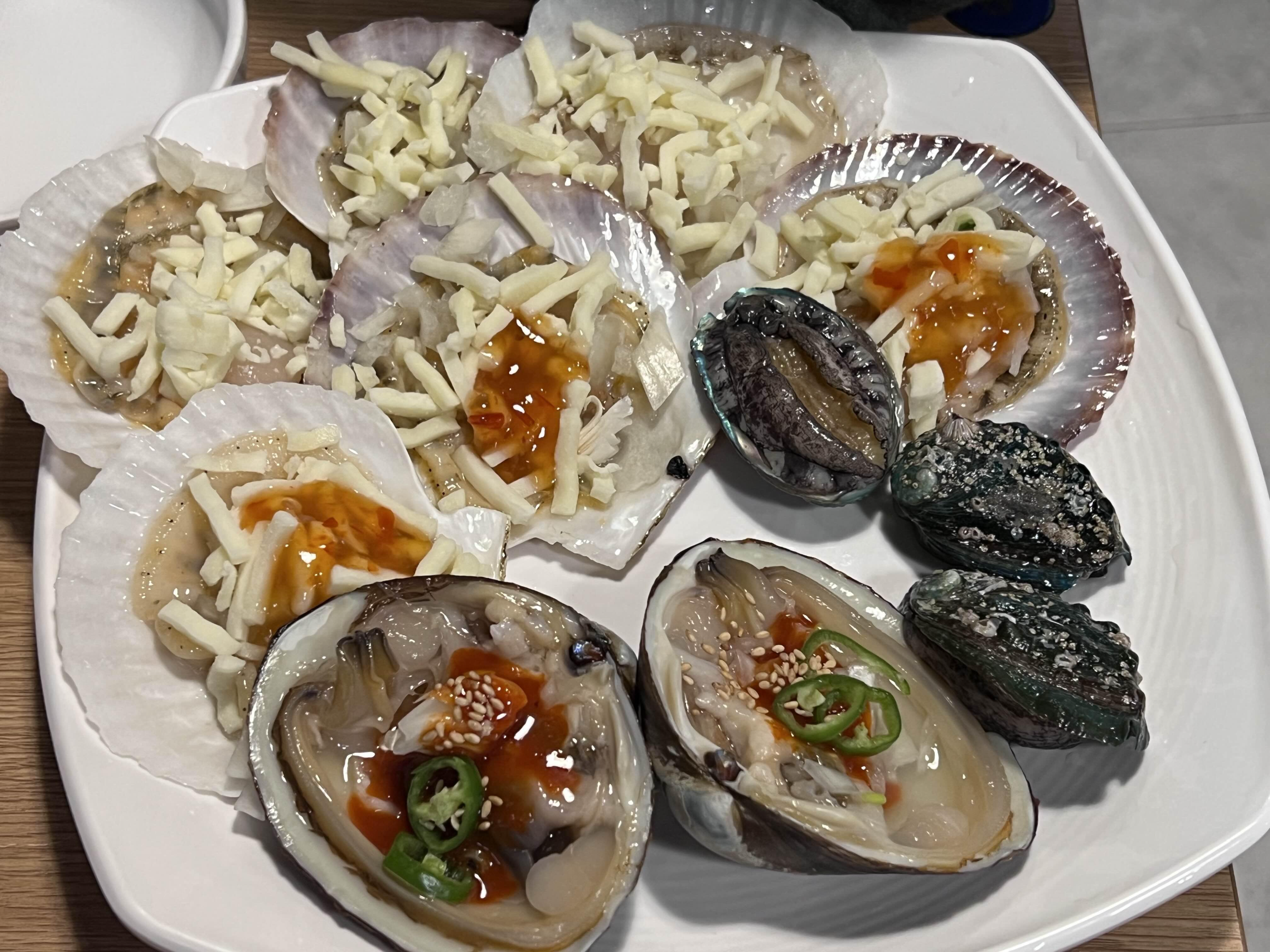 치즈구이와 전복, 그리고 양념된 조개도 같이 나옵니다. 여러 가지 맛을 볼 수가 있는 다양한 조합이 좋았습니다. 보기만 해도 싱싱한 느낌!