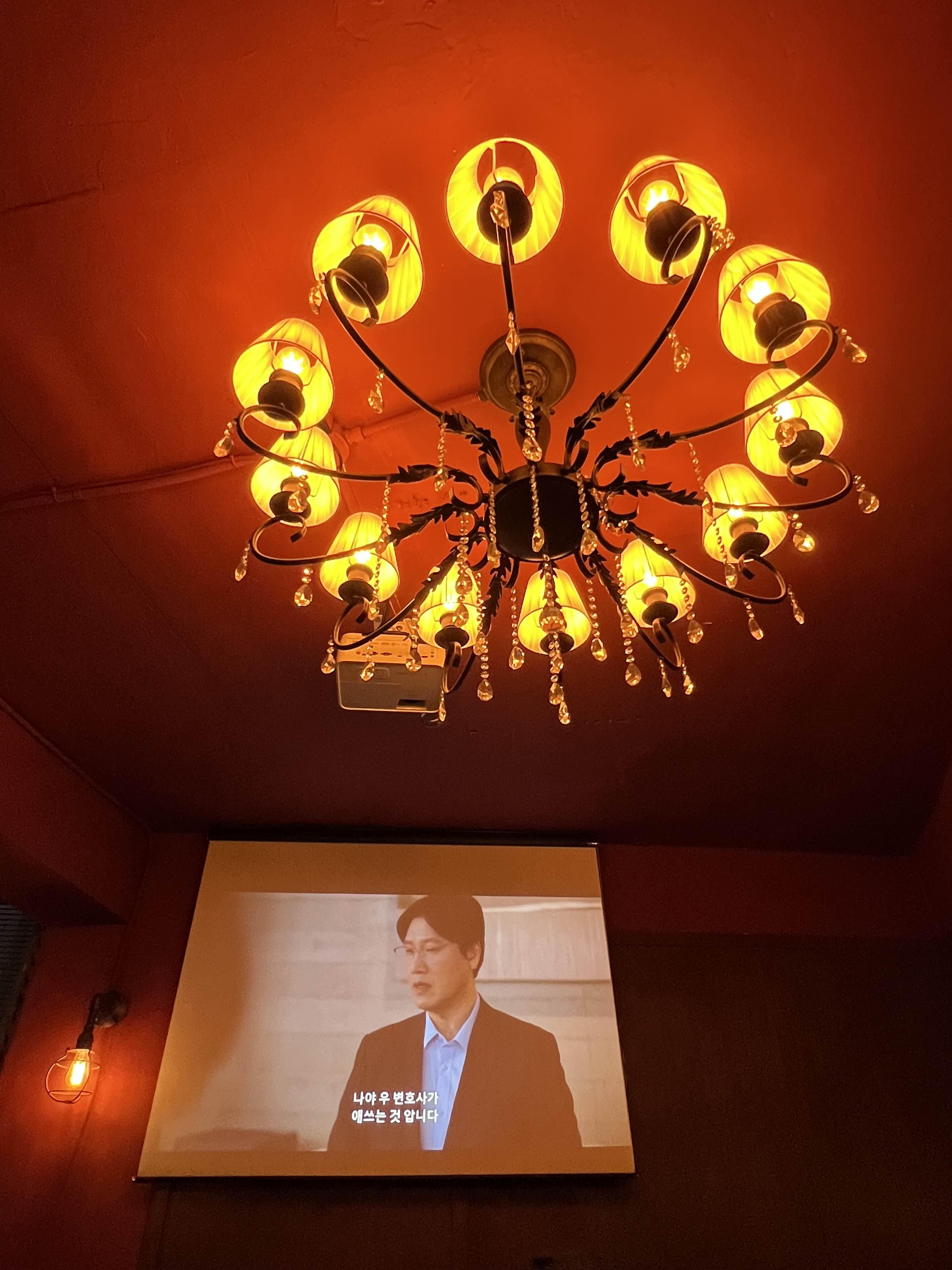 이렇게 노랗게 빛나는 샹들리에가 가운데 있고 프로젝트에 드라마나 영화를 틀어주시는 것 같았습니다. 조용히 감상하거나 멍 때리고 있어도 좋아요. 분위기는 상당히 조용한 편이었던 것 같습니다. 옆 사람의 이야기가 잘 들리지 않을 정도였던 것 같아요.