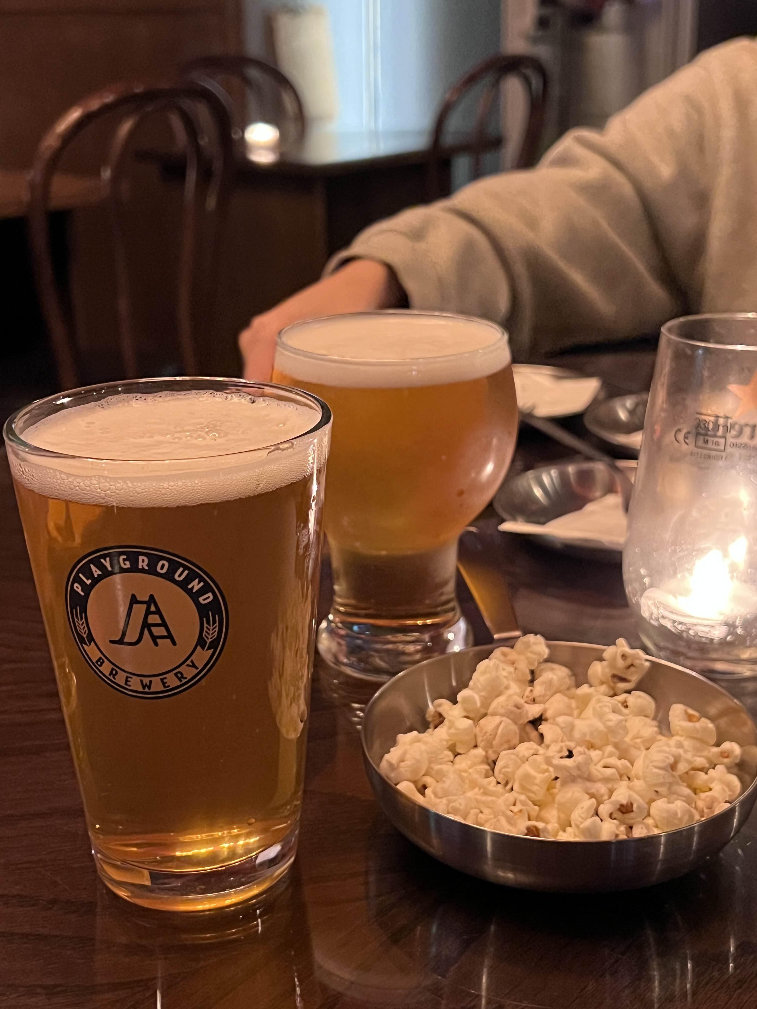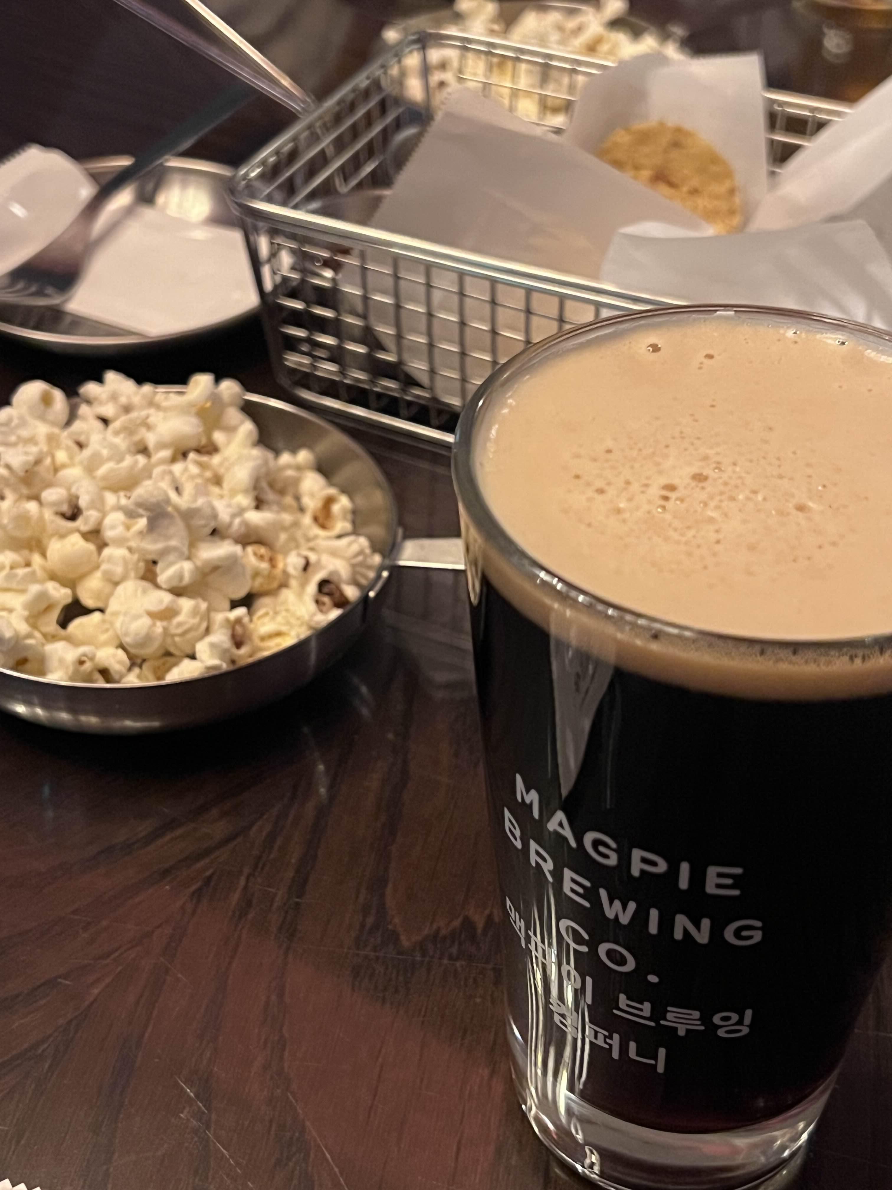 드디어 맥주가 나왔습니다. 저 팝콘이 정말 맥주도둑입니다. 계속 먹게 되는....
