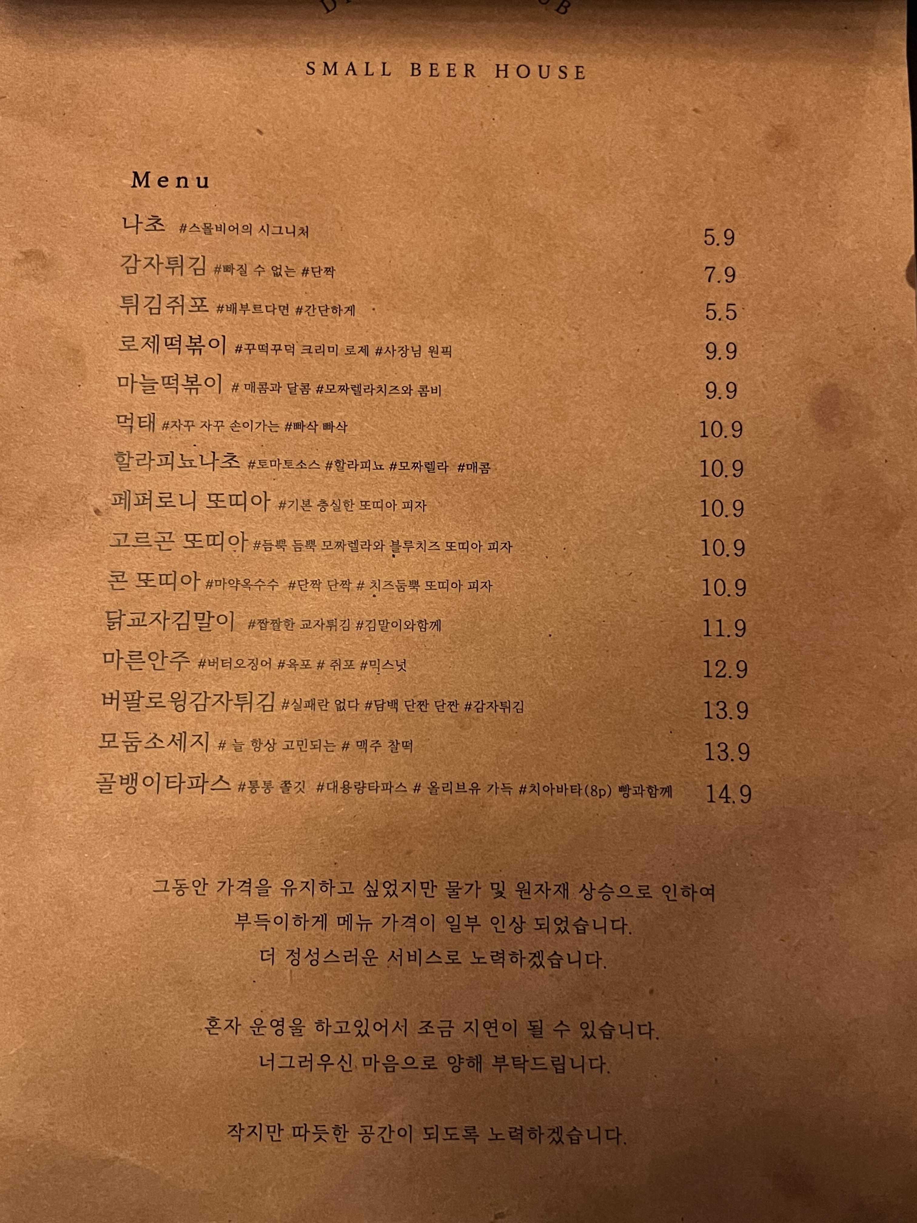 하이볼과 논알코올 음료도 준비되어 있어서 맥주가 싫으신 분들은 다른 음료를 시켜도 됩니다. 좌석은 2인 테이블이 많이 있어서 3-4명이 가면 가운데 원형 테이블 밖에 앉을 수가 없어요. 그게 좀 아쉽지만 공간이 그렇게 큰 가게가 아니다 보니 어쩔 수 없습니다. 아담한 크기이기 때문에 오히려 더 좋게도 느껴집니다.