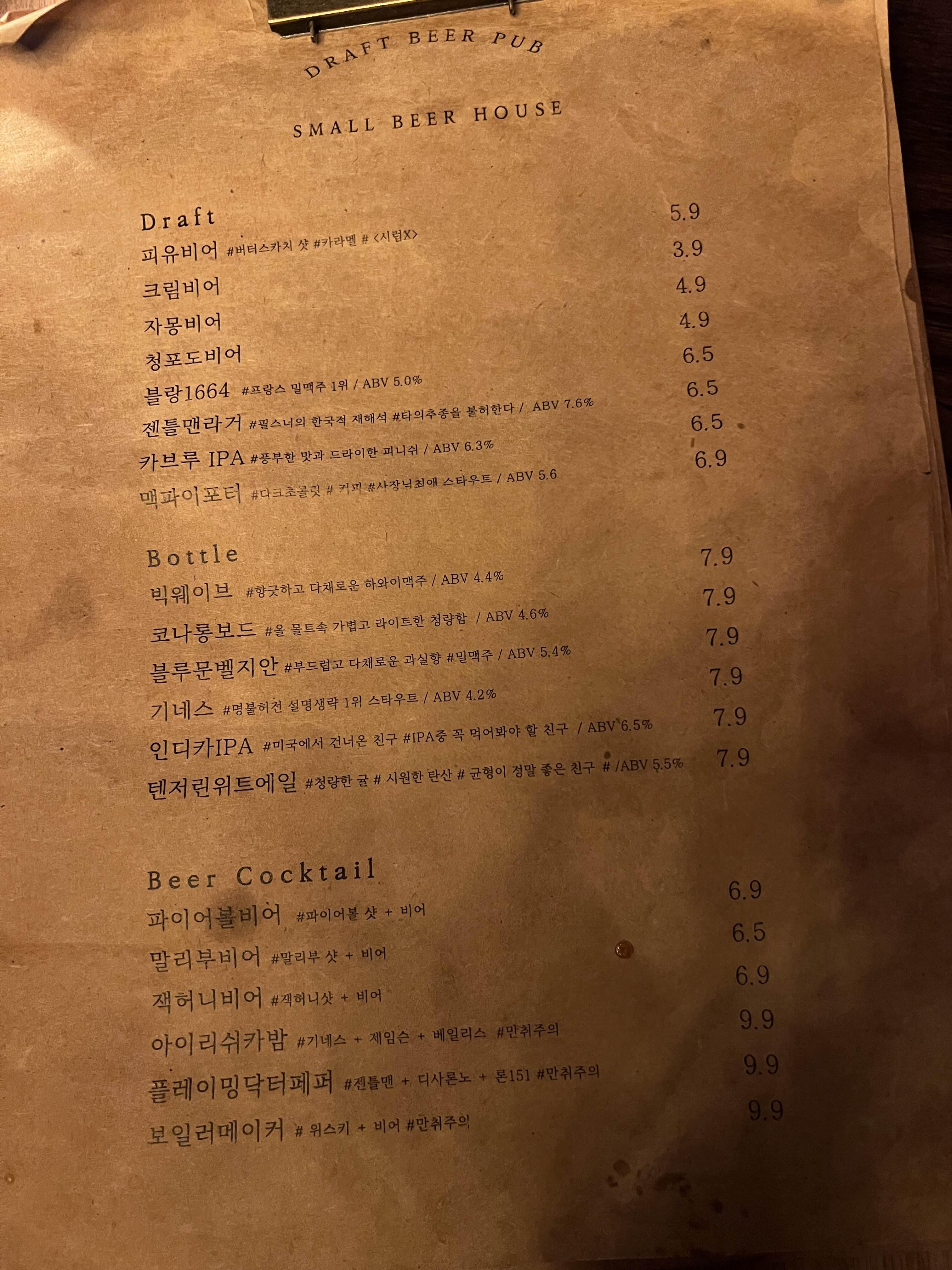 일단 드래프트 비어가 많아서 좋습니다. 피유비어는 카라멜향이 강해서 단 것을 싫어하시는 분들에게는 비추합니다. 청포도비어도 청포도향이 너무 강해서 맥주의 맛을 느끼고 싶은 분들에게는 비추합니다. 나머지는 다 괜찮았던 것 같습니다. 생맥주를 마실 수 있어서 좋았어요. 저희 집 근처에는 이런 작은 맥주펍이 없어서 아쉬웠거든요. 집 근처에 있어서 와서 책도 보고 친구랑 수다도 떨 수 있을 것 같아서 좋을 것 같아요. 생맥주가 안 당기시는 분들은 병맥도 있으니 참고하세요!