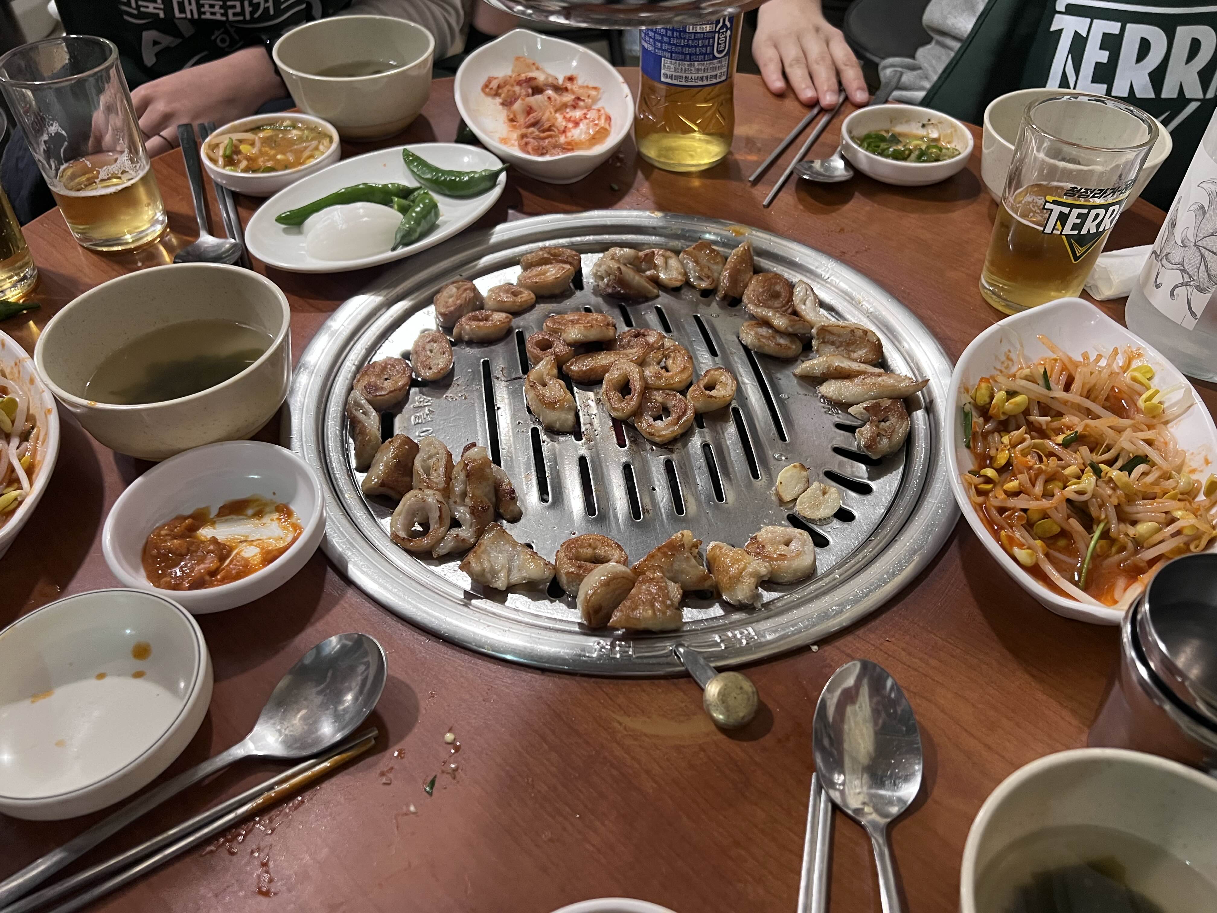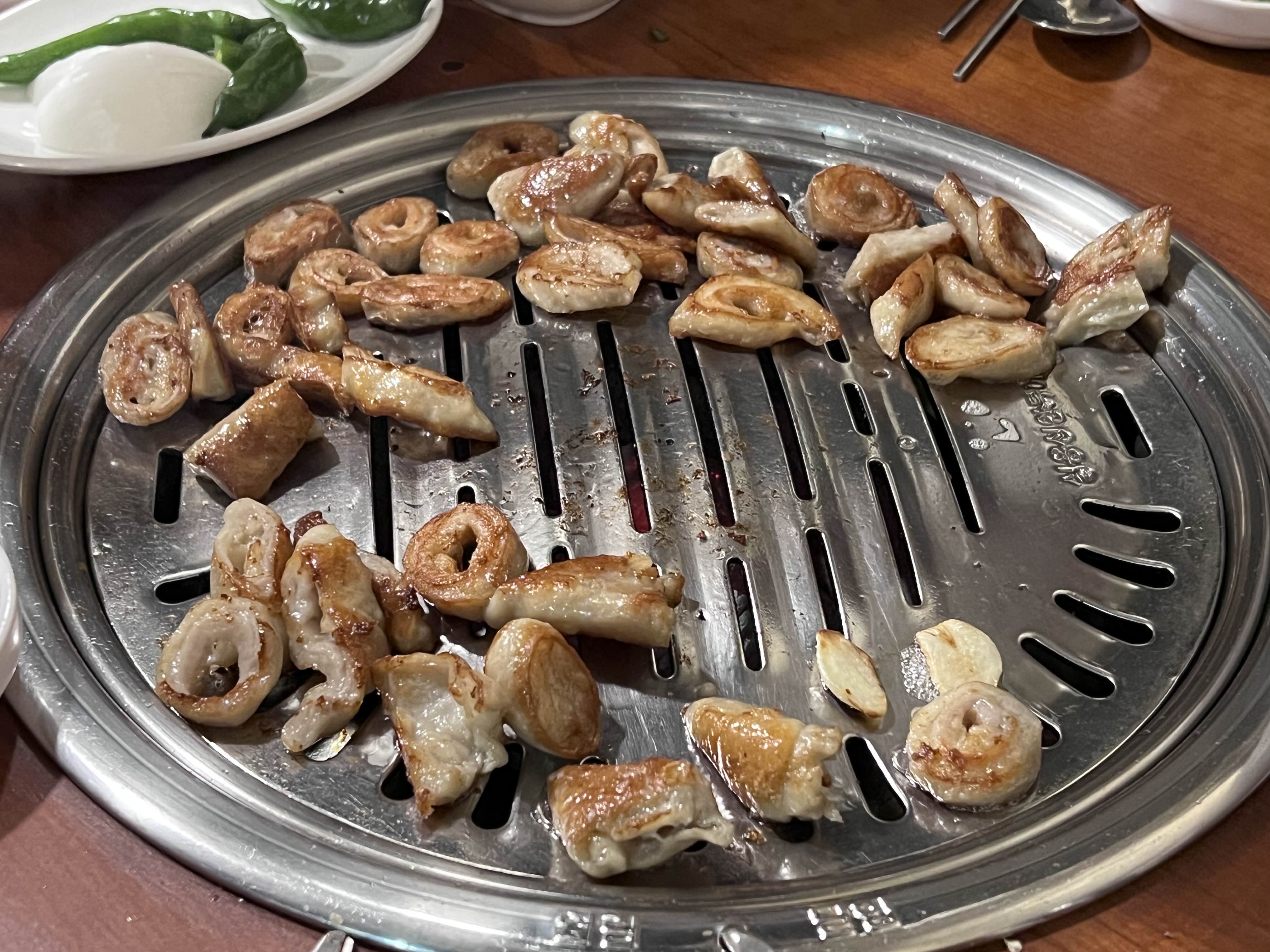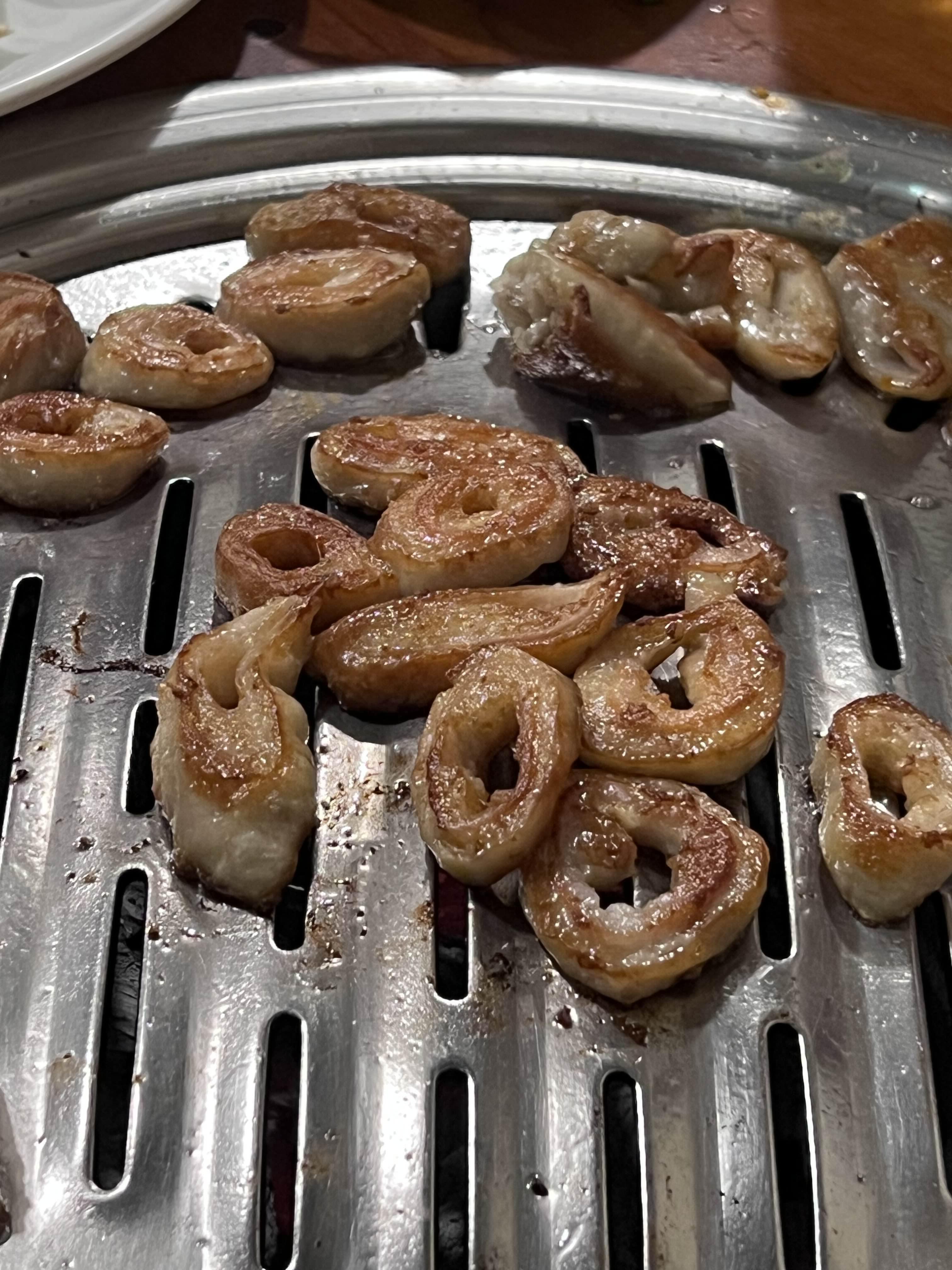 돼지막창은 초벌되서 나오기 때문에 약한 불에 먹을 정도만 가운데 올려서 취향껏 익혀서 먹으면 된다. 나는 바싹 익혀서 바삭한 식감을 좋아하기 때문에 바싹 익혀 먹는 편이다.