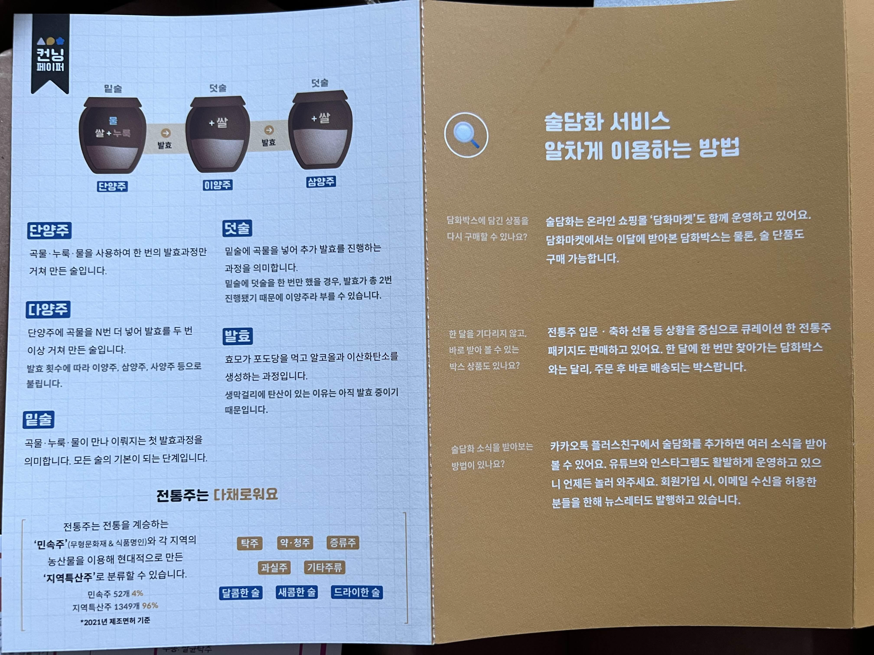 술담화 박스에는 사진처럼 술에 대한 지식이나 안내 등이 들어있어서 처음 받아보는 분들에게도 꽤 도움이 됩니다. 친구 선물로도 많이 보내곤 합니다. 친구나 부모님 생일에 가볍게 보내보는 것도 좋을 듯해요!