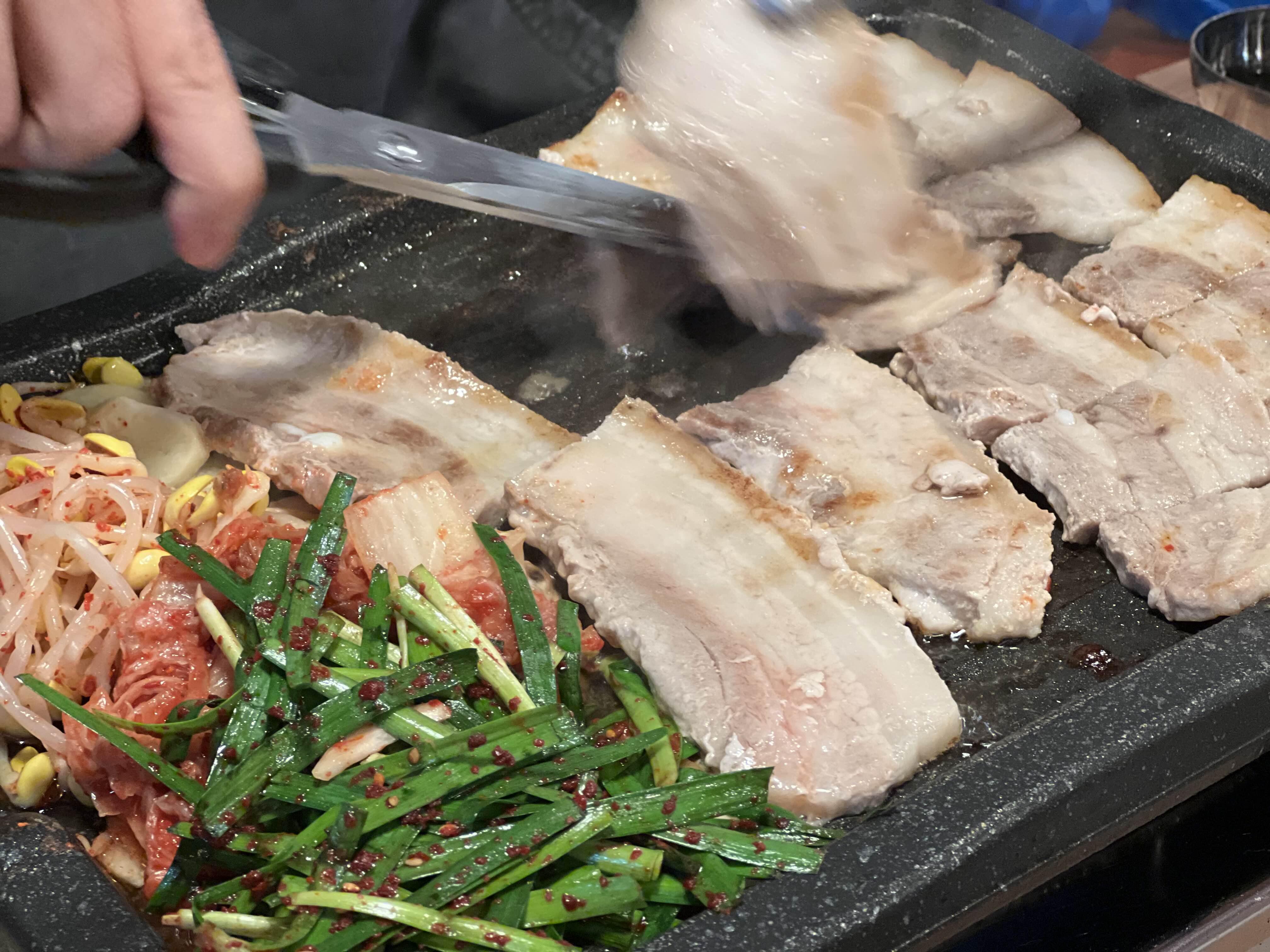 불판이 달궈지면 바로 냉동삼겹살을 올려주고 기름이 좀 나오면 부추와 김치, 콩나물을 올려주세요. 냉동삼겹살은 부추나 김치, 콩나물과 같이 먹어야 맛있습니다.
