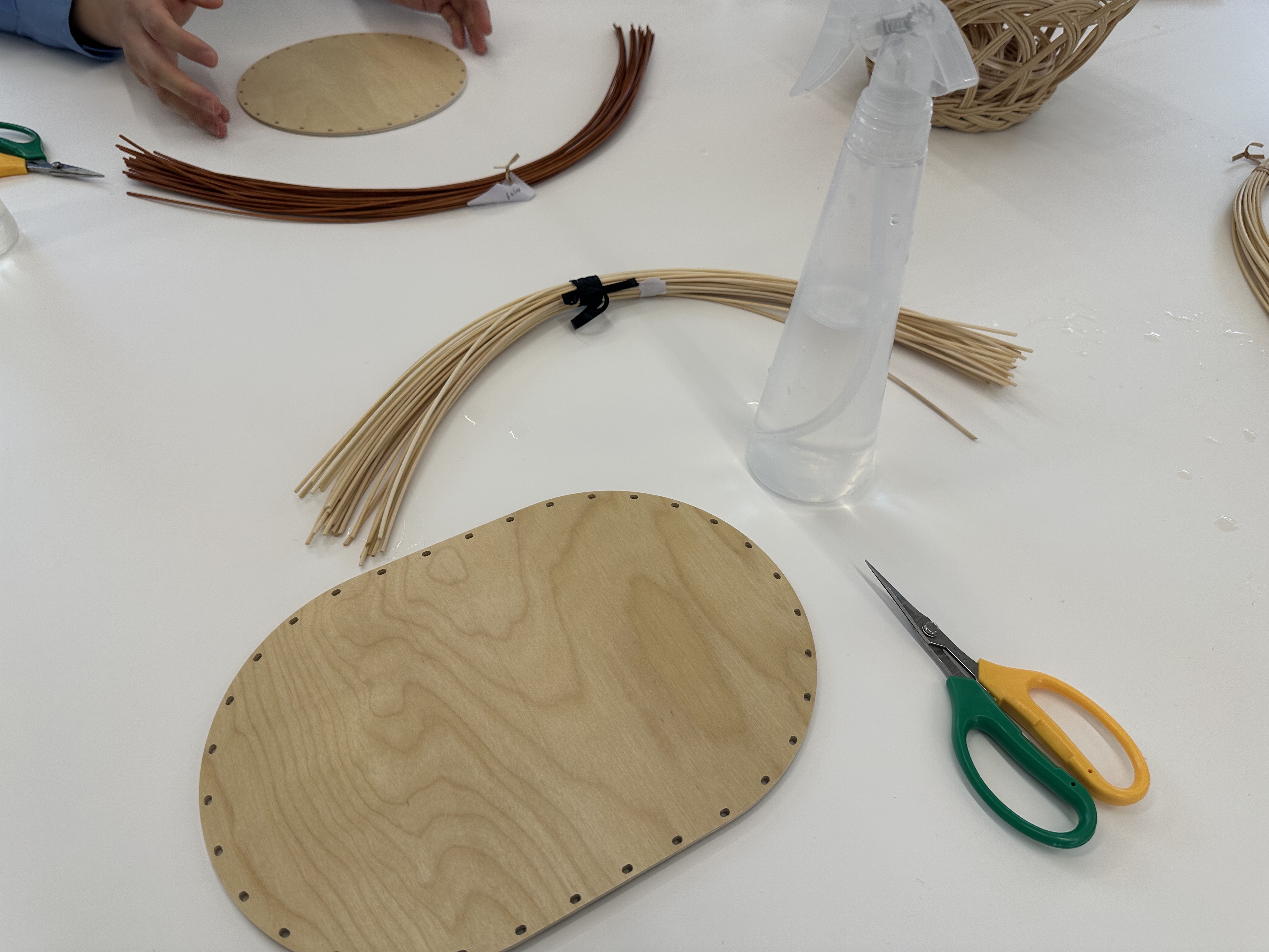 드디어 라탄 수업. 몇 분은 바구니를 만들어서 아래 사진처럼 바닥판에 라탄 소재를 껴서 만드는 것이었습니다. 바구니도 색이나 손잡이 유무, 바닥 모양등을 보고 결정할 수가 있습니다. 저는 바구니는 별로 필요하지 않아서 화분바구니를 만들기로 했습니다. 제가 있는 화분사이즈로 만들고 싶었는데, 이미 다 바닥을 만들어놓으셔서 어쩔 수 없이 정해진 사이즈로 만들었습니다. 자기가 만들고 싶은 사이즈로 만들게 해 주었으면 더 좋지 않을까 하는 아쉬움이 있습니다.