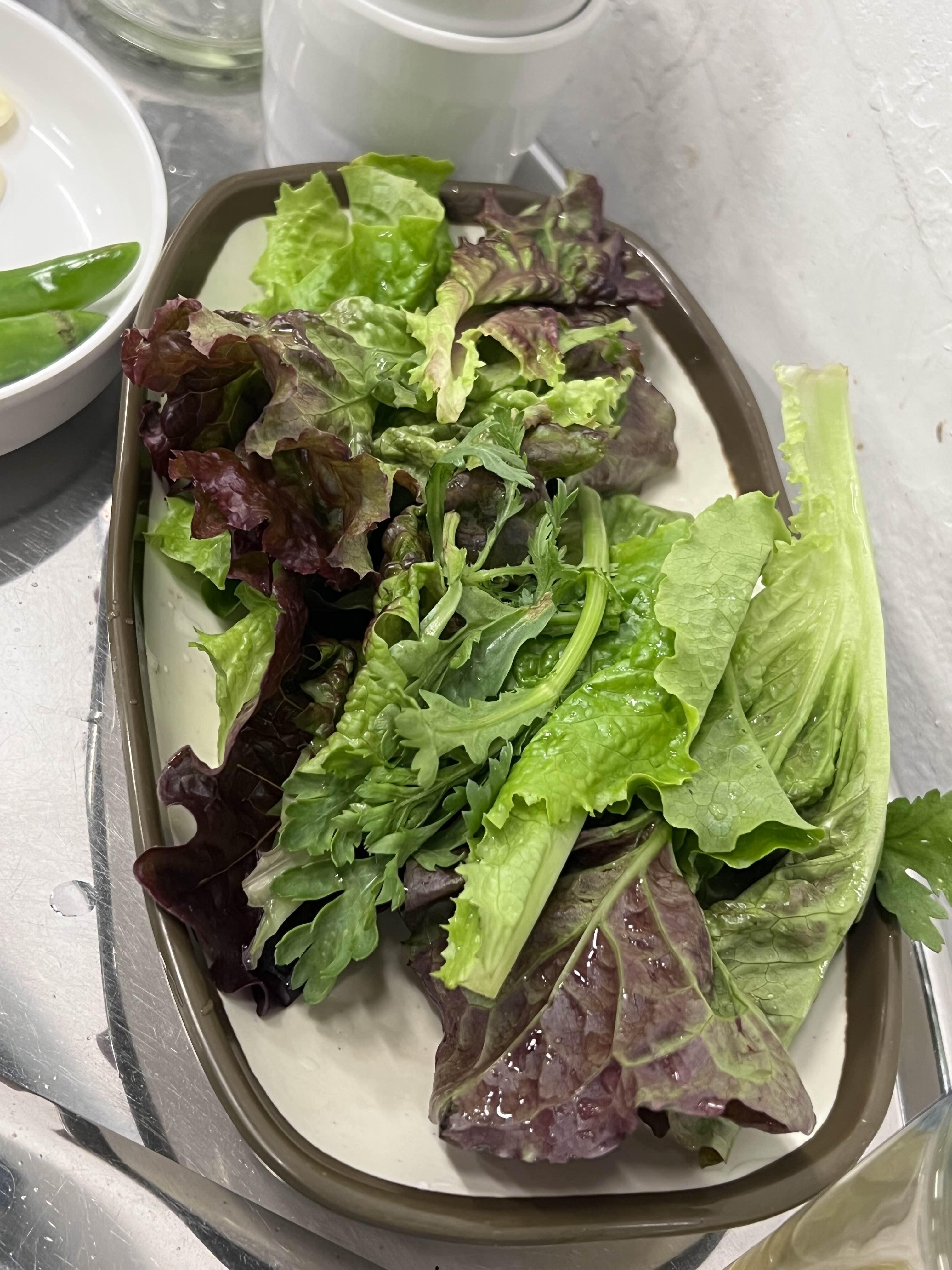 이렇게 소금 올려서 잘 구워주시면 되시고, 여기는 상추 야채도 직접 기르신다고 하네요. 그래서 상추가 조금 작습니다. 직접 기르신 것을 주시니까 정성이 느껴집니다. 싸 먹기에도 좋은 사이즈이고, 직접 기르다 보니 약간 상처가 있는 부분이 있을 수도 있어요! 근데 반찬도 야채도 너무 정성이라 더 맛있게 느껴집니다. 이 집이 점점 좋아지고 있어~