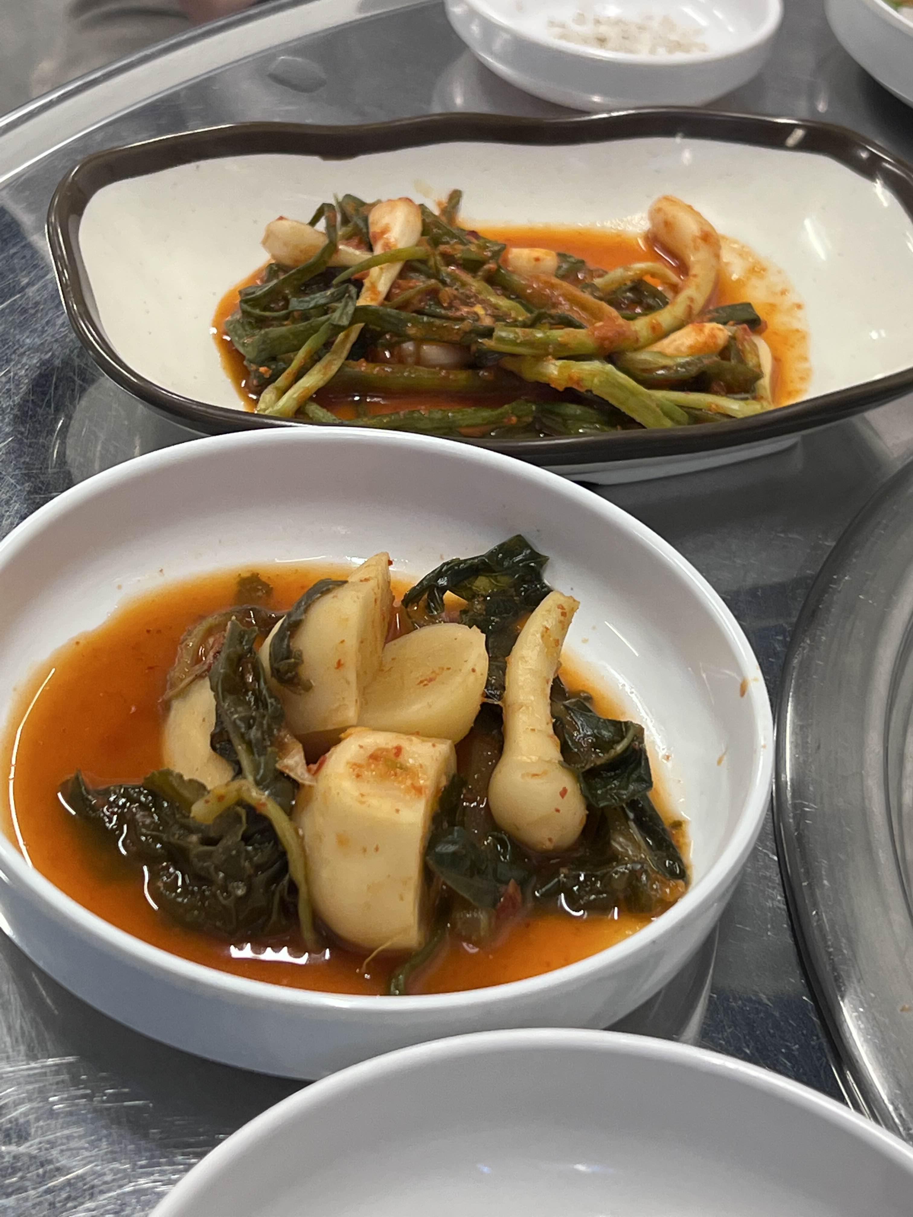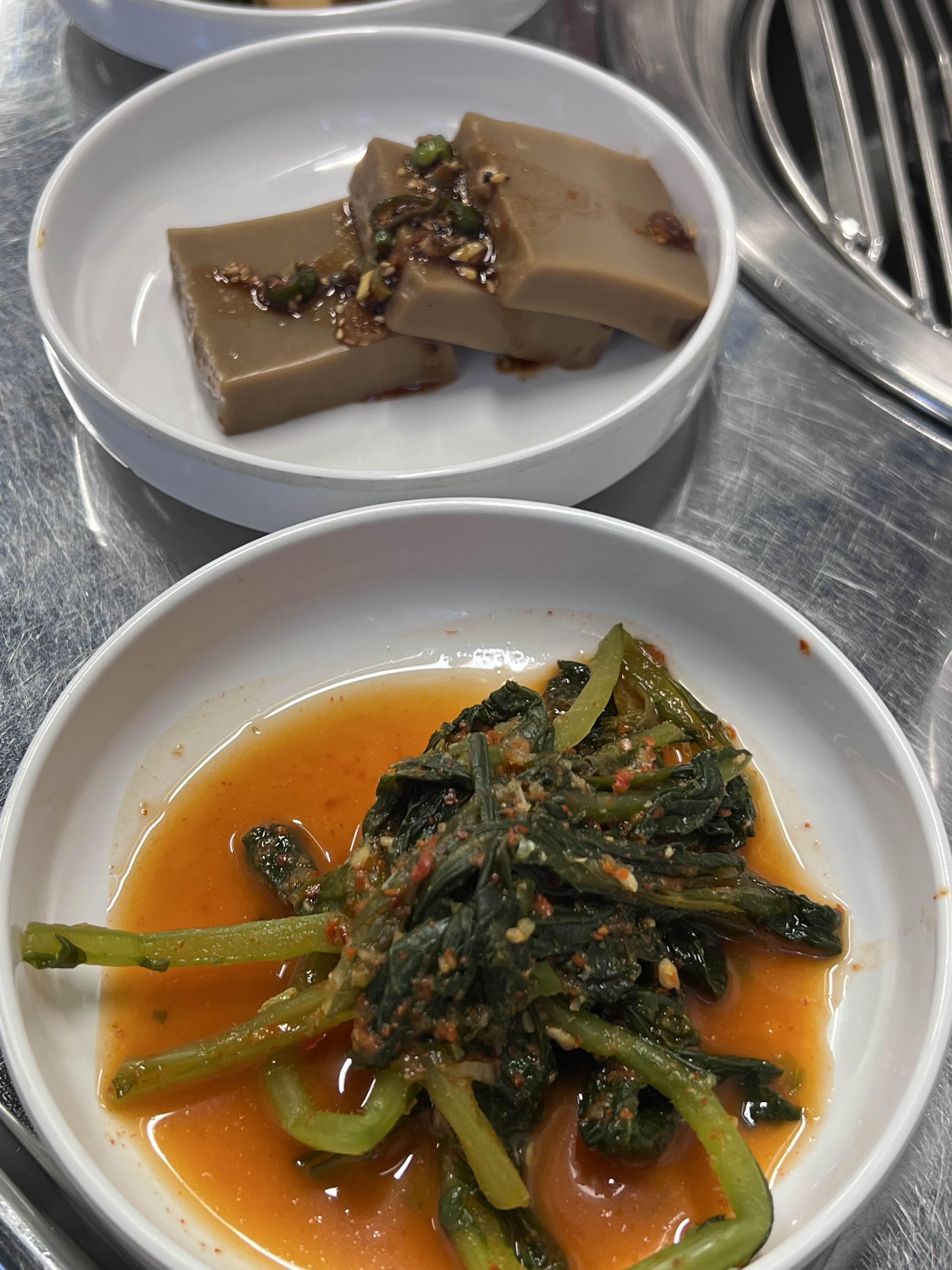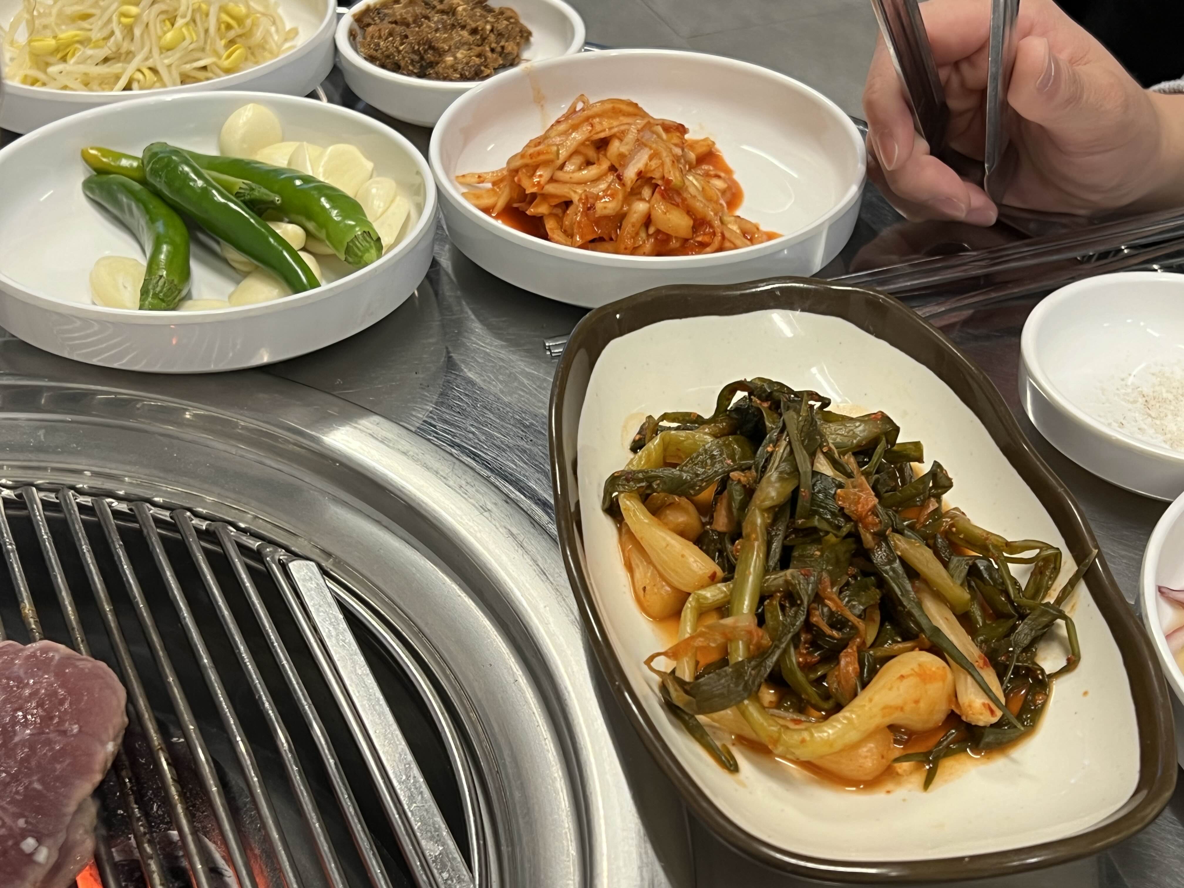 기본 반찬으로 열무김치, 파김치, 총각김치, 도토리묵 등이 나와요. 김치를 3종류나 주는 집은 처음 봅니다. 근데 모두 약간 묵어서 그런지 기름진 고기에 잘 맞을 것 같아요. 직접 담그시나봅니다.