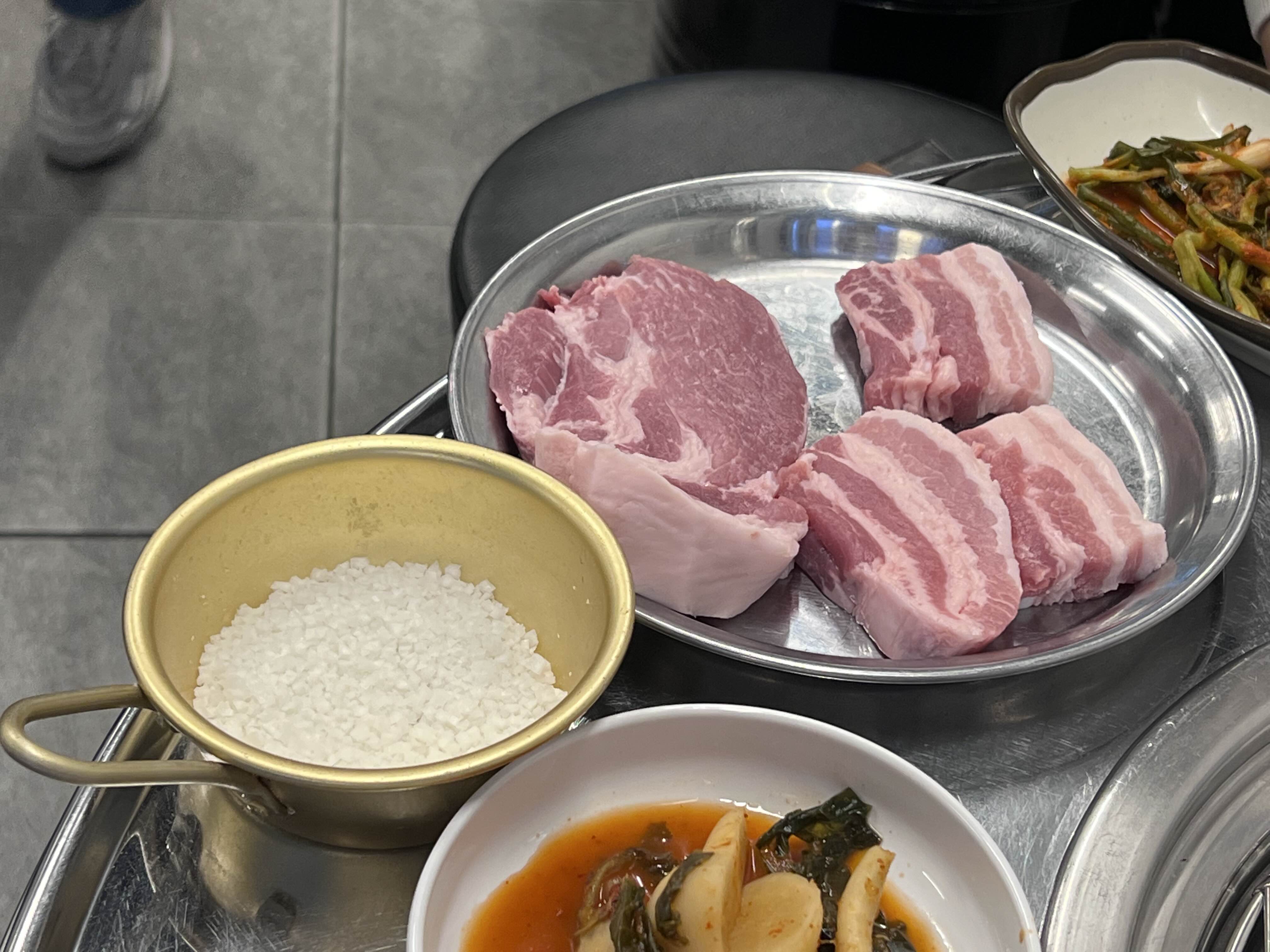 처음에는 삼겹살과 목살 1인분씩 시켰습니다. 그리고 대접에 저렇게 굵은 소금도 같이 줍니다. 고기를 올리고 소금으로 셰프처럼 소금을 살살 올려주면 끝!