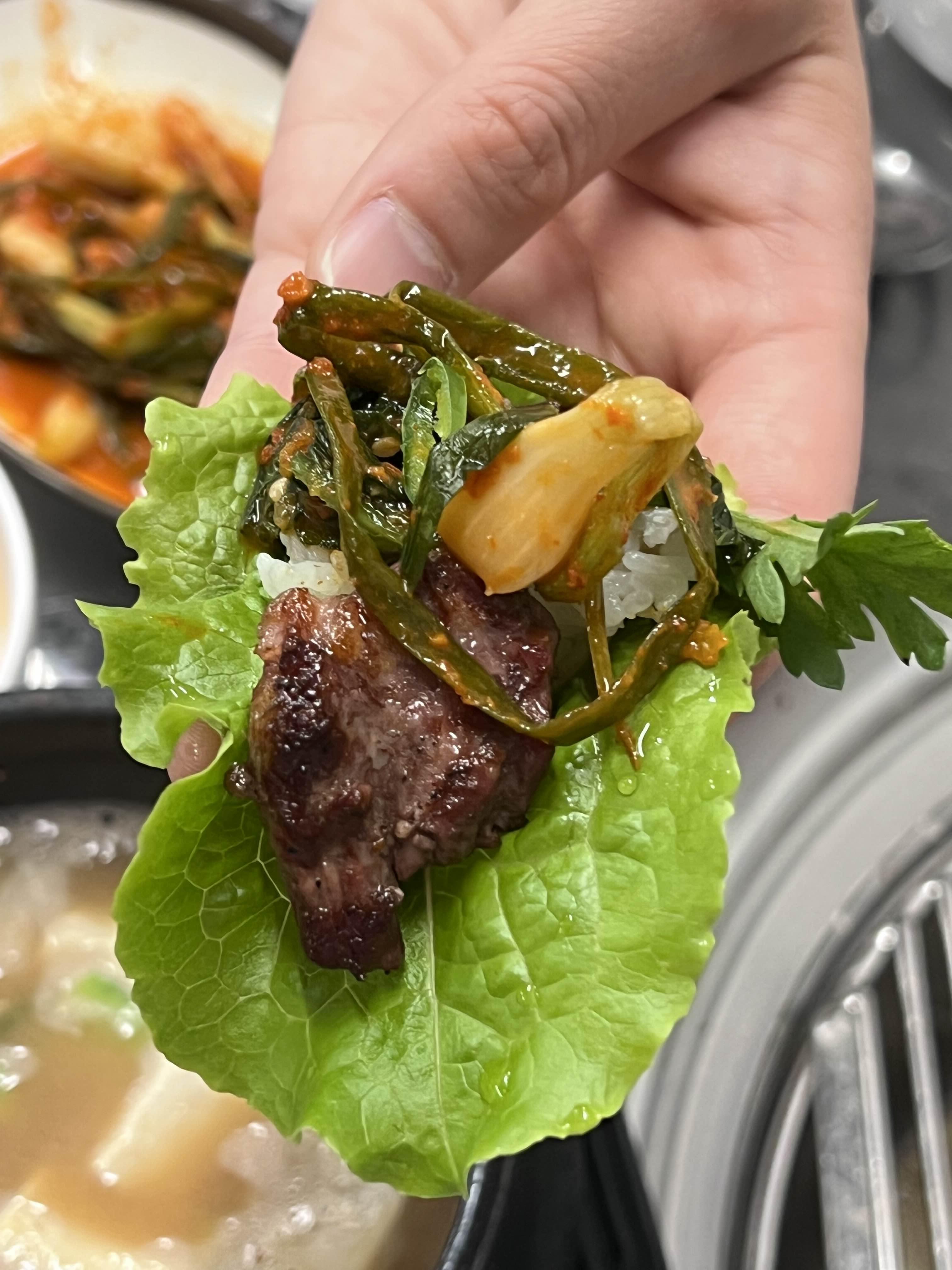 상추도 있지만 쑥갓도 중간에 있어서 같이 싸먹으면 맛있어요! 바로 이렇게 싸 먹어 드시면 됩니다. 아주 맛있어서 술이 그냥 들어갑니다. 상추가 아주 아담하죠? ㅋㅋㅋㅋ 아주 싸 먹기 좋은 사이즈!
