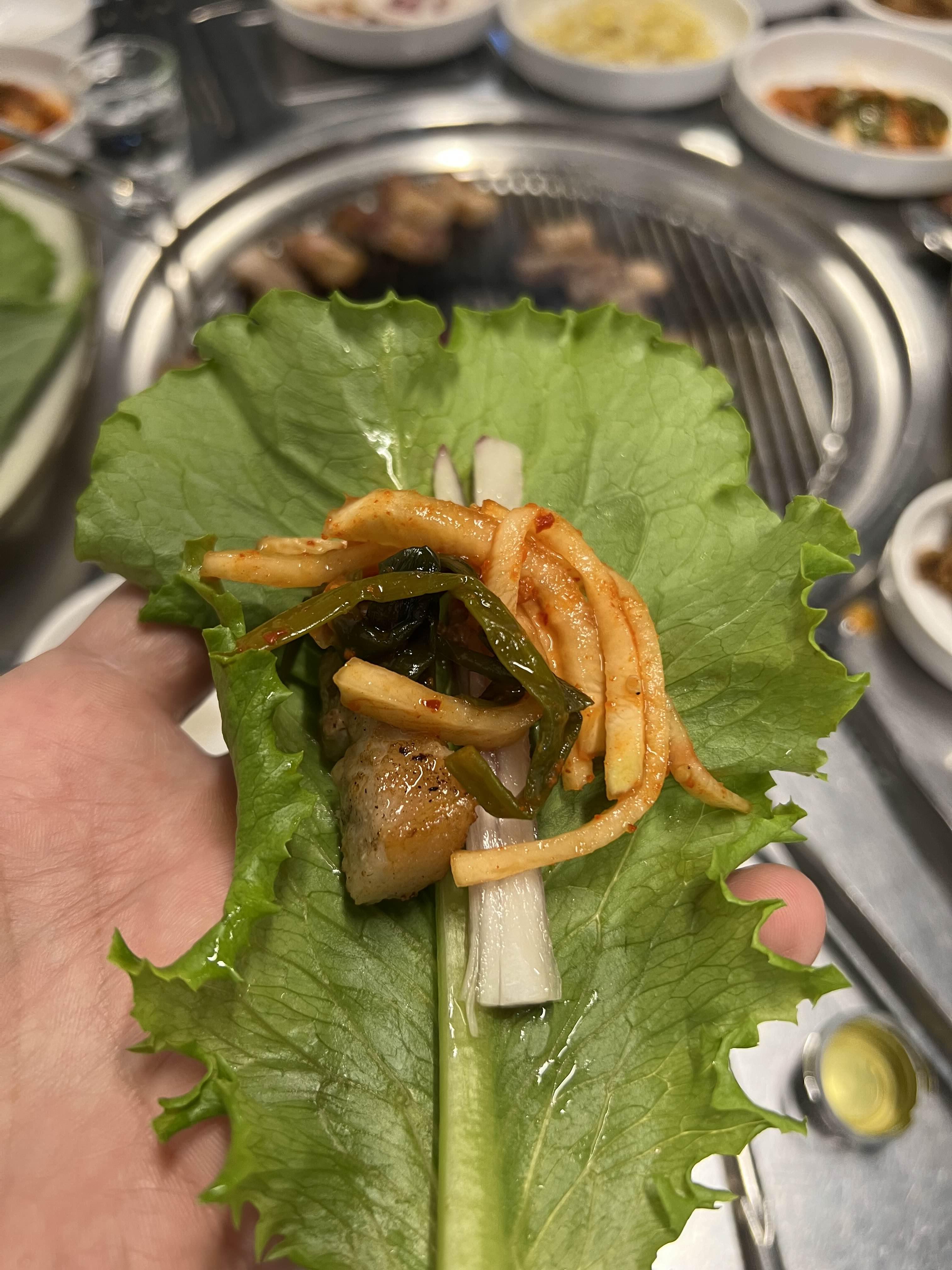 고기랑 야채만 먹어도 좋고, 거기에 파김치를 하나 올려서 먹어도 아주 좋아요. 김치가 3종류나 나오기 때문에 느끼함을 전혀 느낄 수 없고, 삼겹살과 파김치는 정말 미친 조합인 것 같습니다. 아마 이거 보시는 분들은 군침 돌 거예요. 저도 다시 파김치와 삼겹살 조합 느끼로 다시 친구들과 갈 것 같습니다. 밤에 조금 쌀쌀할 때 노포 같은 집에서 많이 즐겨줘야 하거든요. 곧 여름 됩니다....