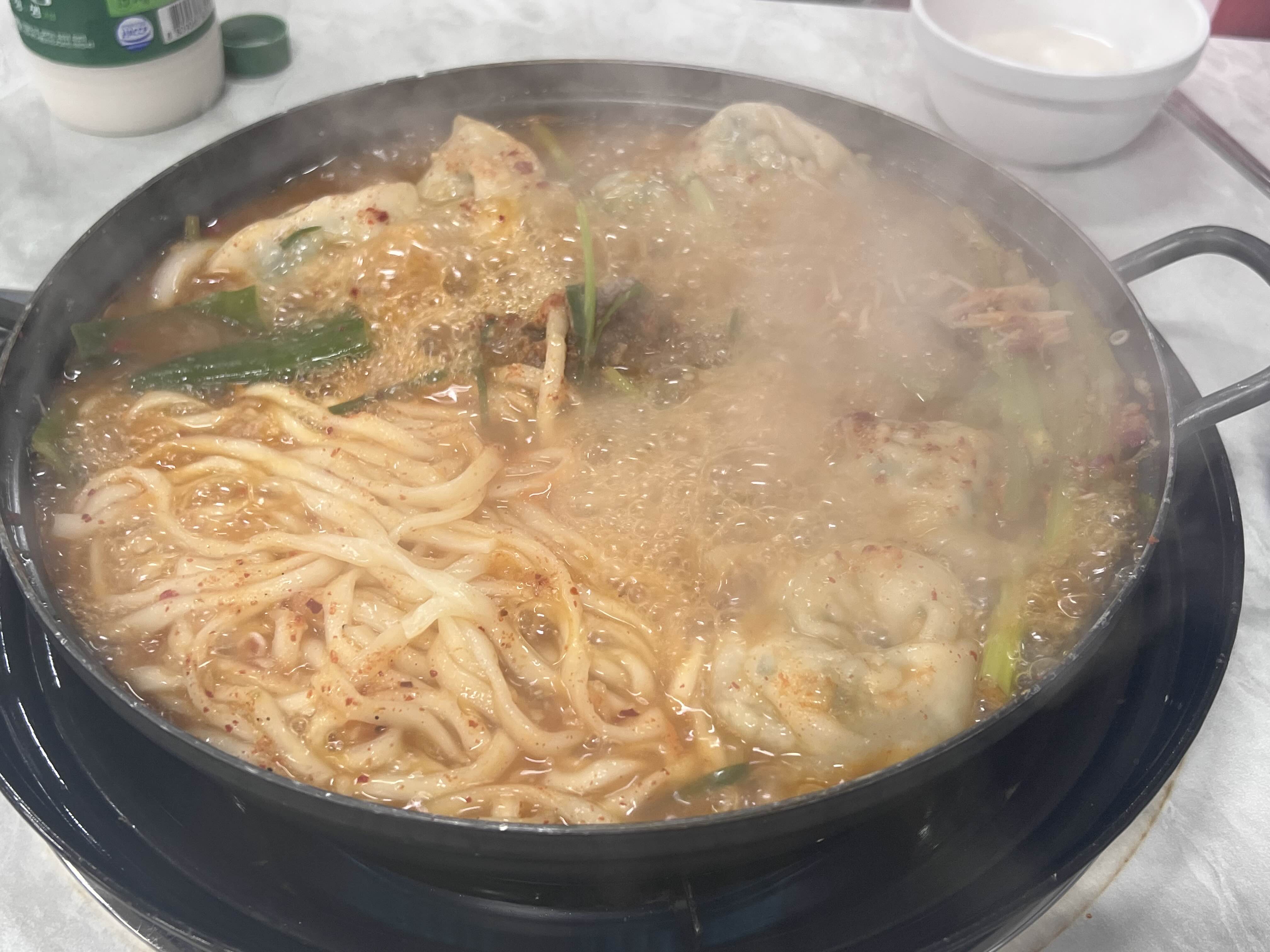 이렇게 김이 모락모락나오지 면이 다 익어가면 드셔도 됩니다. 사장님이 보시고 먼저 버섯이랑 만두 먼저 먹고 칼국수는 1분 있다가 먹으라고 해주세요. 순서대로 먹으시면 됩니다.