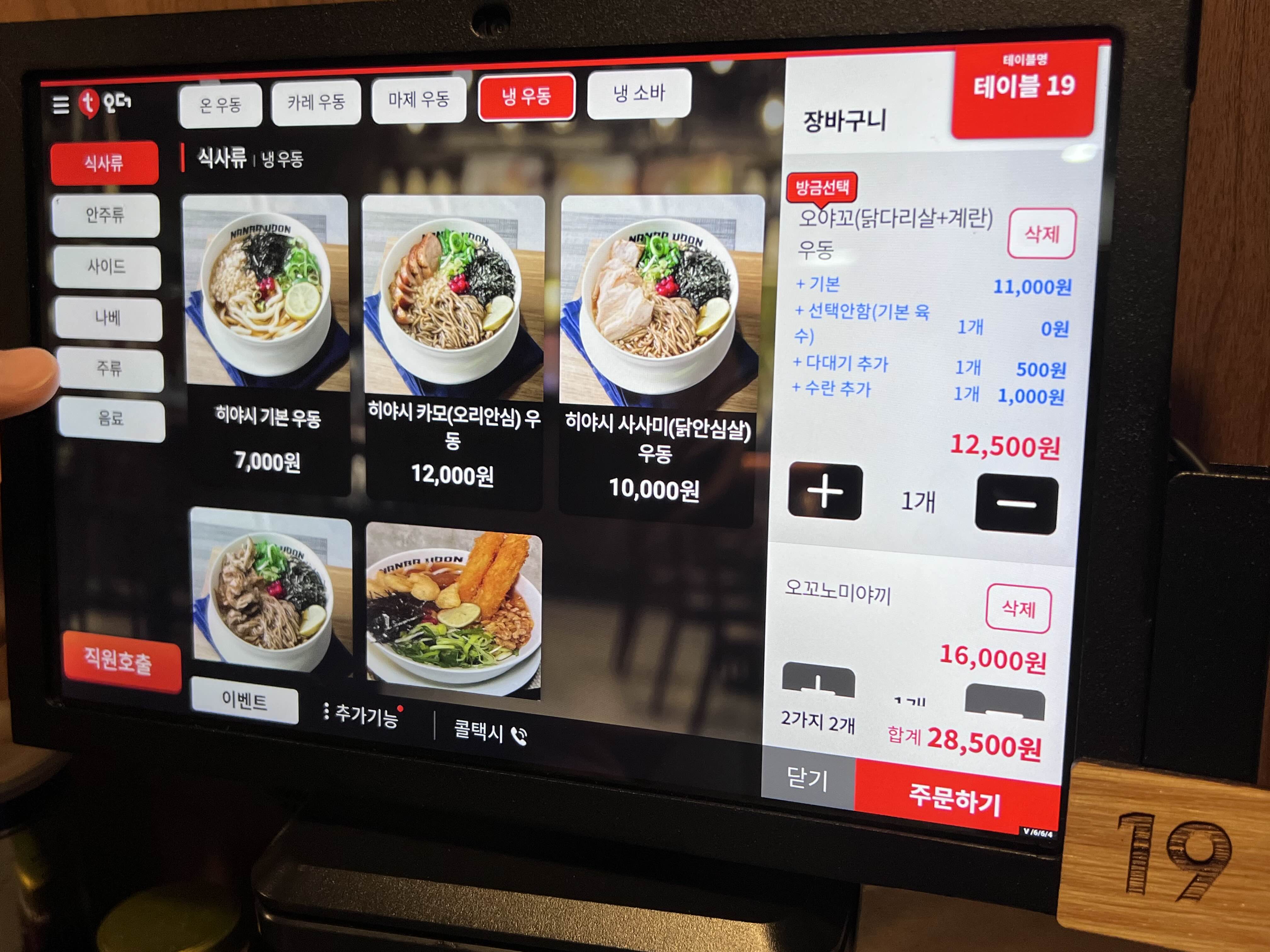 메뉴는 자리에 있는 태블릿으로 직접 주문하면 됩니다. 자희는 아야꼬(닭다리살+계란)우동을 주문하고 안주류에서 오꼬노미야끼를 시켰습니다. 그리고 수란과 다대기를 추가하고 맥주도 시켰습니다.