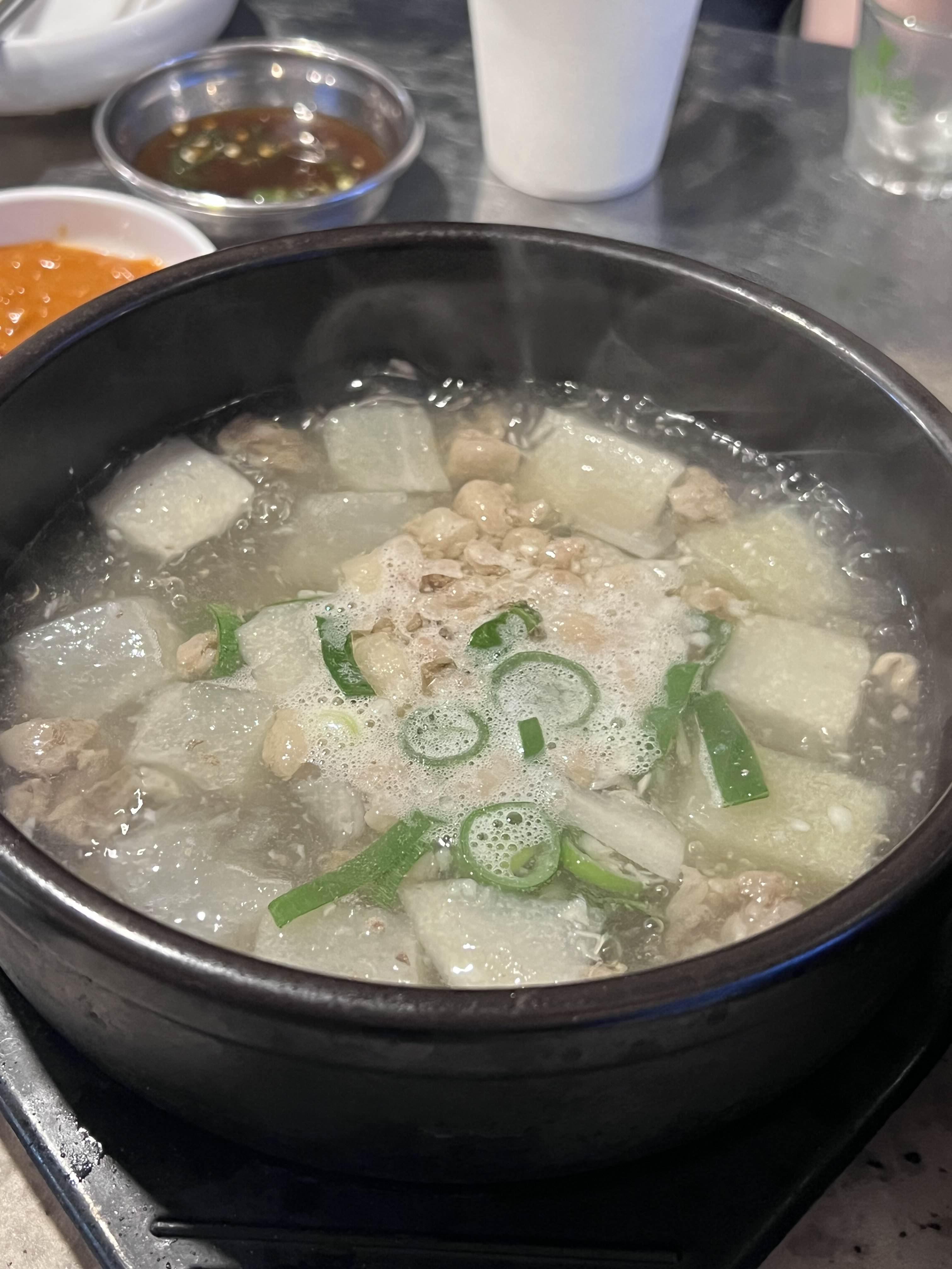 그리고 먹다 보면 소고기뭇국이 나옵니다. 소고기뭇국은 처음에는 공짜로 나오고 또 시키려면 주문해야 합니다. 근데 맛이 너무 맛있어서 계속 숟가락이 갑니다. 이 맛 때문에 여기를 찾는 것도 있습니다. 소주를 부르는 맛입니다.