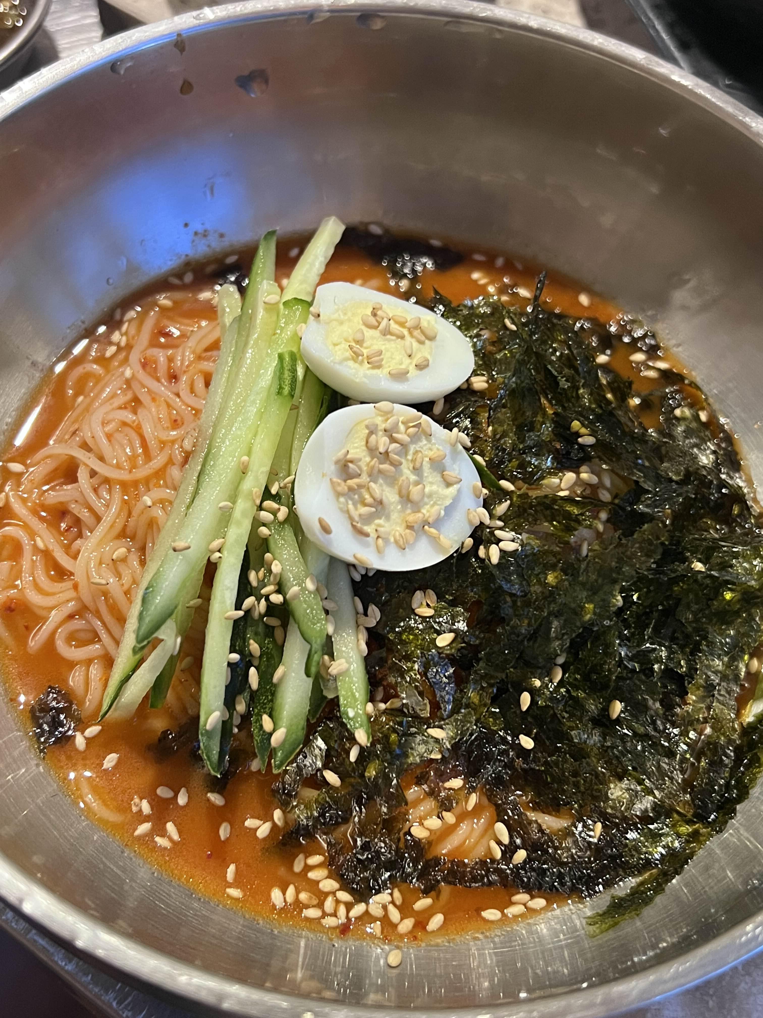 그리고 비빔국수를 하나 시켰어요. 비빔국수랑 고기랑 싸 먹으면 맛있잖아요. 물냉면과 비빔냉면을 하나씩 시켜서 친구들과 같이 나눠먹었습니다. 약간 느끼할 수 있는데 비빔국수랑 먹으면 고기가 더 들어가요. 탄수화물 먹으면서 고기를 마무리했습니다.