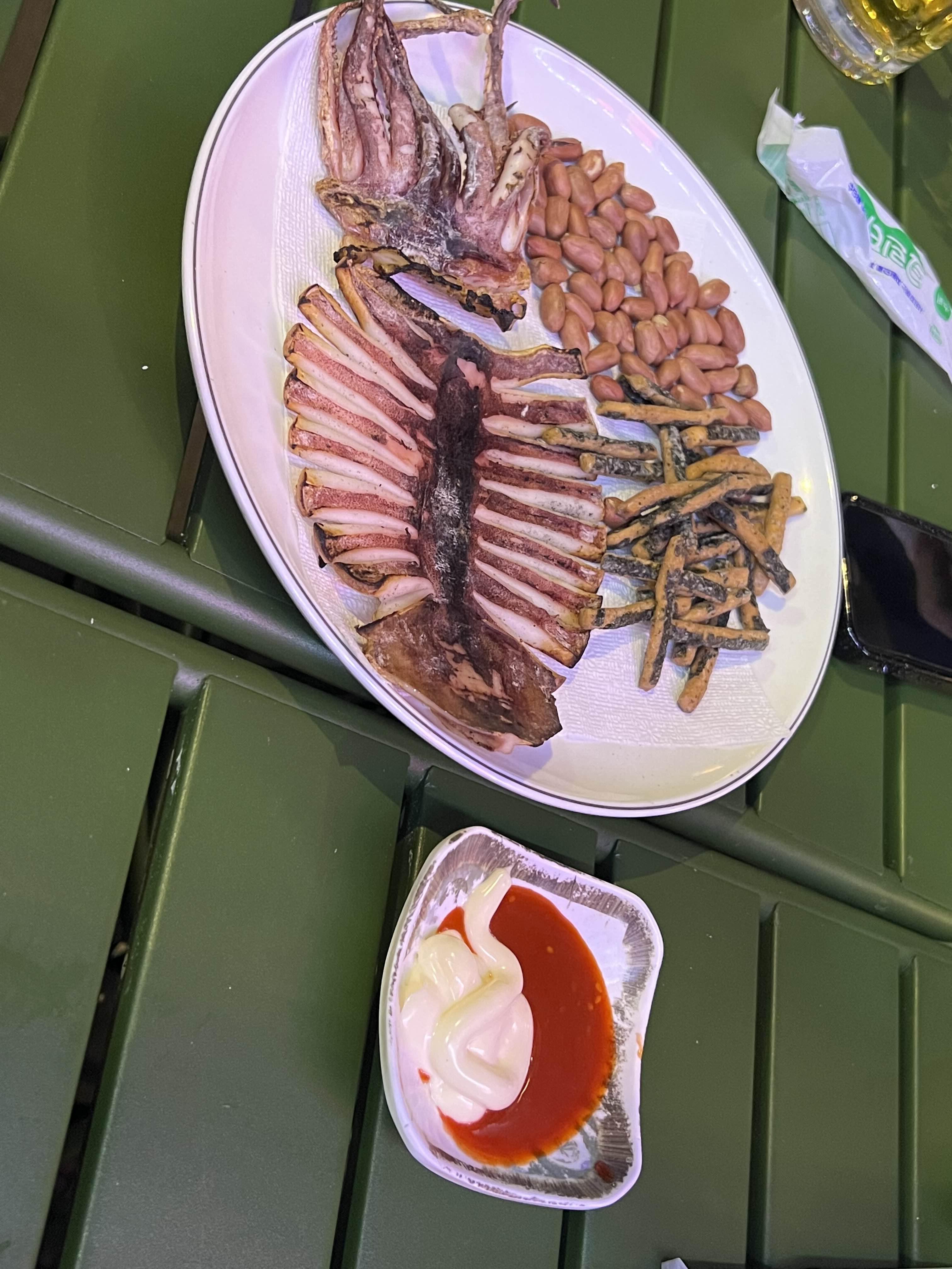 그리고 바로 집으로 가기 그래서 2차를 가기로 했습니다. 근처에 맥주집을 찾다가 노상으로 마시면 좋겠다 싶어서 좀 찾아봤는데 아침 아저씨가 혼자 맥주를 밖에서 드시길래 가봤습니다. 마침 아저씨가 자리를 내어주셔서 테라스에서 맥주를 마시게 됐습니다. 오거리에 있어서 맥주 한잔과 마른안주를 시켜서 먹었어요.