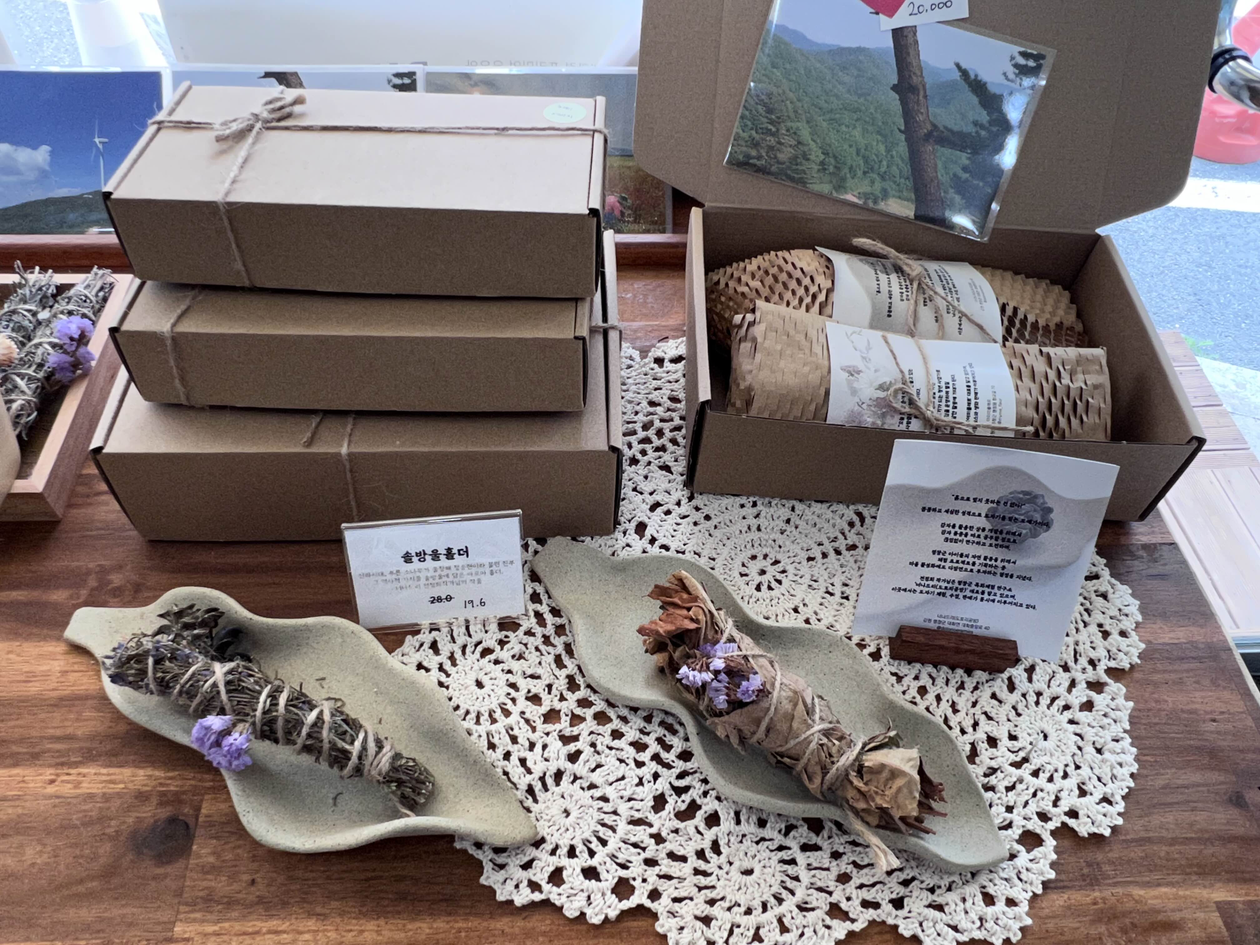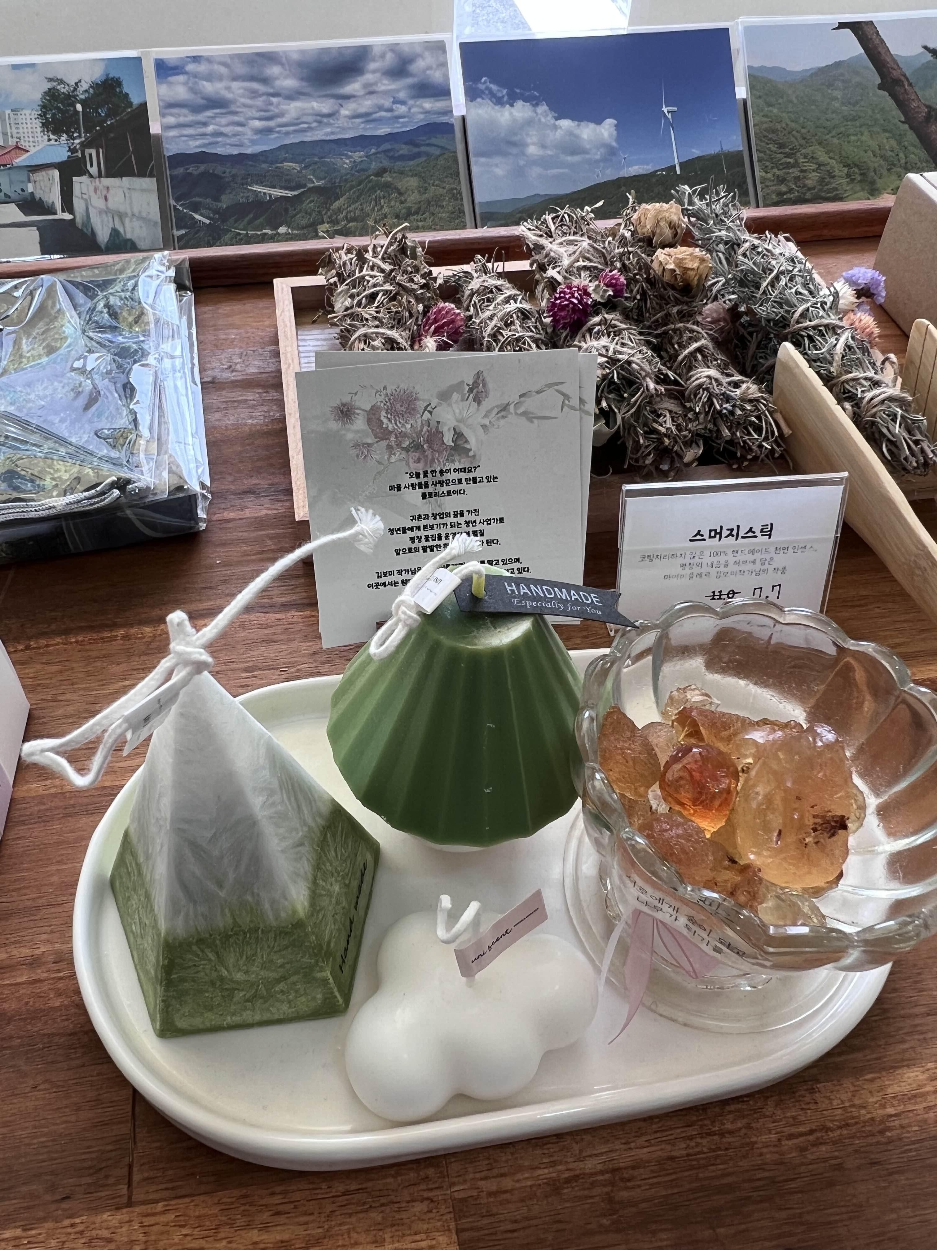 가게 안에는 특산물 소품들도 여러 개 팔고 있었는데 사장님이 제작하시는 건 아니고 평창에서 활동하시는 작가들이 만든 작품을 소개해주고 판매하시는 것 같았어요. 너무 이쁘고 좋아 보였는데, 이런 걸 만드는 클래스도 있어도 좋겠다는 생각을 했습니다. 아이들과 함께 만들어보면 여행이 더 재밌을 것 같았습니다. 혹시나 평창에 와서 지인들 선물을 사 갈 일이 있으면 하나 구매하셔도 좋을 것 같습니다.