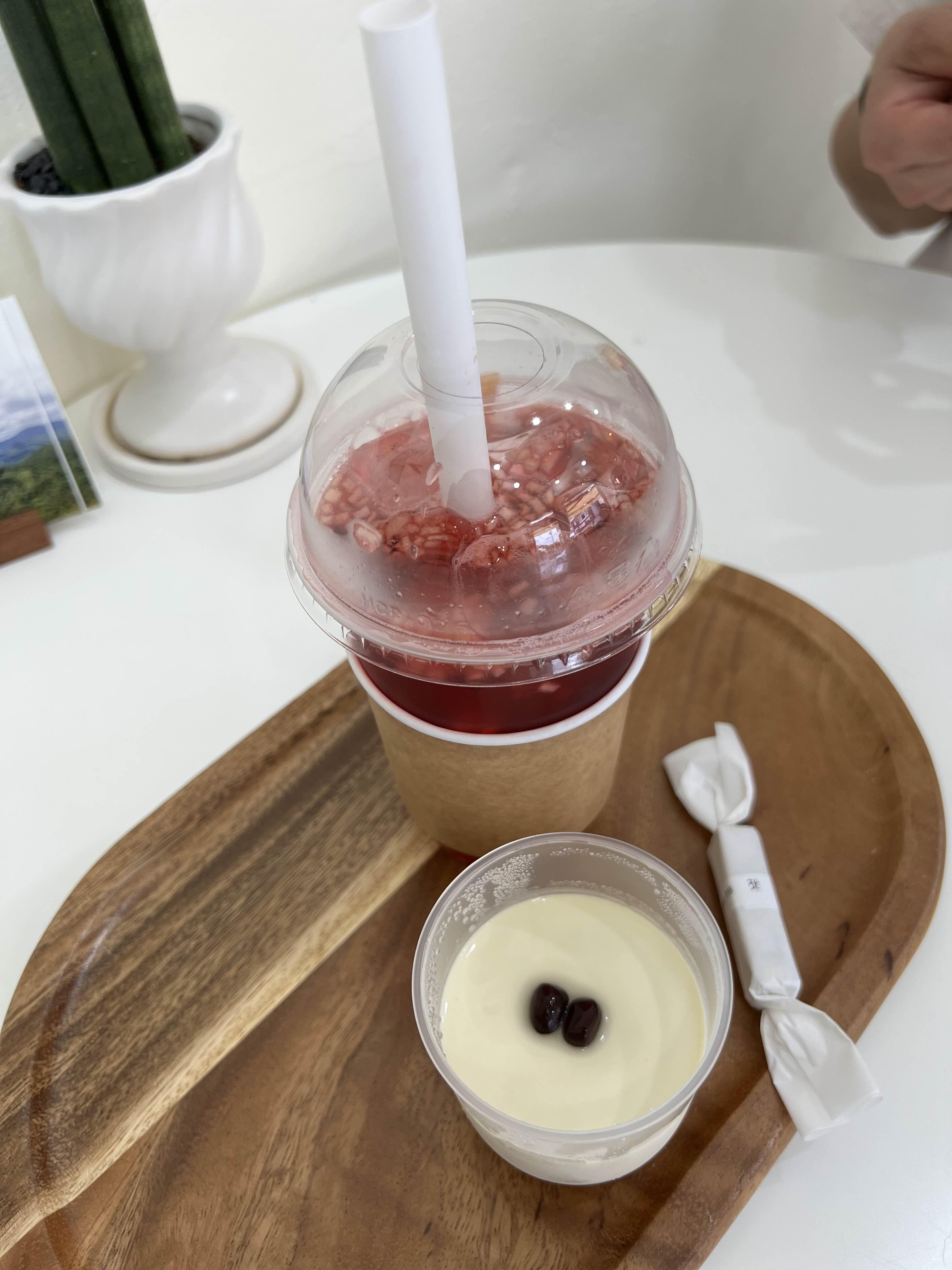 푸딩은 이렇게 있었는데 저는 고소한 맛을 좋아해서 서리태푸딩을 먹어보리고 했습니다. 그리고 음료는 히비스커스 사과에이드를 시키고 잣 캐러멜도 궁금해서 하나 구매했어요. 매장에 사람이 없어서 저희는 먹고 가기로 했습니다.