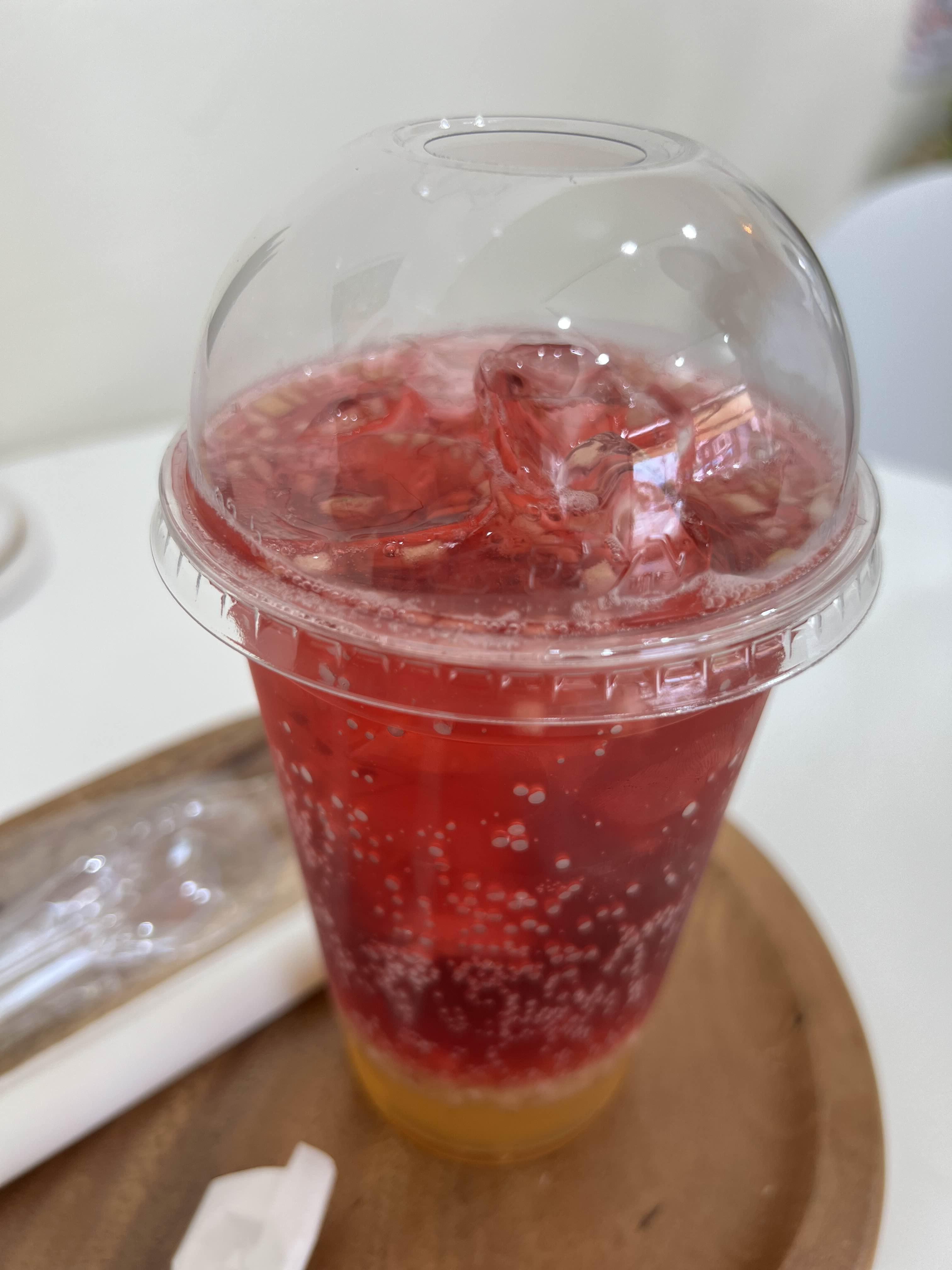 저희가 주문한 것들이 나왔습니다. 비주얼은 이렇게 생겼습니다. 히비스커스 사과에이드는 달콤하고 상쾌해서 입가심으로 너무나 좋습니다. 탄산이 강해서 청량감을 느끼기에 충분하고 사과알갱이가 들어가 있어서 더 좋았습니다. 커피를 많이 드셨다 하시는 분들은 히비스커스 사과에이드 추천드립니다. 저희도 아침부터 커피를 좀 마셔서 또 커피마시기에는 부담스러웠거든요.