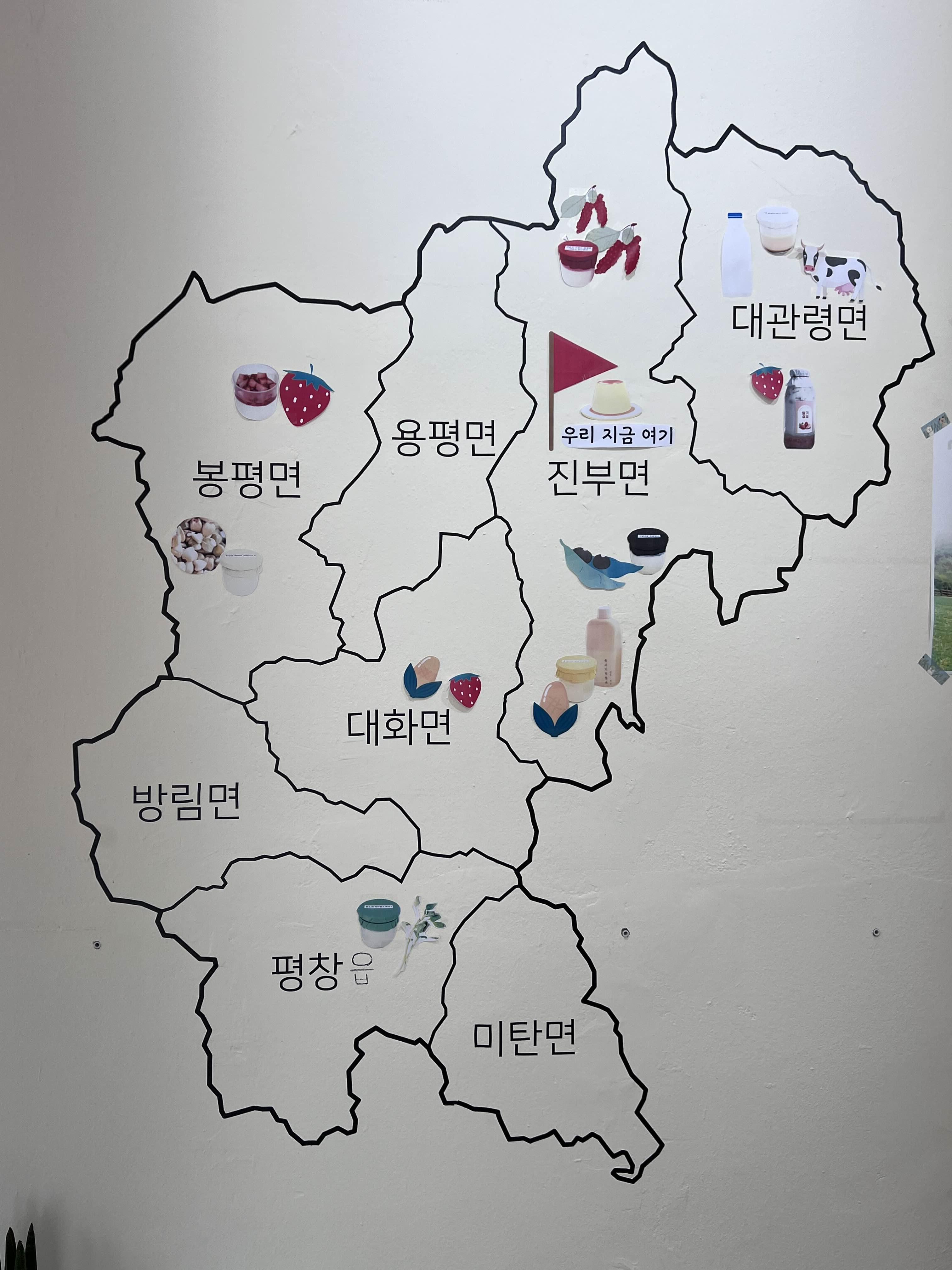 들어가면 평창군의 지도가 있고 각 면마다 나오는 특산품을 표시해놓았어요. 서리태도 있고, 딸기도 있고, 우유, 옥수수 등등 아주 많아요. 그 특산품을 가지고 여러 가지 연구로 푸딩도 만들고, 캐러멜도 만들고 하신 게 대단하다는 생각을 했습니다. 그리고 그 맛도 너무 궁금했어요.