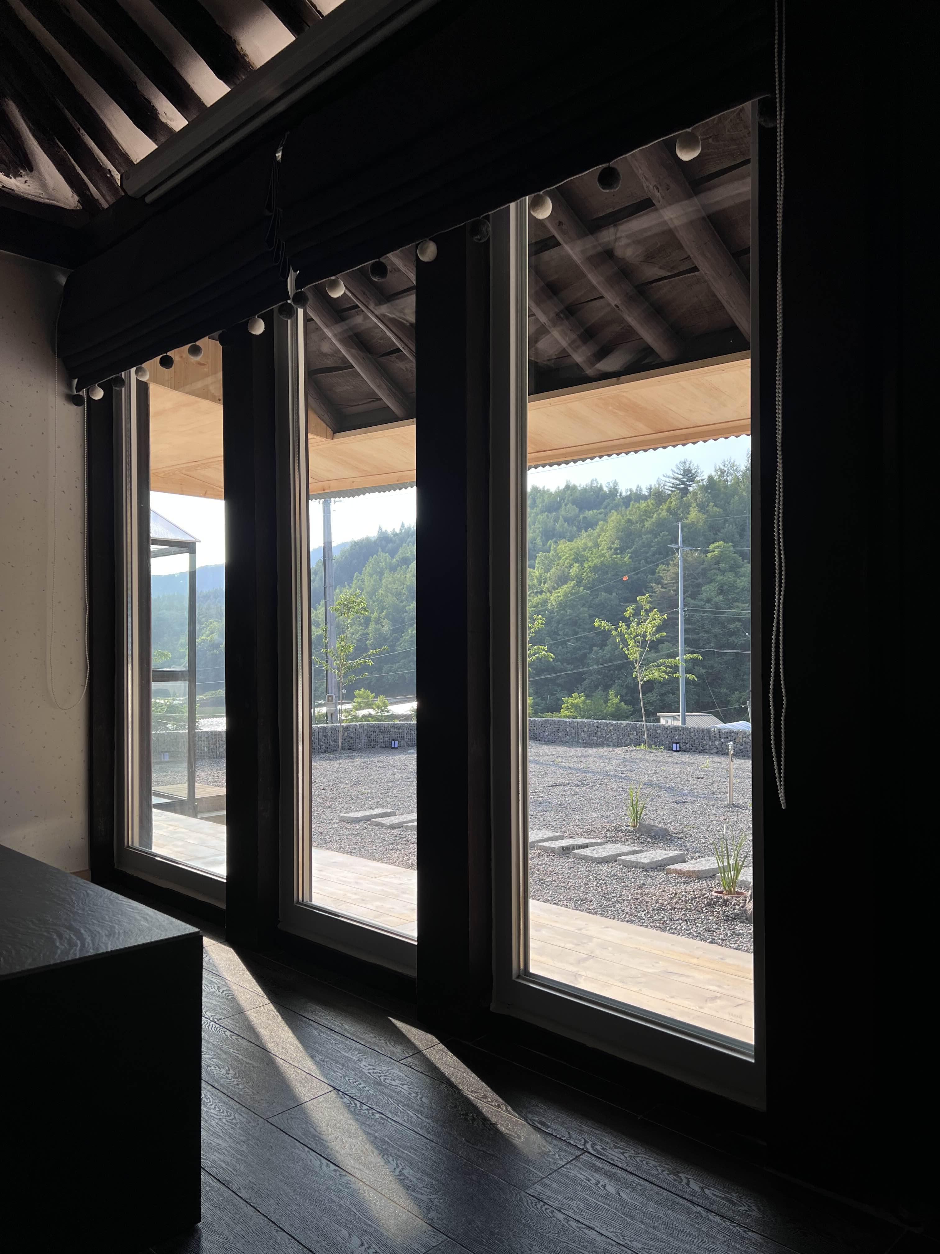뒷에는 모두 산으로 되어 있어서 아주 멋져요. 정말 촌캉스를 제대로 하러 온 것 같습니다. 건물은 길쭉하게 생긴 형태입니다. 개방성이 좋게 앞면은 대부분 유리로 되어 있어요. 내부에도 빛이 잘 들어오고 마당바닥이 잘 보여서 좋아요. 앉아 있으면 밖도 잘 보여서 좋더라고요. 물론 블라인드도 다 달려 있습니다.