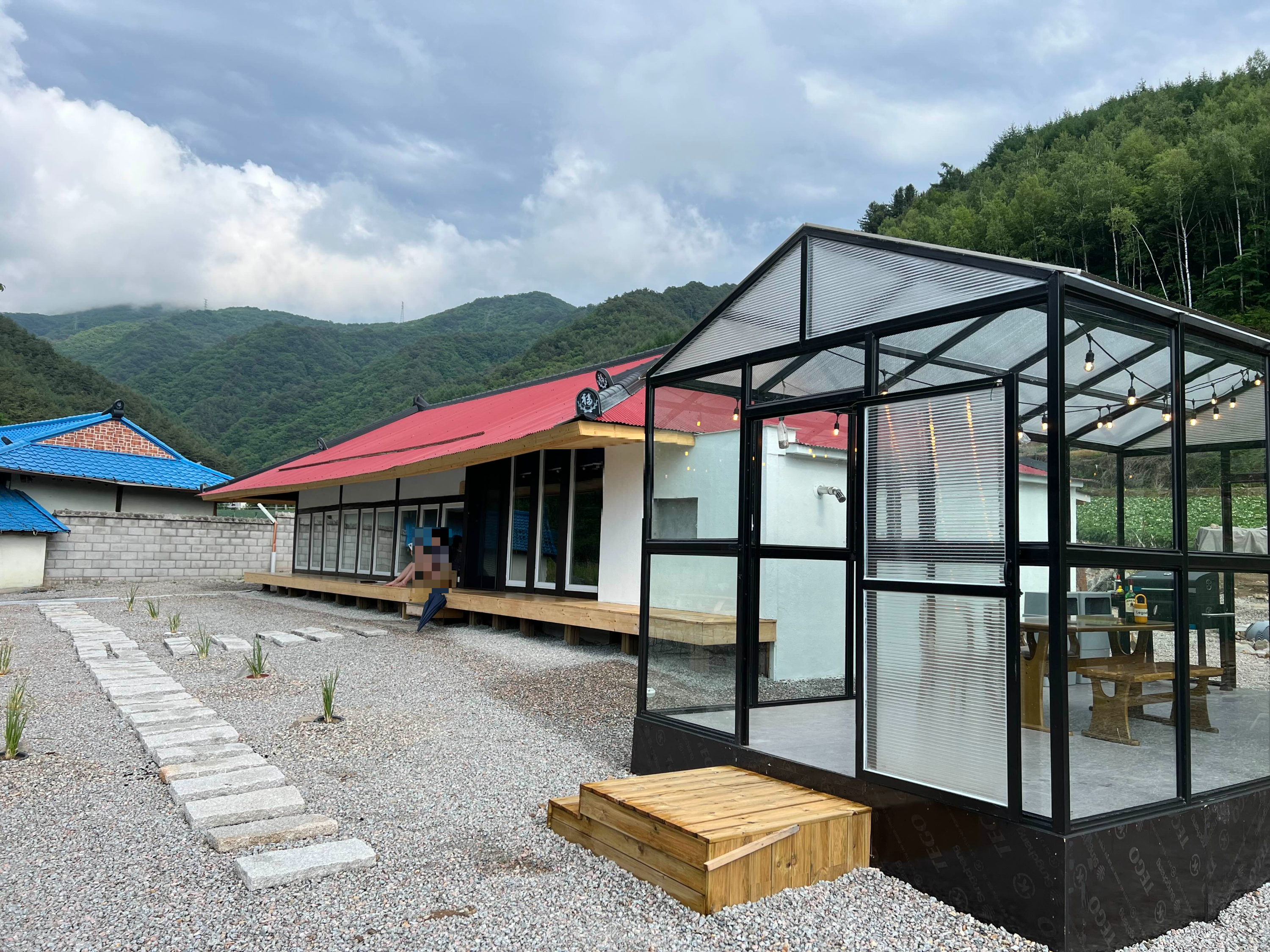 저희가 여기를 선택한 이유는 주변환경도 환경이지만 온실이 되어 있어서 비가 와도 밖에서 고기를 구워 먹을 수 있었다는 점입니다. 빗소리를 들으면서 술도 한잔하고 싶었고요. 딱 마침 온실이 있어서 너무 좋았어요. 근데 불행히도 비가 내리지 않음....