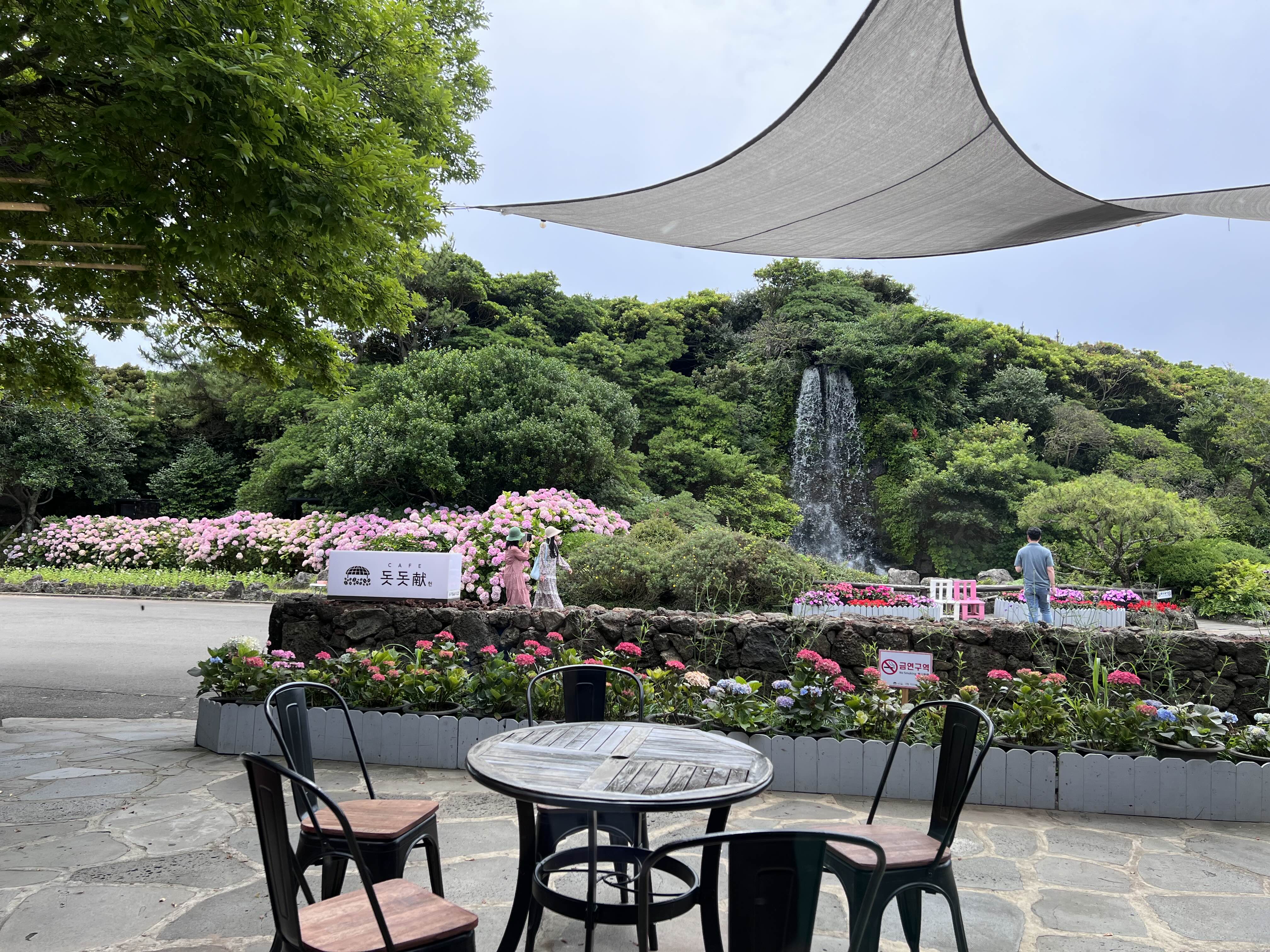 외부에는 이렇게 야외테이블이 있고 앞에는 수국과 인공폭포가 있어서 사람들이 사진을 많이 찍습니다. 카페뷰가 좋은 편 아닌가요? 꽃이 많이 피고 해서 날씨가 좋으면 야외테이블에서 여유롭게 쉬고 제주민속촌도 구경하시면 됩니다. 제주민속촌도 입장권이 그렇게 비싼 편이 아니기 때문에 아이를 데리고 제주도를 왔다면 한 번쯤은 방문해도 좋을 곳입니다. 특히 제주민속촌은 수국이 많이 있어서 사진 찍은 곳이 많습니다.