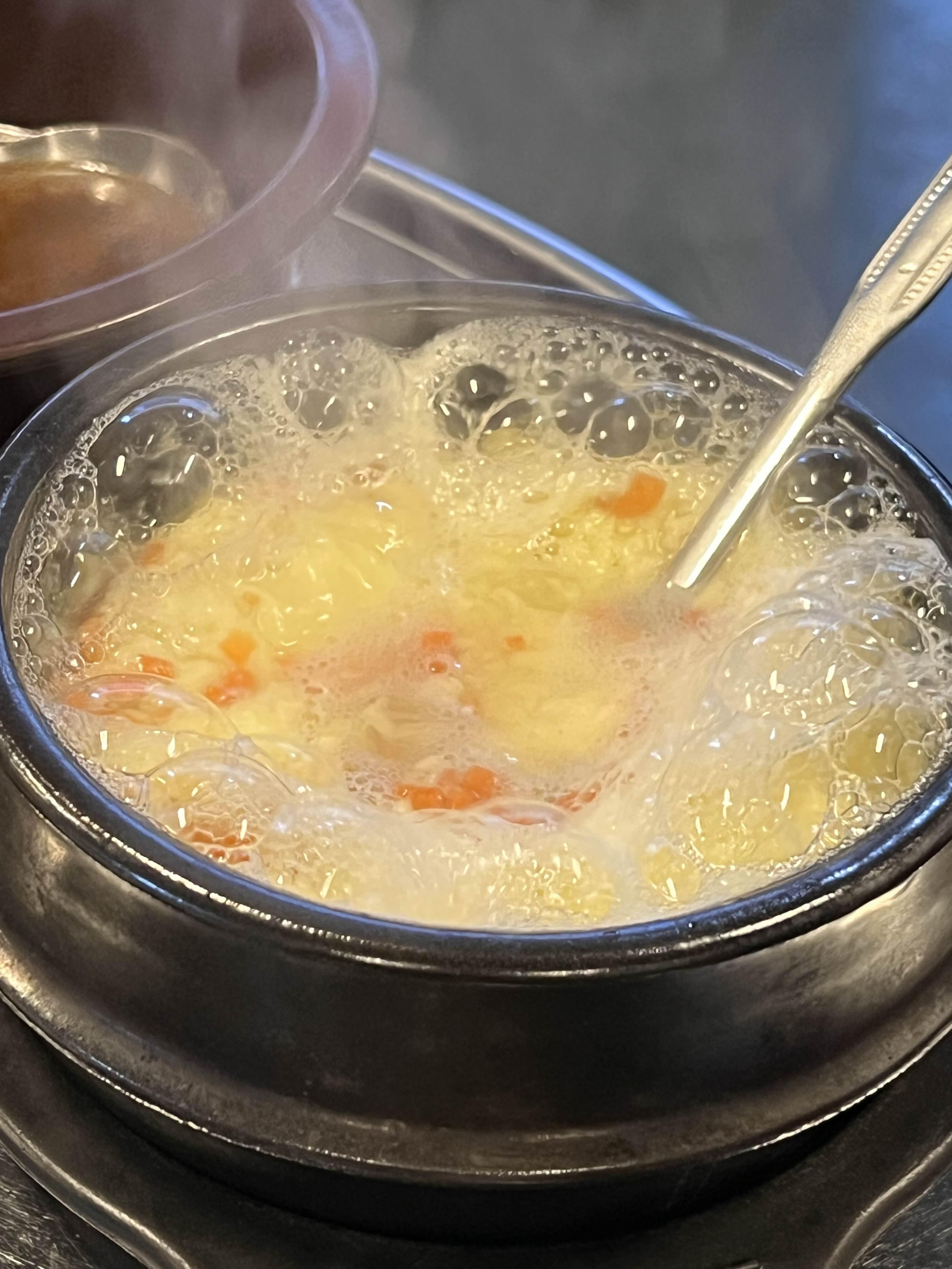 기본으로 계란탕이 나옵니다. 익혀서 나온 것이 아니라 불을 올려서 계란탕을 즉석에서 만들어요. 기다리는 동안 계란탕과 선지해장국이 나오는데 그걸로 허기를 좀 달래고 술 좋아하시는 분들은 한 잔 하고 계시면 됩니다. 그리고 부추를 한 사발 줍니다. (보기만 해도 침고임...)