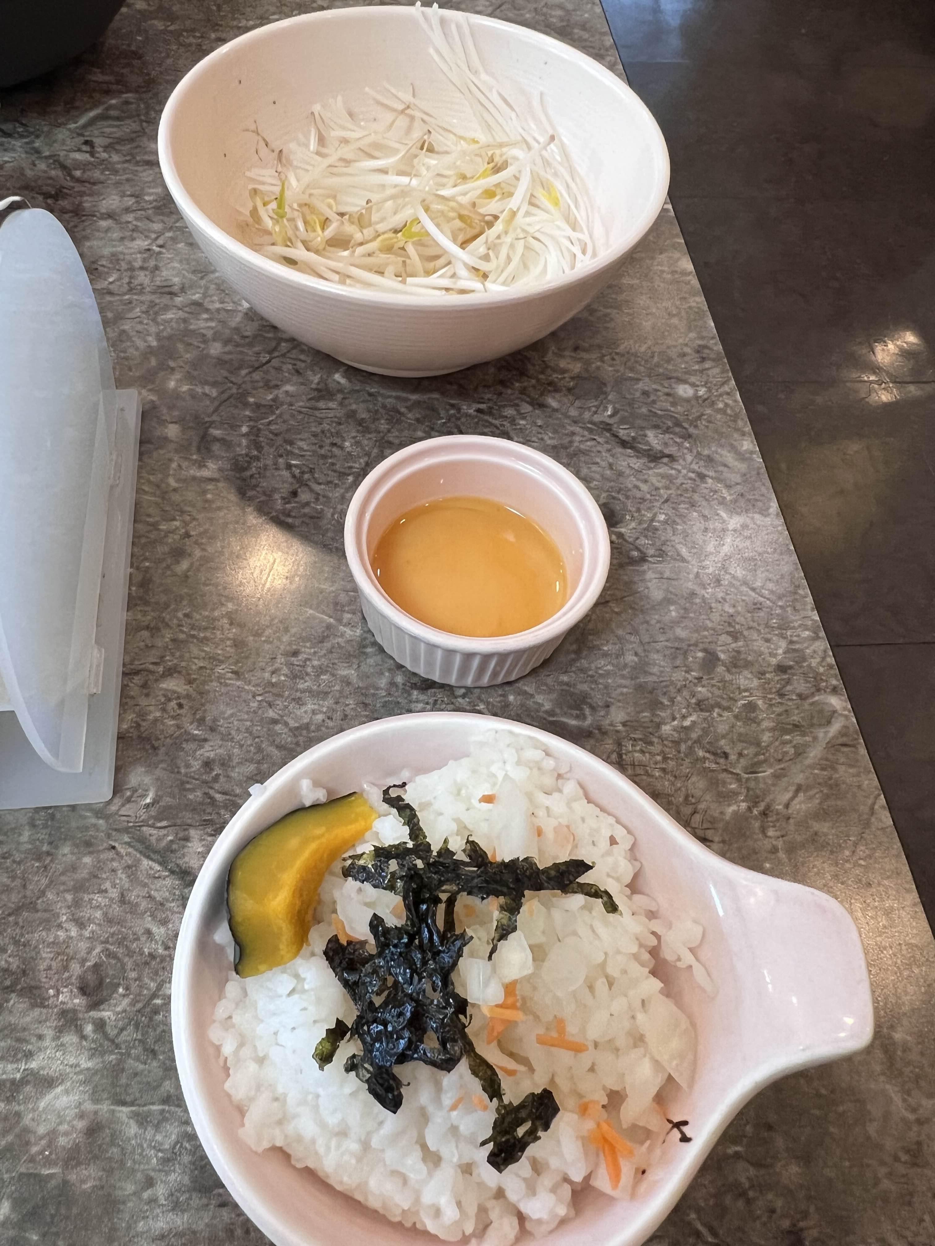이렇게 죽과 국수가 처음에 준비가 되는데 테이블 아래쪽에 넣어놓으니까 아래에서 꺼내서 만드시면 됩니다. 만약에 잘 못하겠다 싶으면 직원 불러서 요청해 주세요. 저희는 그냥 해서 먹었어요. 죽이 어느 정도 불면 준비된 계란도 넣어서 잘 익혀 드시면 됩니다. 죽과 국수도 먹고 나면 배가 너무 부릅니다. 그래도 다 먹고 일어나시면 됩니다.