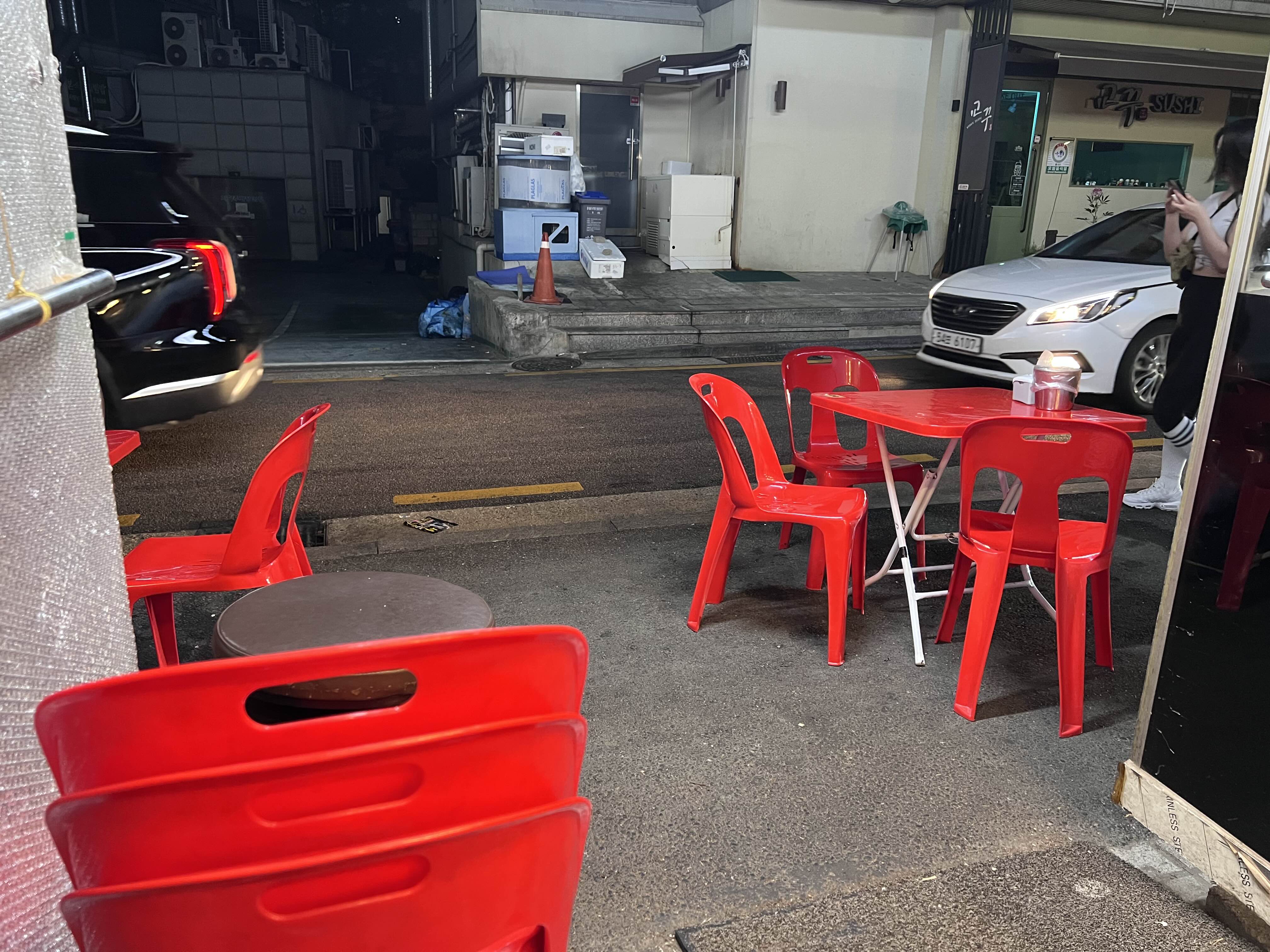 앞에 이렇게 빨간 야외테이블이 두 테이블이 있어서 야외에서 즐길 수도 있습니다. 저녁에 밖이 선선하다면 야외에서 즐기셔도 좋습니다. 저희도 야외에서 먹고 싶었으나 먹을 때는 다 앉아계셔서 안에서 먹었습니다. 옆집에는 봉구비어도 있고 청송산오징어도 있어서 사람들이 북적북적합니다. 만약 북적대거나 자리가 없다면 포장해서 집에서 드시는 것도 추천드립니다. 미리 전화로 포장예약하고 받아서 가시면 아주 좋습니다.