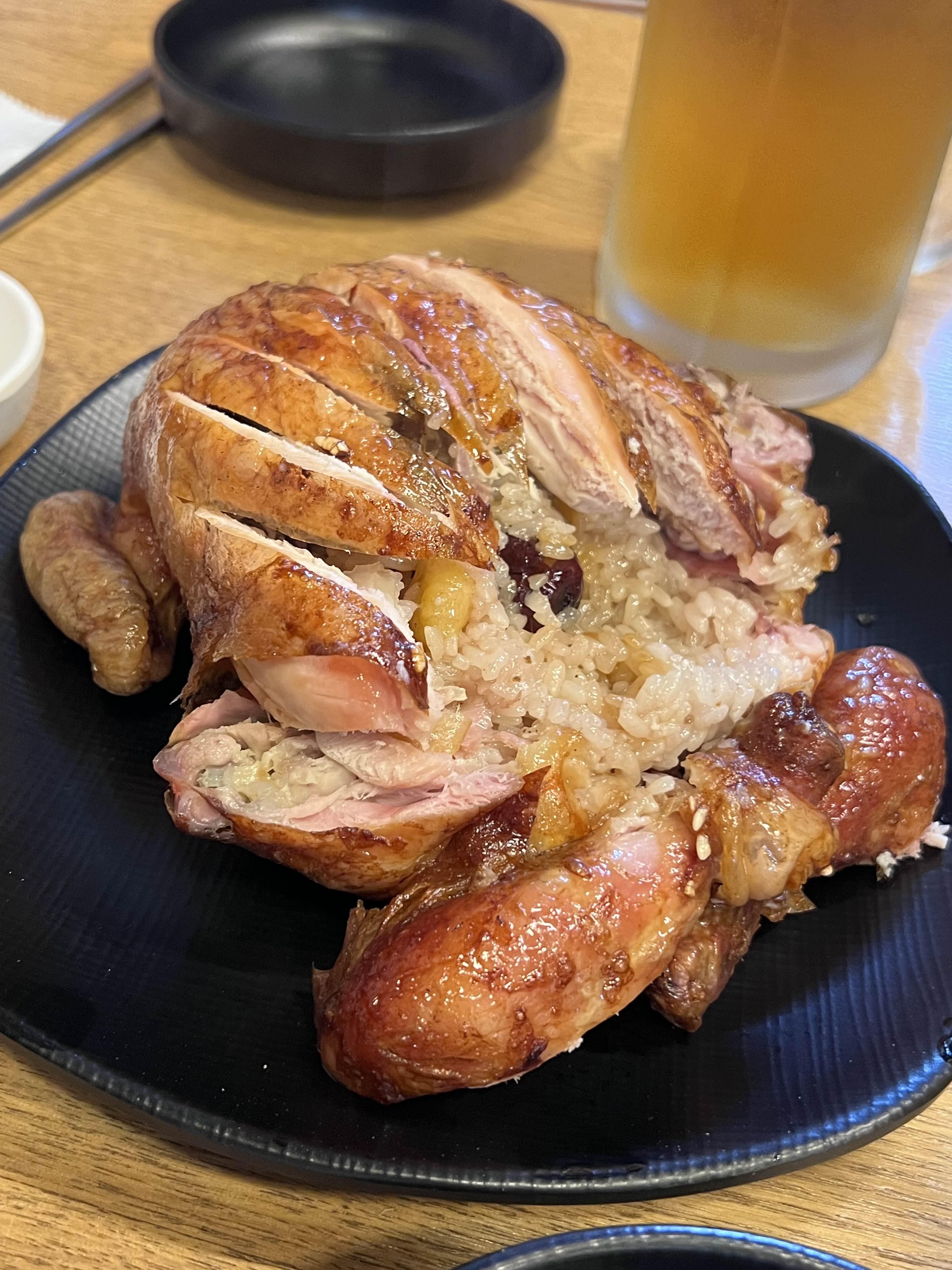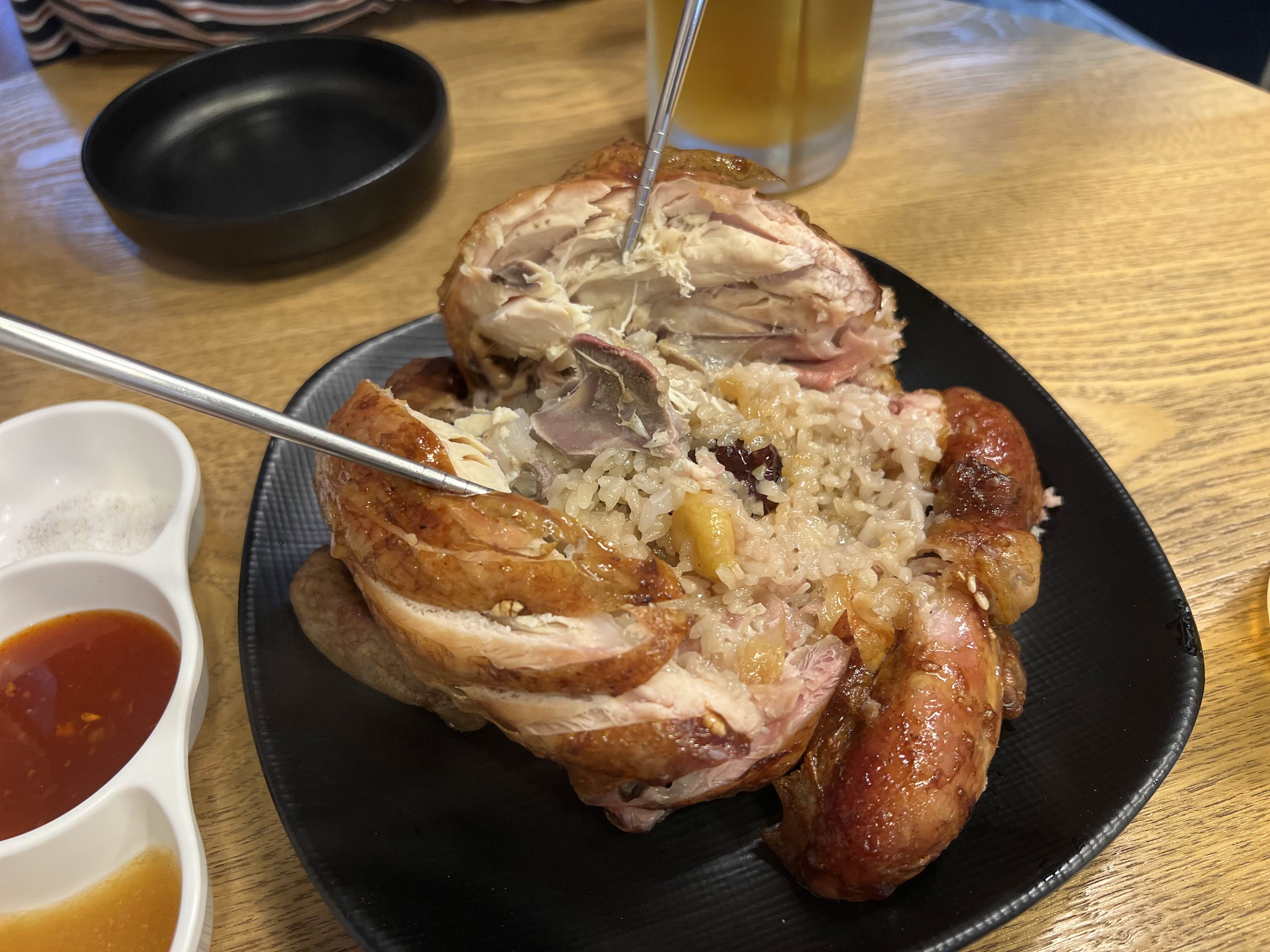 샐러드에 맥주를 즐기면 어느새 맥주가 반잔으로 줄고, 치킨님이 나오십니다. 치킨은 백숙처럼 안에 밥과 은행, 대추 등이 들어있어요. 이 정도면 몸보신으로 백숙대신 치킨을 먹는 것도 말이 될 것 같습니다. 중복이나 말복에 백숙이 지겹다면 장작구이 드시는 것도 좋겠군요. (중복에는 장작구이다!)