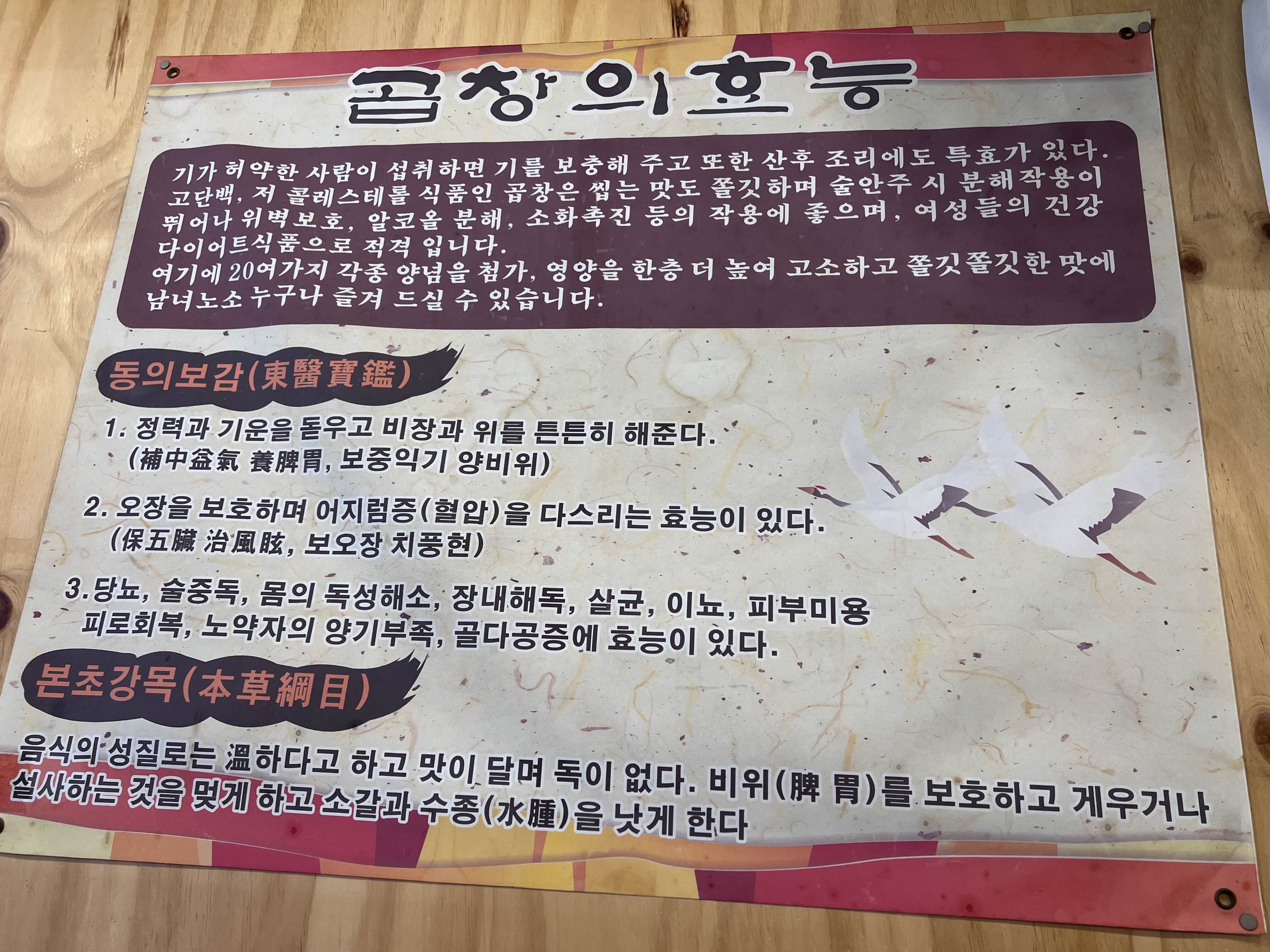 고작 20분 걸어서 온 이 곳에서 곱창의 효능을 보고 난 당뇨, 술중독, 몸의 독성해소 등등의 효과를 보겠군. 건강 챙겨서 간다는 둥 자기 합리화를 시작하게 됐다. 몸에 안 좋은 음식은 없다.ㅋㅋㅋㅋㅋ