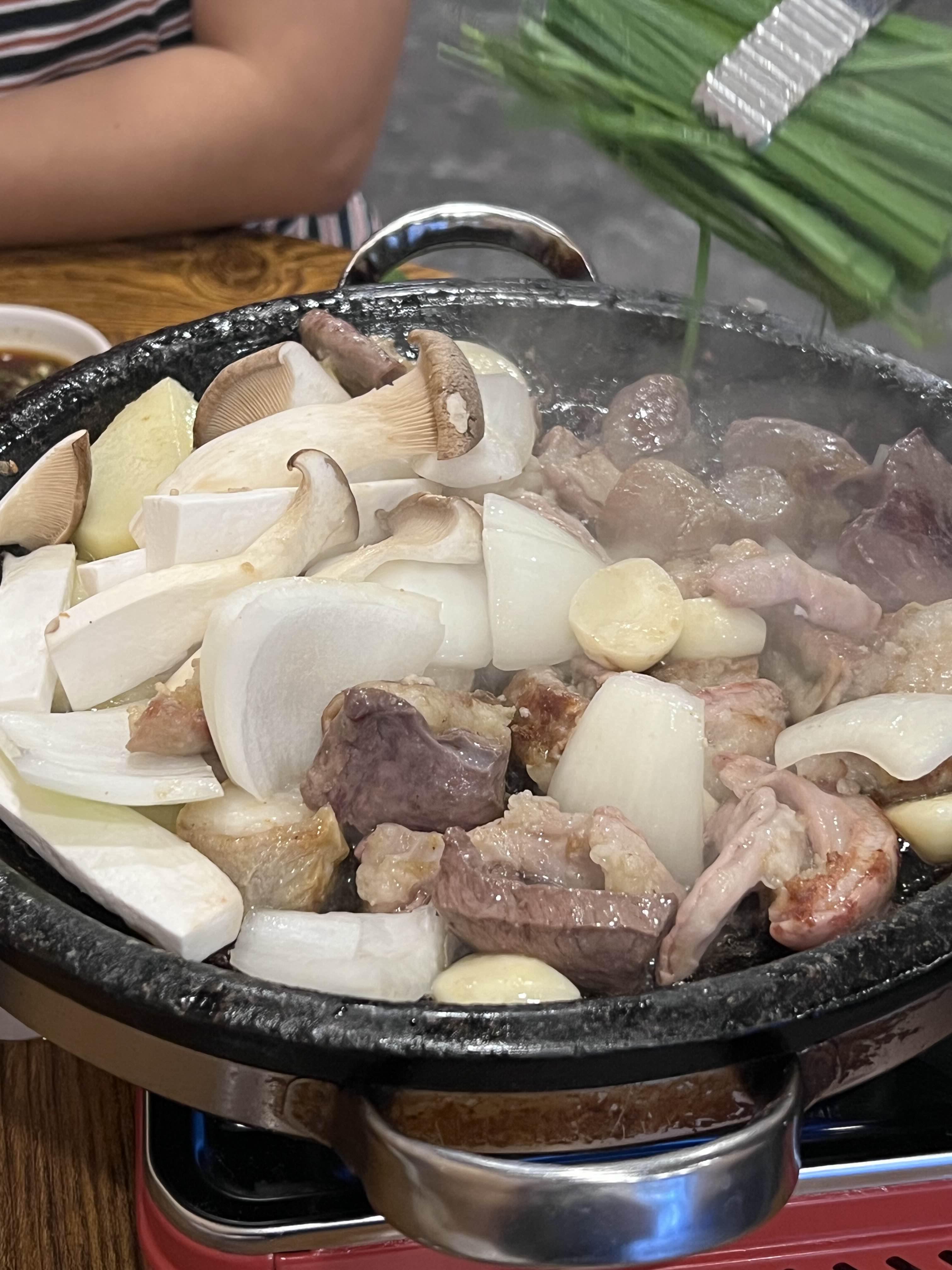 이곳의 좋은 점은 굽는 팬의 구석에 구멍이 있어서 중간중간에 아주머니가 기름을 쭉~~ 빼주신다. 기름기가 너무 많아서 싫어하는 사람이나 먹다 보면 기름이 너무 많아서 니글거리는 사람은 중간에 기름을 쭉 빼고 먹으면 도움일 된다. 그래서 원래는 2인분 먹고 볶음밥을 먹으려고 했는데 (느끼했으면 볶음밥 시켰을 것) 별로 느끼하지 않아서 모둠곱창 1인분을 더 시켰다.