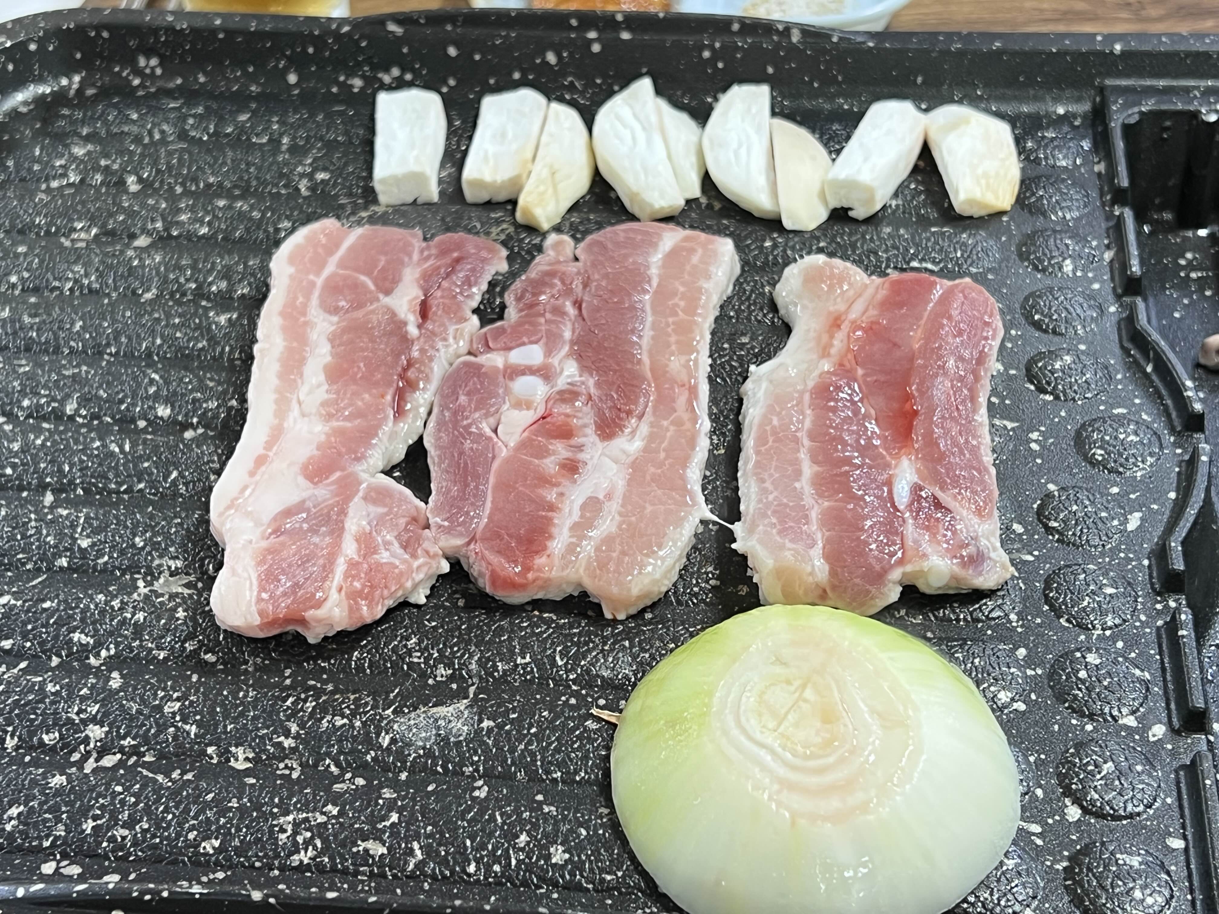 본격적인 굽기 시작! 양파랑 버섯올리고 나중에 김치도 좀 올려줍니다. 기름이 빠지는 판으로 되어 있어서 아래쪽에 김치 올리고 마늘 올리고 해서 먹으면 맛있습니다. 고기도 처음에 소금으로 바로 먹다가 쌈장에 싸서 드시길 추천드립니다.