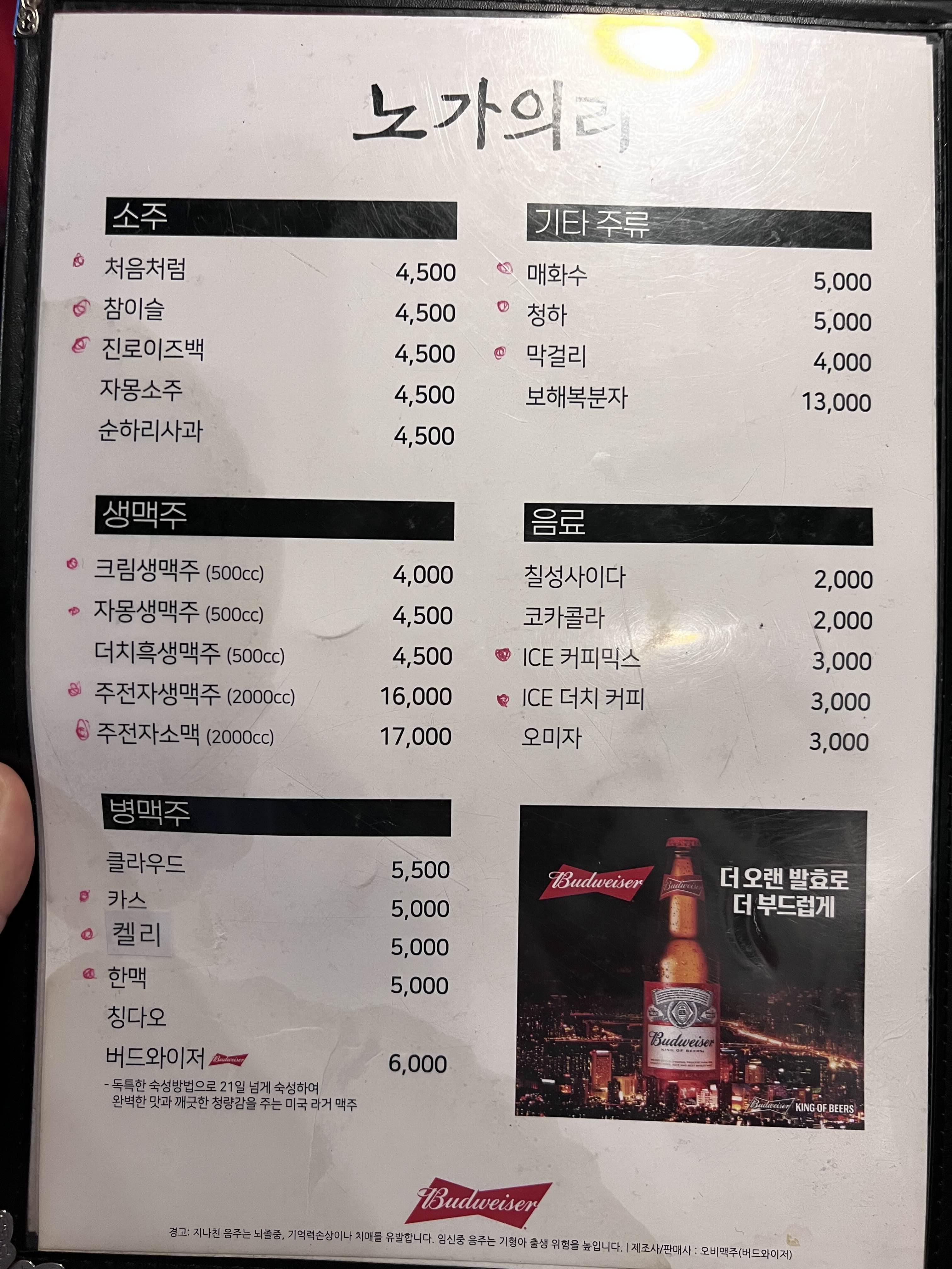 오늘은 야간 관악산 다녀와서 내려와서 시원하게 맥주 한 잔 할 수 있는 곳을 소개해드릴게요. 최근에 방문한 노가의리라는 곳입니다. 가볍게 2차로 가기 좋은 곳인데요, 야간에 시원하고 서늘한 시간에 들리면 더 좋습니다. 이곳을 지날 때마다 많은 사람들이 안팎으로 앉아서 맥주를 마시는 모습을 자주 볼 수 있습니다. 날씨가 좋을 때는 밖에 테이블을 깔아 두기도 합니다.