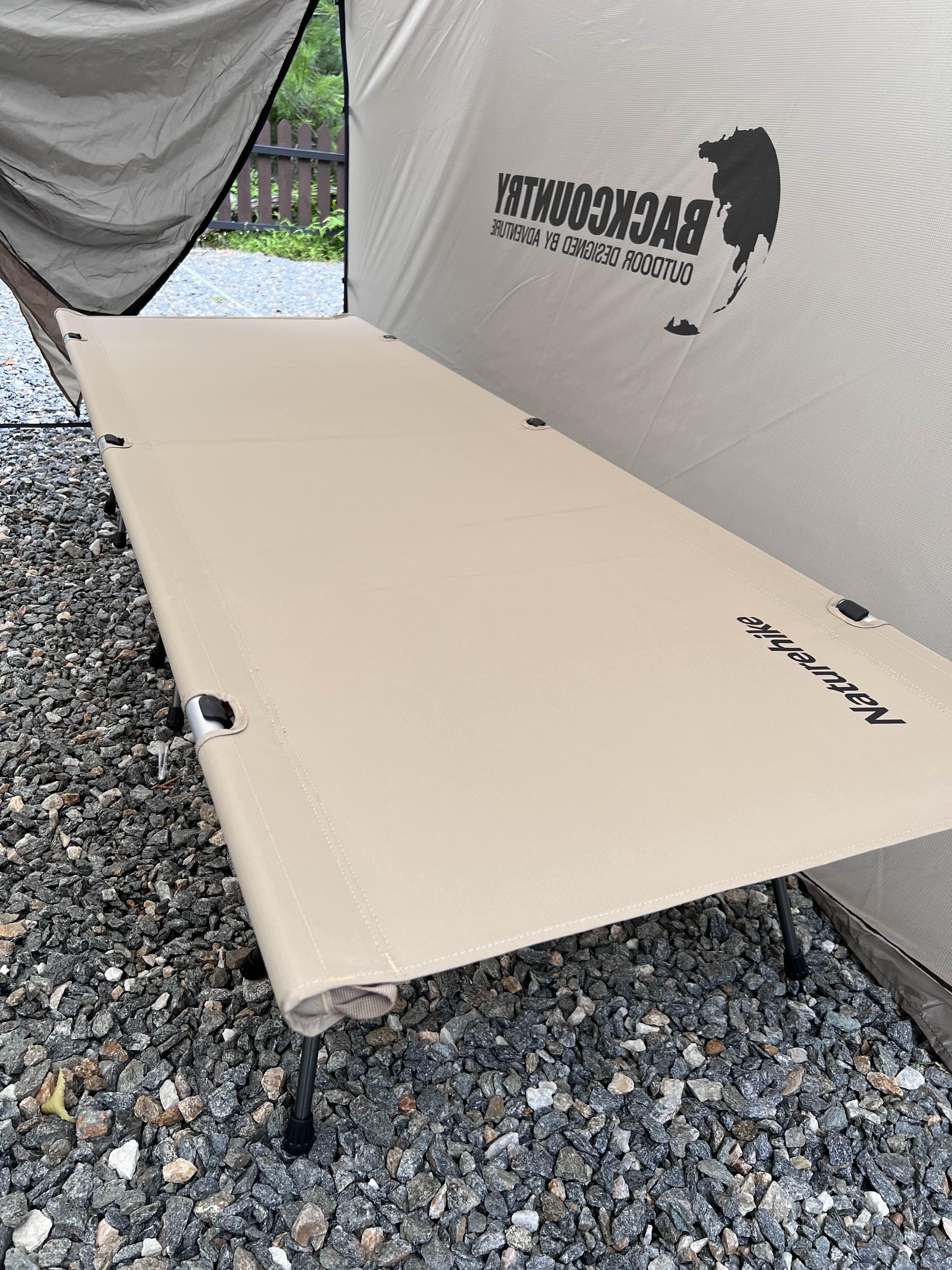 완성된 네이처하이크 야전침대의 모습입니다. 그리고 백컨트리 웜그레이 색입니다. 색이 잘 어울리죠? 블랙으로 사도 잘 어울렸을 텐데 분위기가 좀 더 어두웠을 것 같아요. 밝은 색으로 사니까 좀 더 화사한 느낌입니다. 저는 캠핑용품 사면 거의 다 블랙으로 구매했는데 가끔 이런 화사한 베이지 컬러도 구매해도 좋은 것 같아요! 블랙만 사시는 분들은 베이지도 한번 고려해 보세요!