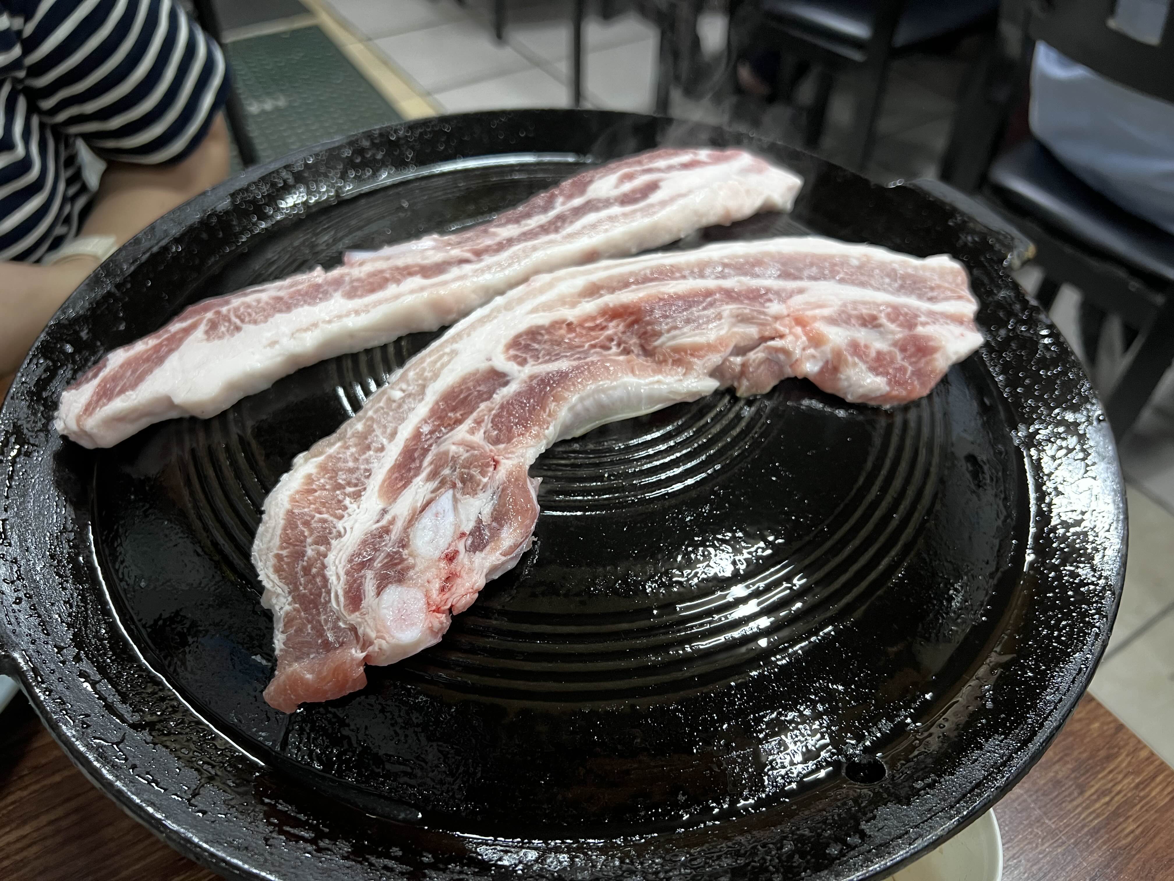 저희는 2인분 시켰고, 이렇게 냉장삼겹살이 나옵니다. 고기가 신선해 보여요. 고기는 어디 근처에서 따로 받아오시는 듯합니다. 이 날도 삼겹살이 많이 나갔는지 급하게 고기를 주문하시더라고요. 일단 빛깔은 합격!