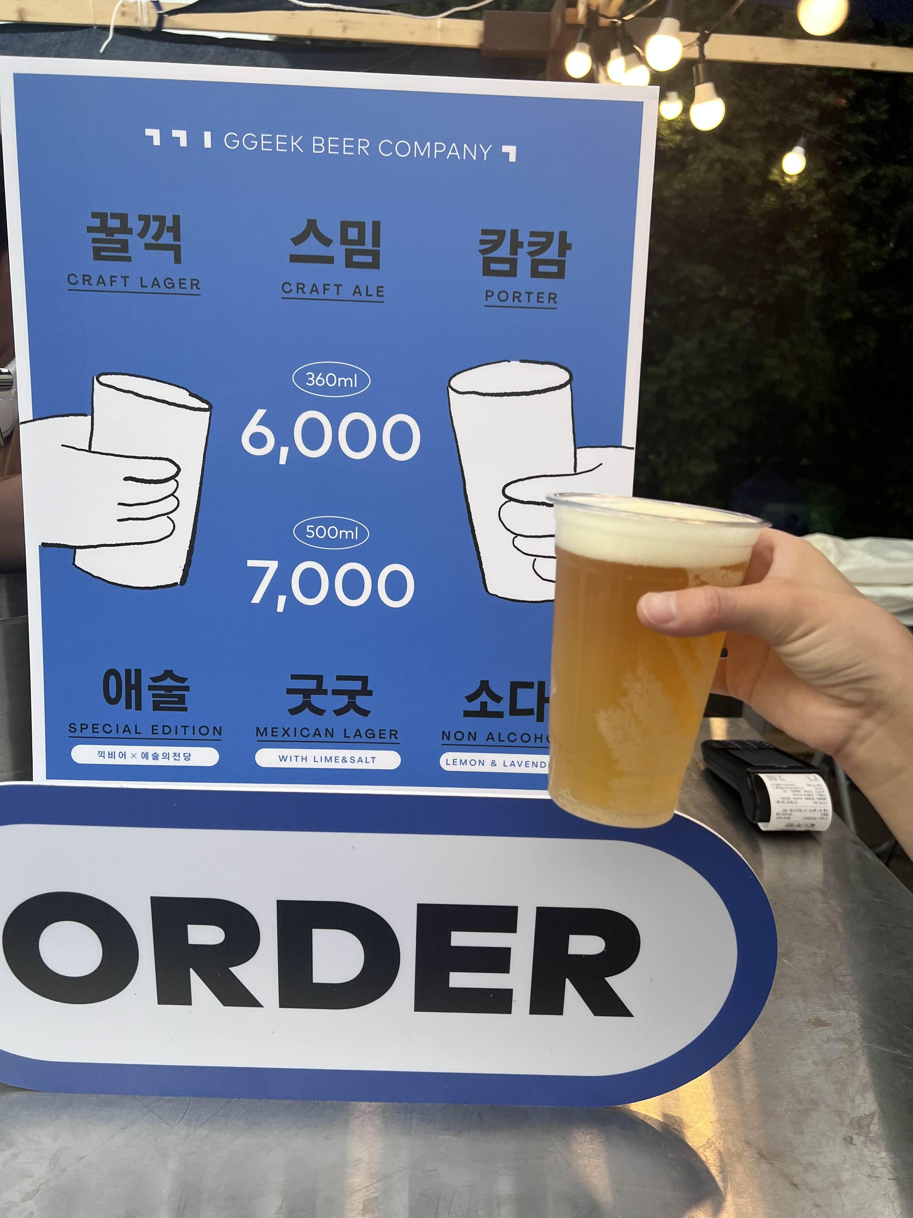 공연을 기다릴 겸 저녁을 먹을 게 있을까 하고 봤는데 끽비어에 맥주랑 버거를 팔고 있었어요. 끽비어는 작년에도 전당이랑 같이 콜라보를 한것으로 알고 있는데 올해도 같이 콜래보레이션을 해서 맥주를 선보였습니다. 특히나 맥주의 라벨도 유명 디자이너가 디자인해서 더 유니크함을 더 했습니다. 관심있으신 분들은 맥주 보틀을 구매하셔서 따로 집에 사가셔도 좋을 것 같아요! 저는 그냥 버거랑 먹으려고 잔으로 받았습니다.