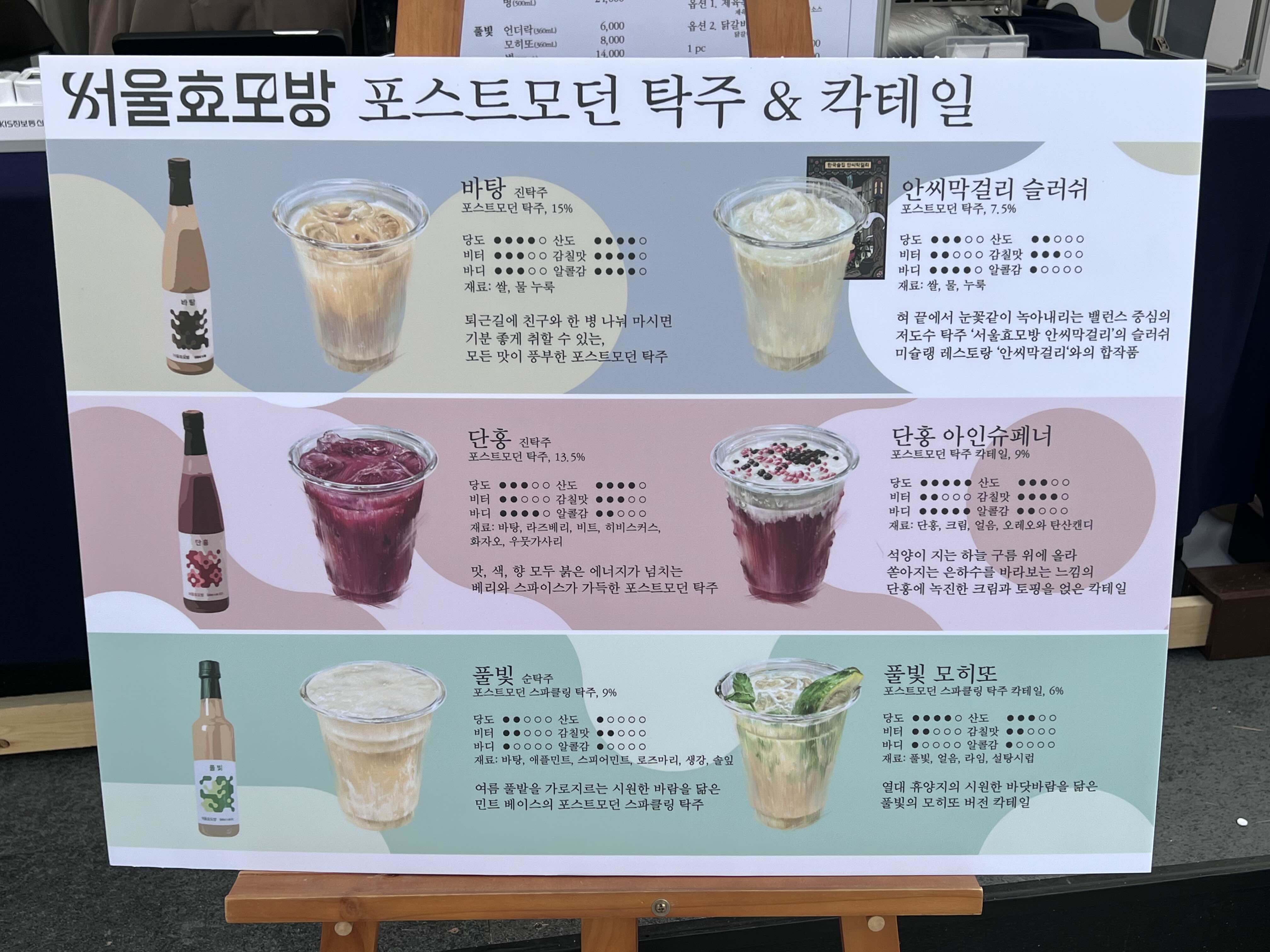 맥주를 먹고 전통주 포스트모던 탁주와 칵테일에 관심이 생겼어요. 막걸리도 좋아하긴 하지만 포스트모던 탁주라니 관심이 생길 수밖에 없습니다. 슬러쉬나 아인슈페너, 모히또 등 탁주를 칵테일처럼 만든 것도 신기해서 맛이 궁금해졌어요. 무엇을 마셔볼까 하다가 저는 좀 진한 바탕을 언더락으로 마시기로 했습니다. 탁주는 병으로도 판매하니 따로 구매해 가셔도 괜찮을 것 같아요!