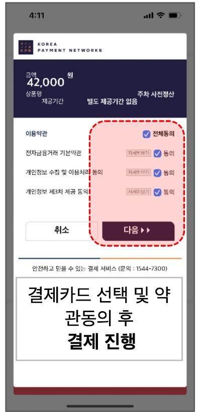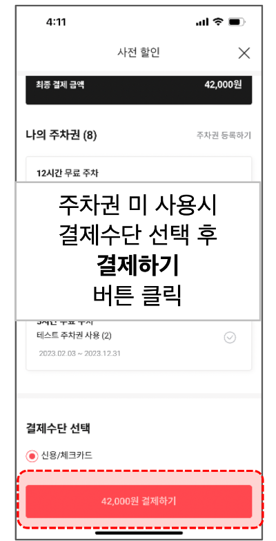 주차권이 없다면 공연할인을 확인하시고 결제를 하시면 됩니다. 결제하기를 누르면 본인의 카드앱으로 결제가 가능합니다. 이다음부터는 어렵지 않아요.