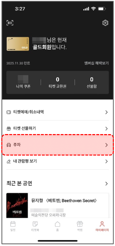 주차정산을 위해서는 마이페이지에서 주차를 눌러주세요.