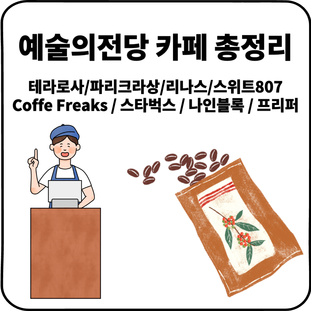 먼저, 예술의전당안에는 테라로사, 파리크라상, 리나스, 스위트 807 등의 카페가 있습니다.