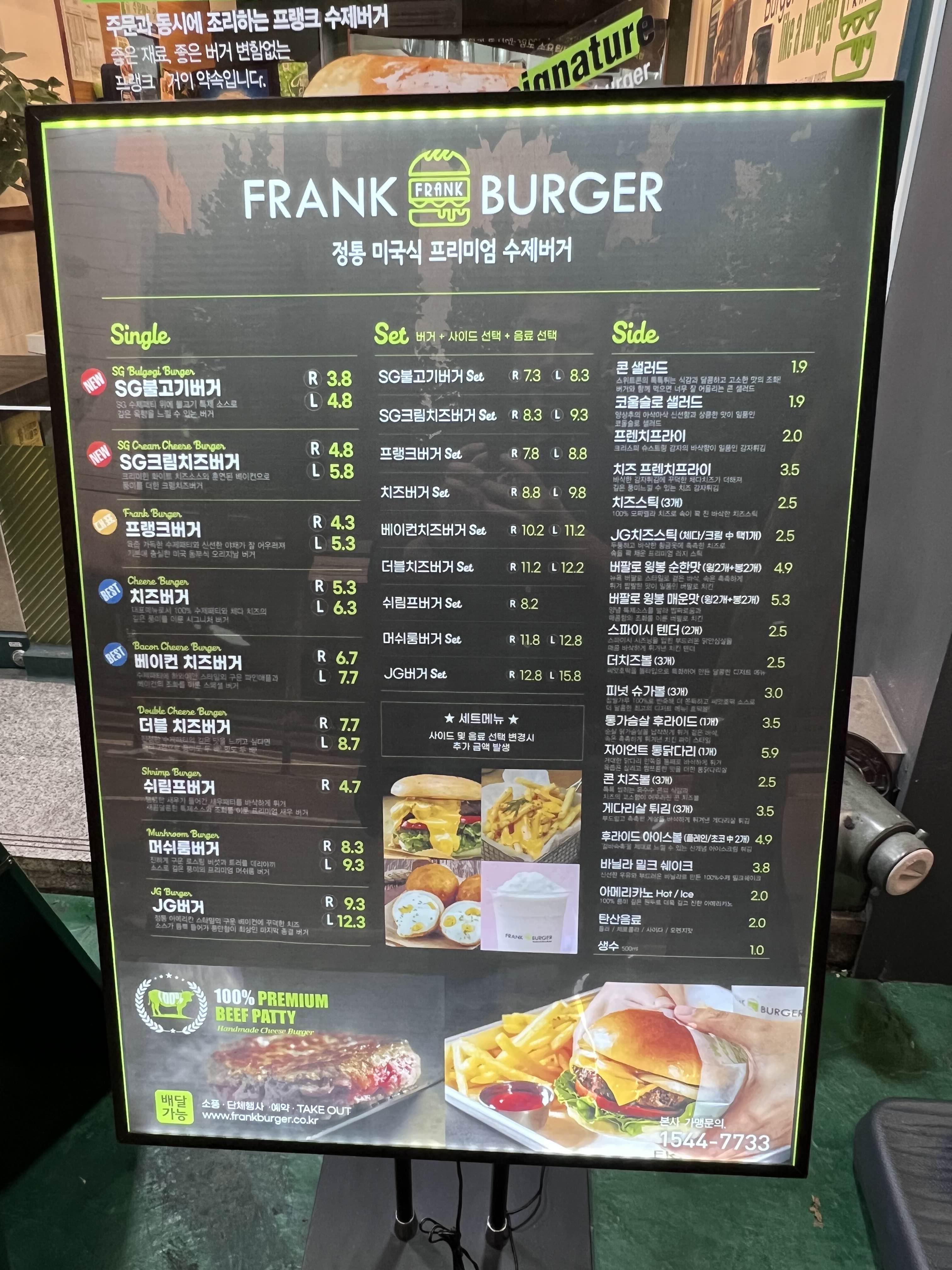 요즘 퇴근 후에 교육을 듣는 것이 있어서 급하게 식사를 해야 할 때가 있습니다. 여유 있게 식사를 하기가 어려워서 간편하게 빠르게 먹을 수 있는 것을 찾다 보니까 햄버거를 떠올렸는데 맥도널드나 버거킹 보다도 좀 더 수제버거에 가까운 프랭크버거를 먹어보게 되었습니다.