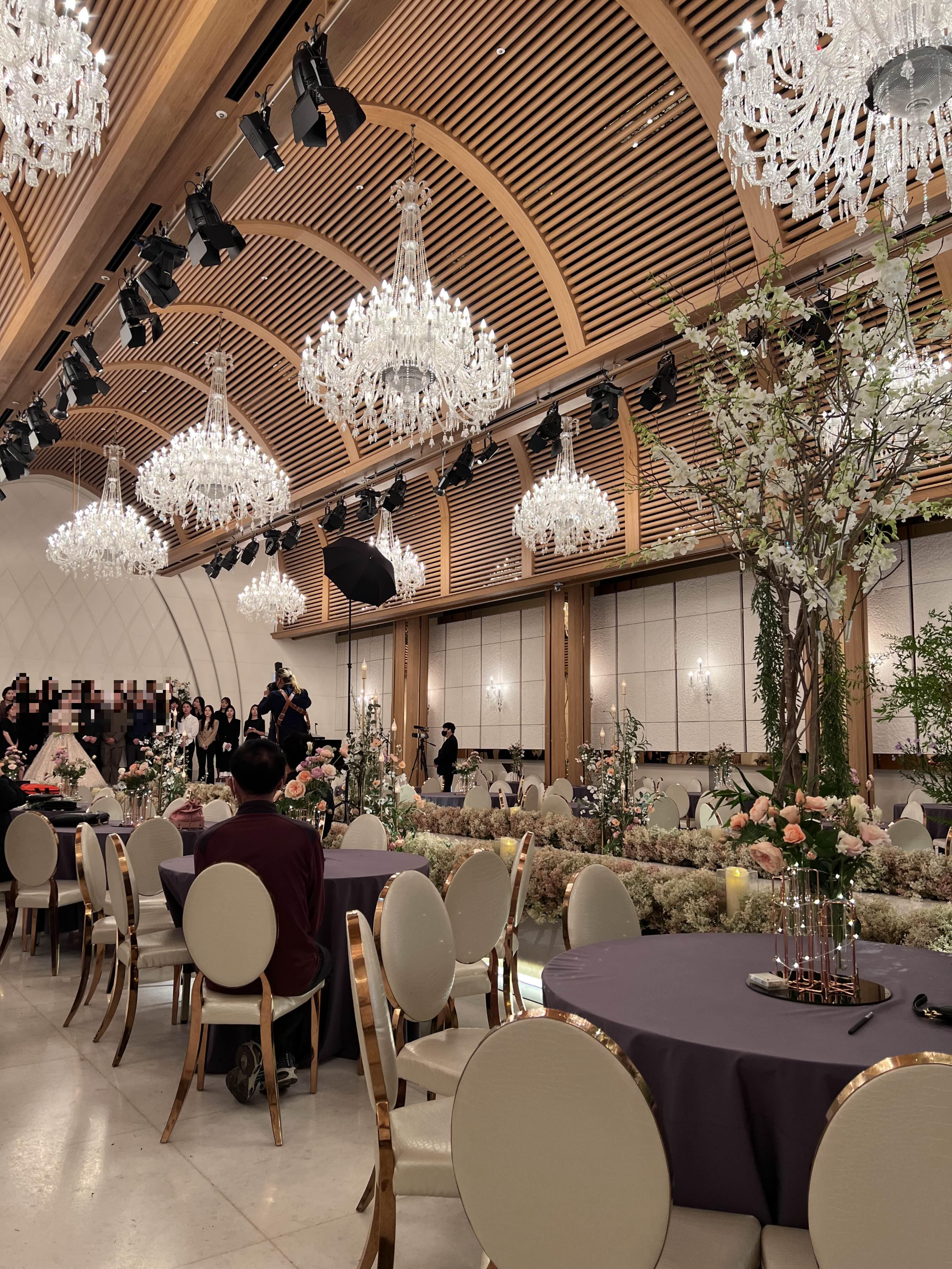 웨딩홀 내부에는 샹들리에가 있어서 더 분위기가 좋아보였어요. 다만 내부에 테이블 및 의자가 부족해서 많은 사람들이 뒤에서 서서 보았어요. 제가 생각했을 때의 적정 인원은 신랑/신부측에서 150명씩 부르는게 좋지 않나 싶어요. 이 때 친구 결혼식에는 총 450명 정도가 왔는데 공간이 부족해서 일찍 식사하러 가시는 분들도 꽤 있었습니다. 어르신들 지인도 다 오고 친구들도 많으신 분들은 식권도 넉넉하게 준비하시고 융통성있게 준비하시면 더 좋을 것 같네요.