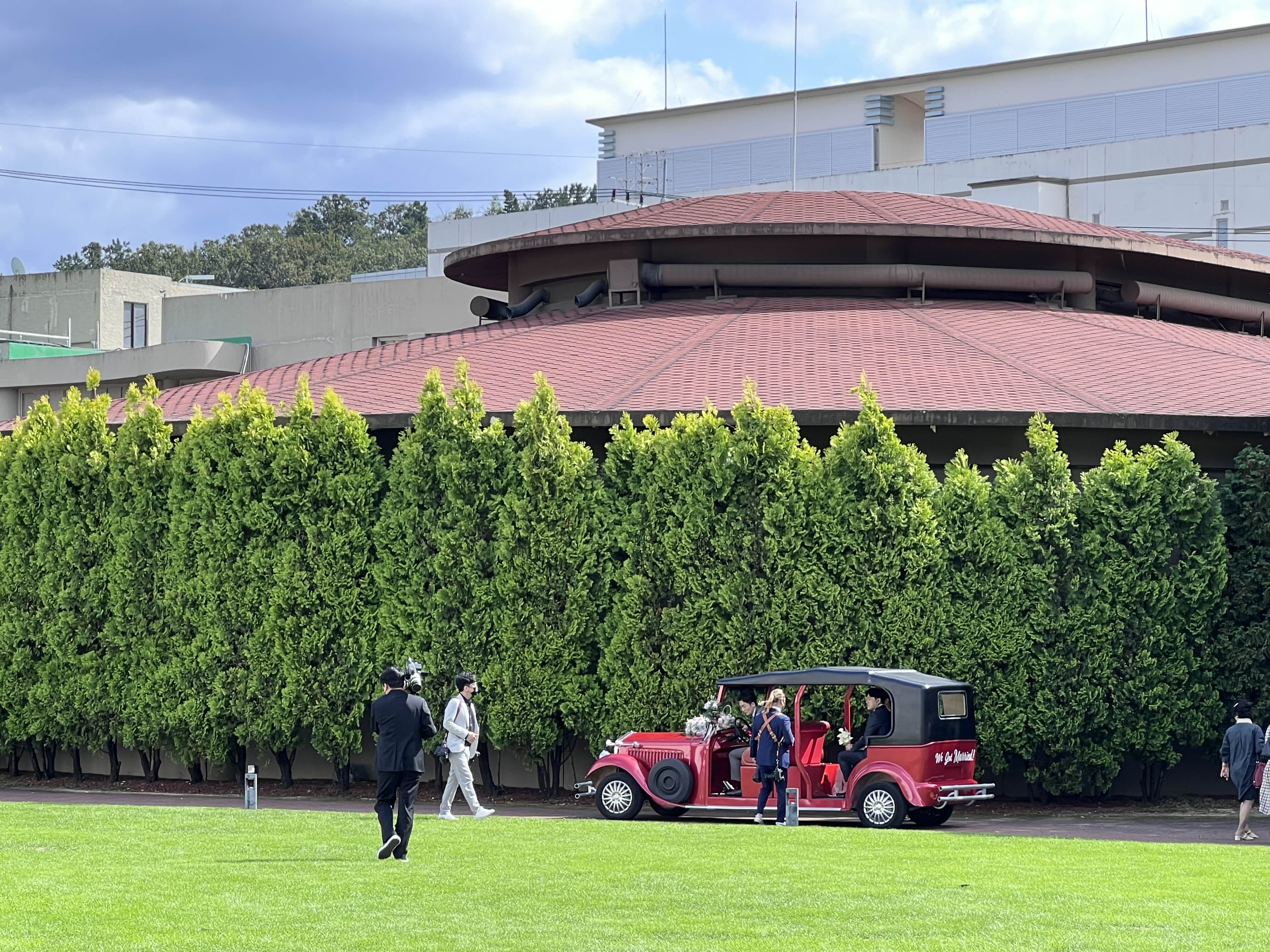 조금 일찍 도착해서 웨딩홀 구경도 하고 호텔구경도 조금 했는데, 예식 1시간 이전부터 신랑신부가 웨딩카(?)를 타고 들어옵니다. 빨간색 웨딩카가 준비되어 있어서 타고서 잔디밭 도로를 따라 나무가 우거진 곳에서 부터 사진과 영상을 찍더라고요. 역시 결혼은 가을에 해야 하는 것인지 이날 날씨가 정말 좋았어요.