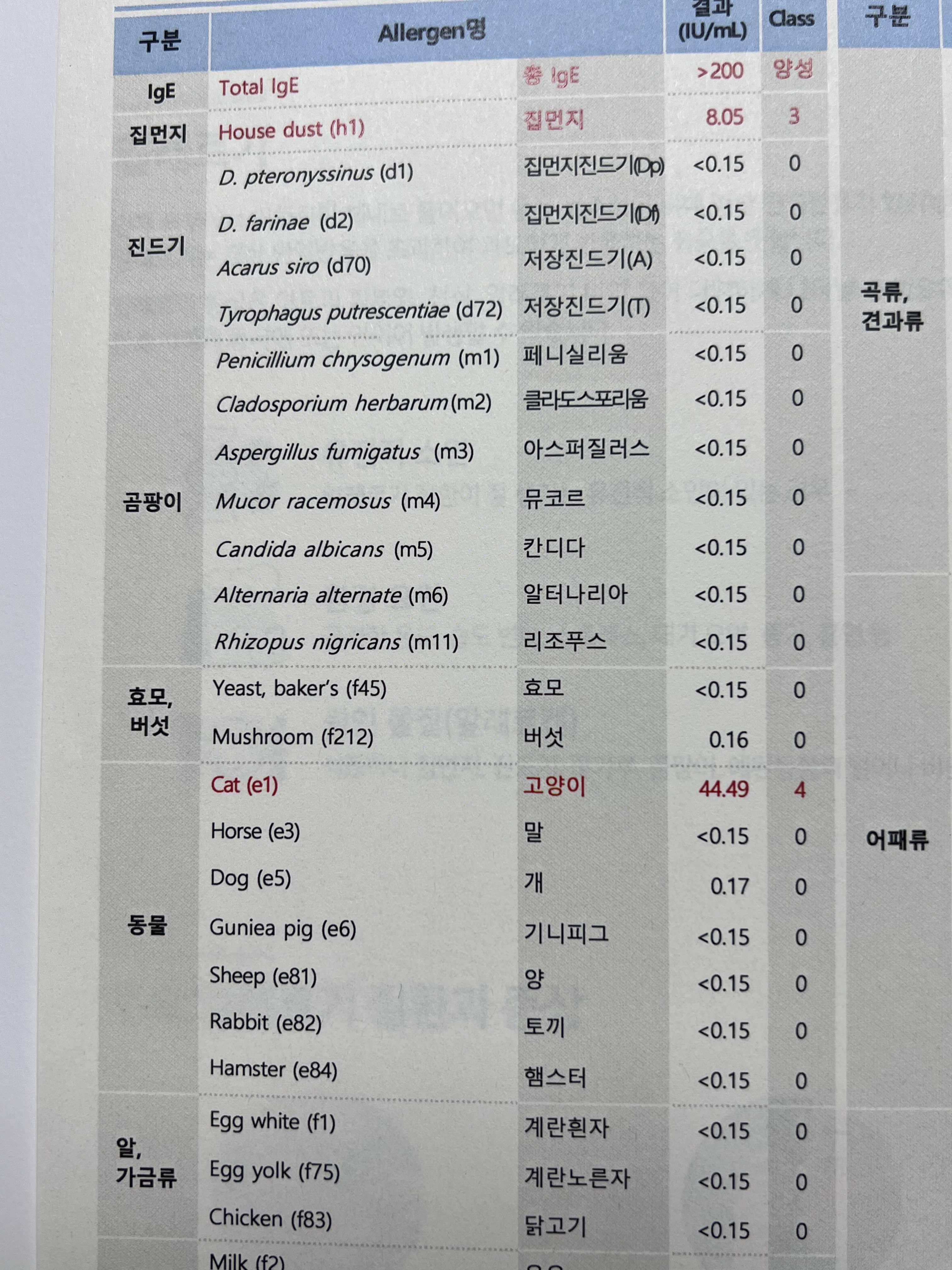 드디어 검사결과가 나왔습니다. 정도는 아래 표와 같습니다. 저는 집먼지는 3 정도의 수준이었고, 고양이는 4 정도로 나왔는데 수치는 거의 5에 가까운 수치였습니다. 고양이 알레르기가 심해서 조금 의아하긴 한데 믿어야 할지는 잘 모르겠습니다. 고양이를 만지거나 해도 크게 반응은 없는데 아무래도 털이나 분비물이 코점막에 와서 닿으면 반응을 일으키고 하나 봐요.